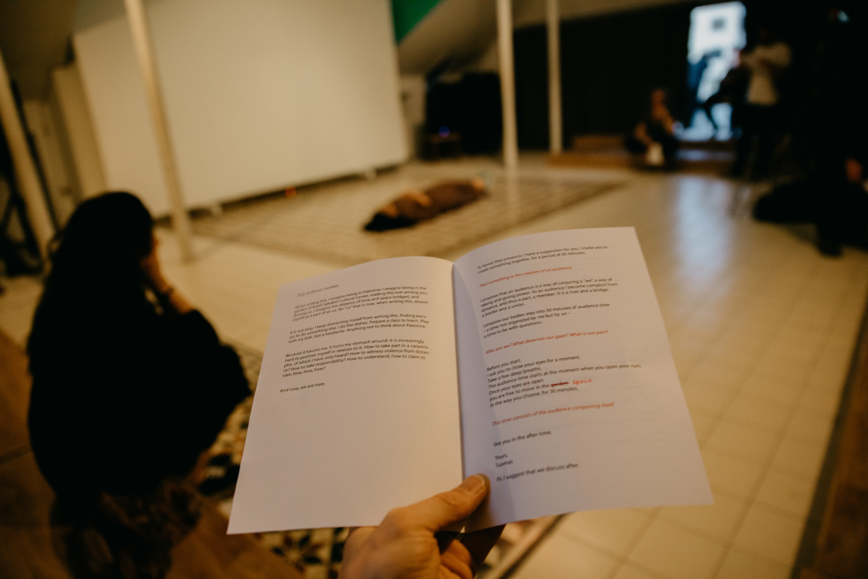 When writing this, I imagine being in Palestine. I imagine being in the garden of Kahlil Sakakini Cultural Center, reading this text among you. Among us. I imagine this distance of time and space bridged, and myself as a part of an us. An ”us” that is now, when writing this, absent.