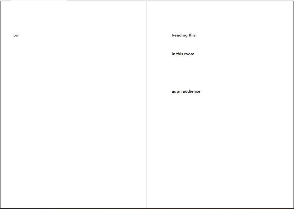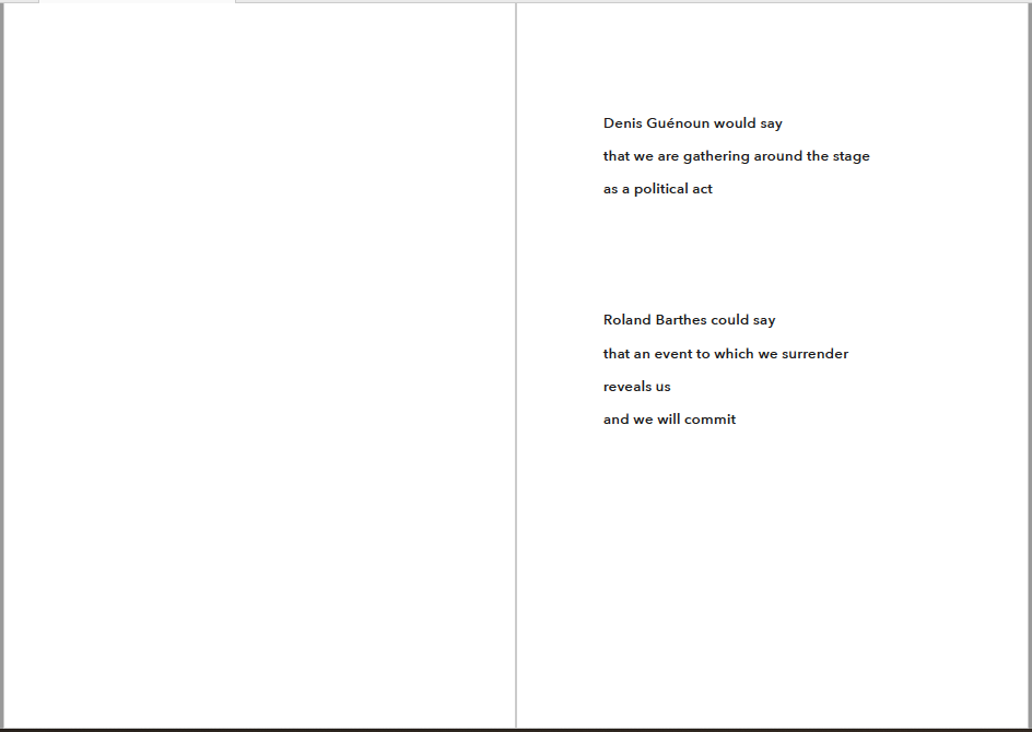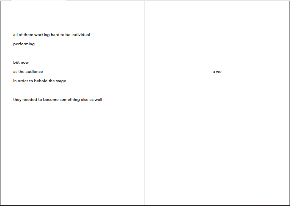 I propose that an audience is a way of conjuring a ”we”, a way of taking and giving power. As an audience I become complicit from distance, and thus a part, a member. It is a river and a bridge; a border and a union.