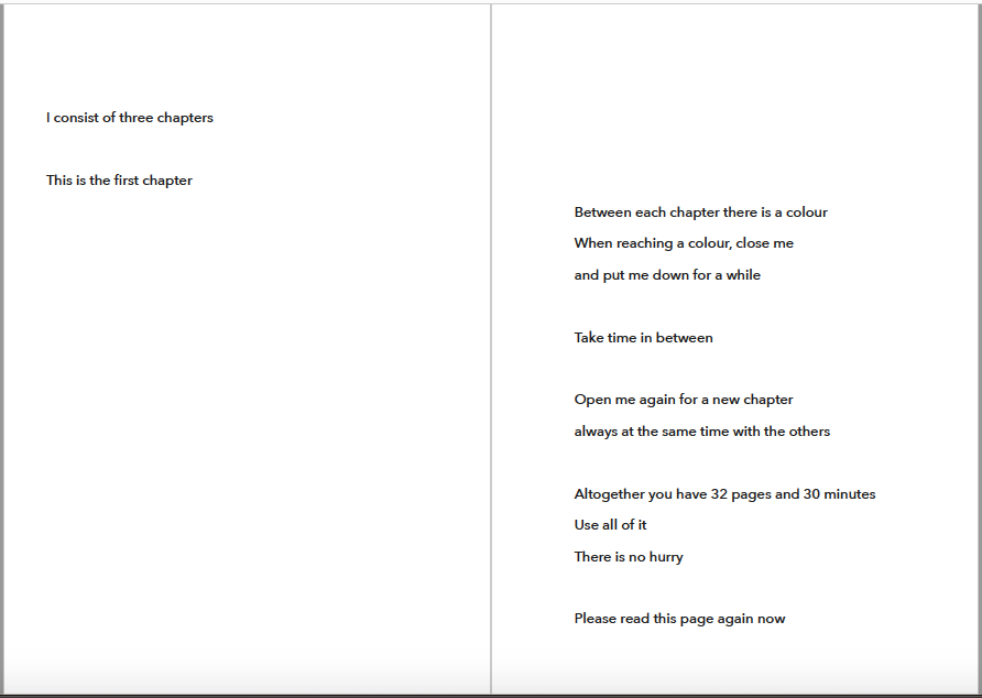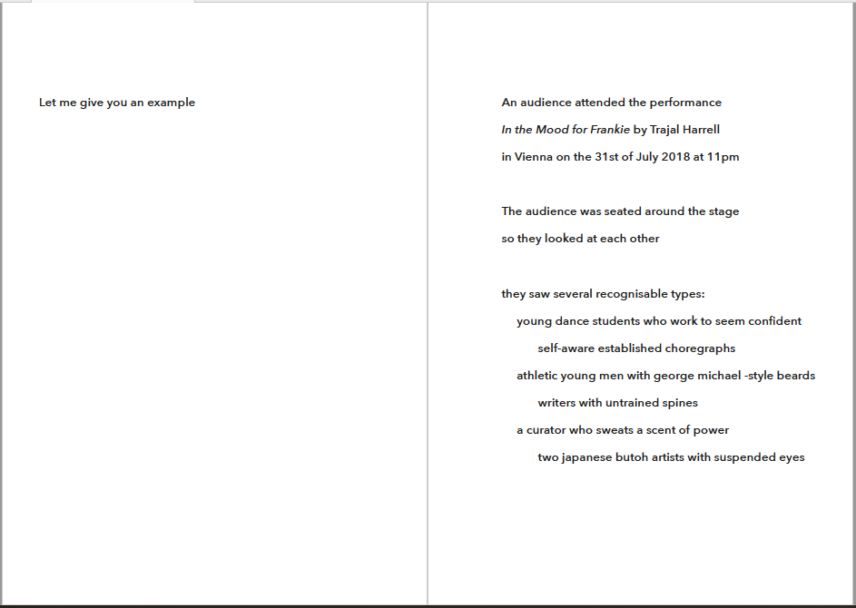 Näitä asioita en ymmärrä ja toivonkin, että käytätte näytökseen varatun ajan kysymysten ruumiilliseen pohdiskeluun. Tai käytämme - niin että myös minä olen osa tuota yleisöä. Siinä kaikki. Toivon, että ohjeistus riittää. Näytös kestää alle 30 minuuttia.