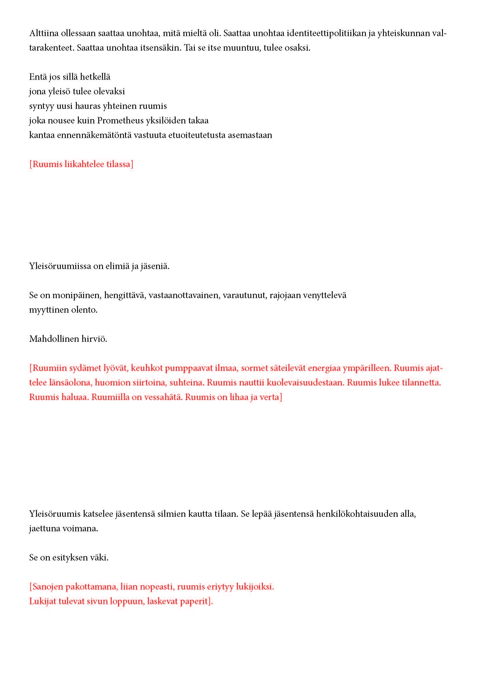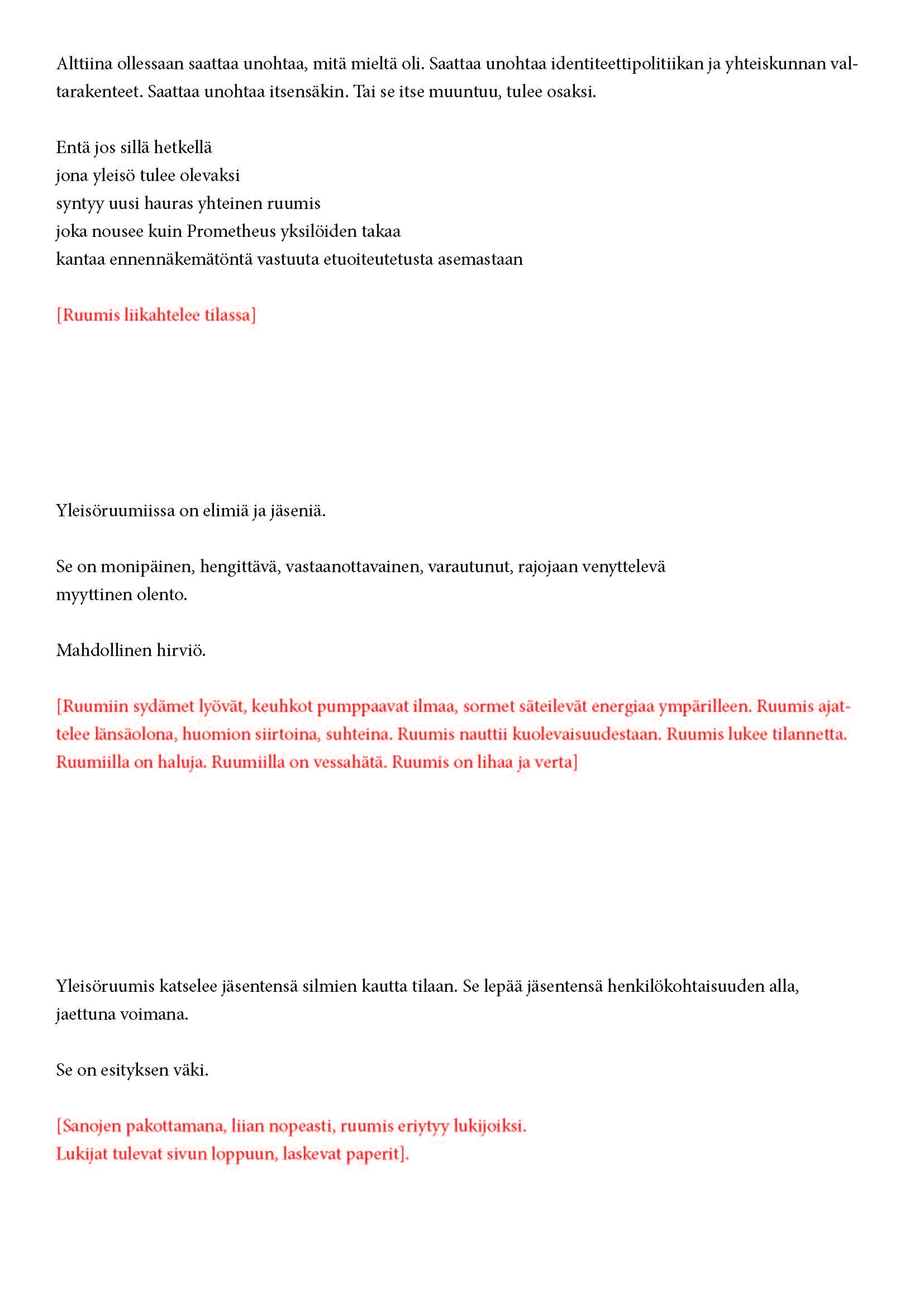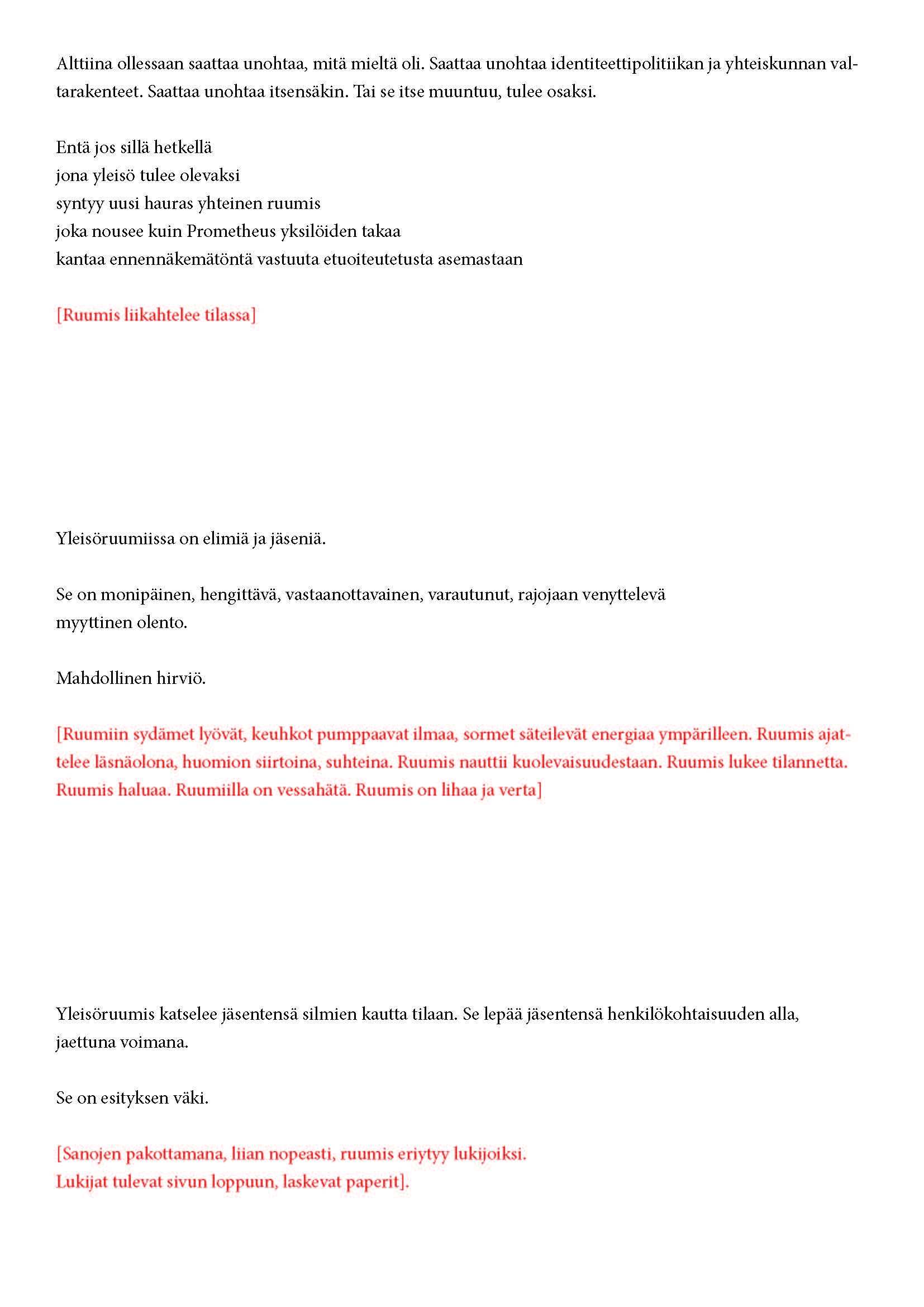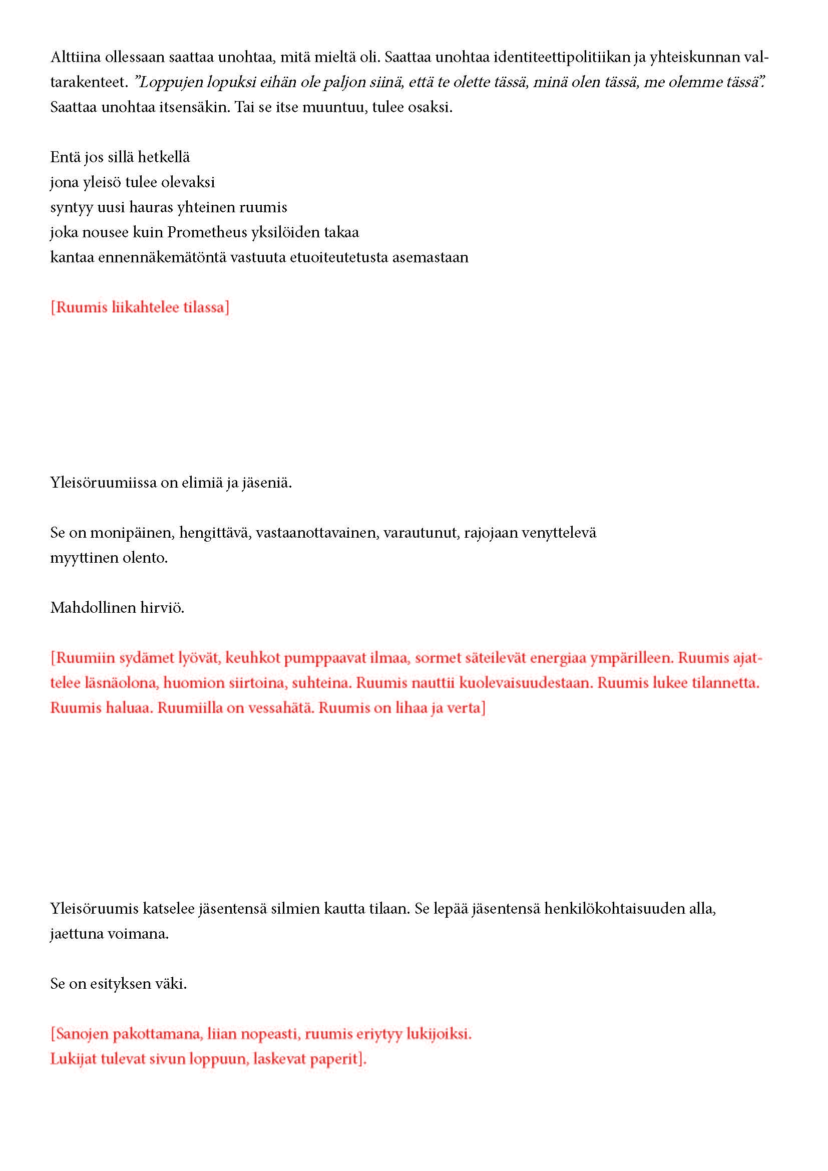 tuntuu? Miten olen yleisön osa? Miten olemme/olen tilassa? Miten toimimme/toimin? Miten olemme/olen suhteessa näyttämöön?