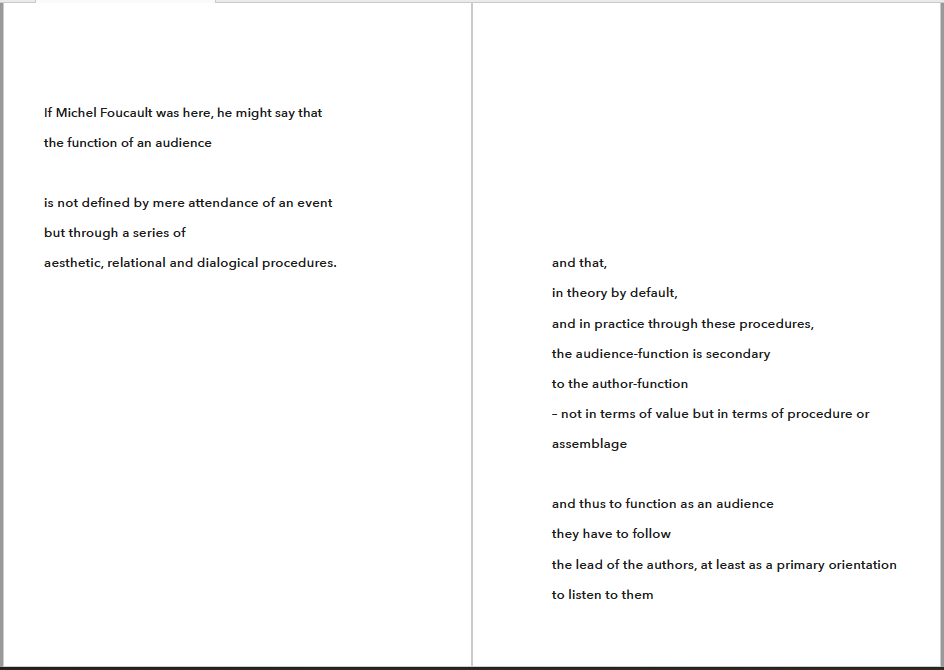 Anyway, I have a proposal for you. I am interested in the creation of an audience -- as a collectivity of some sort. I hope you could help me a bit with it. Actually, already when reading this, you and the others are creating a plural entity that, if consenting, takes the form of an audience.