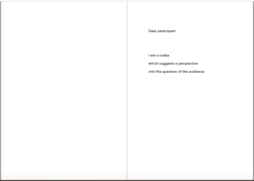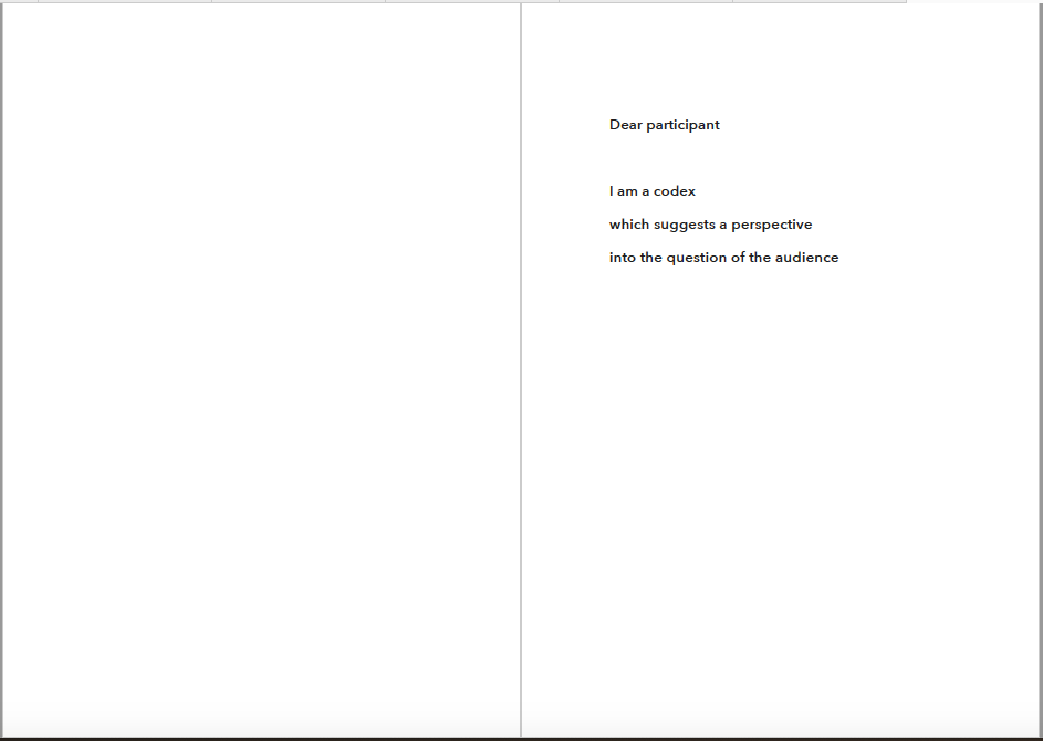 To set them free, I have a proposal for you. I am interested in the creation of an audience -- as a collectivity of some sort. I hope you could help me a bit with it. When reading this, you and the others are creating a plural entity that, if consenting, takes the form of an audience.