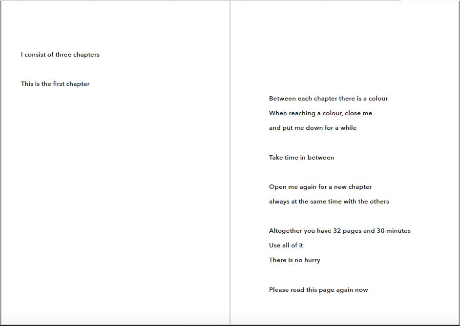 Ensimmäinen luonnos loi formaatin, jota olen käyttänyt kautta luonnossarjan: valmistin seminaarin osallistujille kirjallisen käsiohjelman, joka orientoi tapahtumaan. Tarkoituksenani oli esitellä tutkimustani metodologian näkökulmasta. Tämä ensimmäinen kokeilu poikkesi itse sarjasta sikäli, että en vielä ollut rajannut esiintyjäntyötä pois, ja teksti oli vain yksi osa koko presentaatiosta.