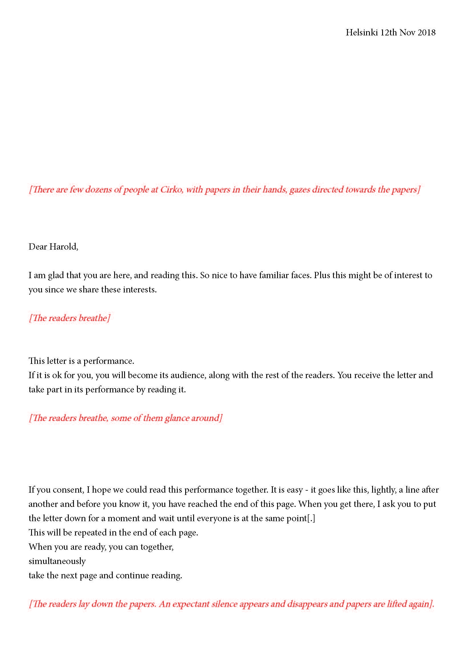 I ask you to follow the performance in the way you choose and then write on these pages something about what happened to