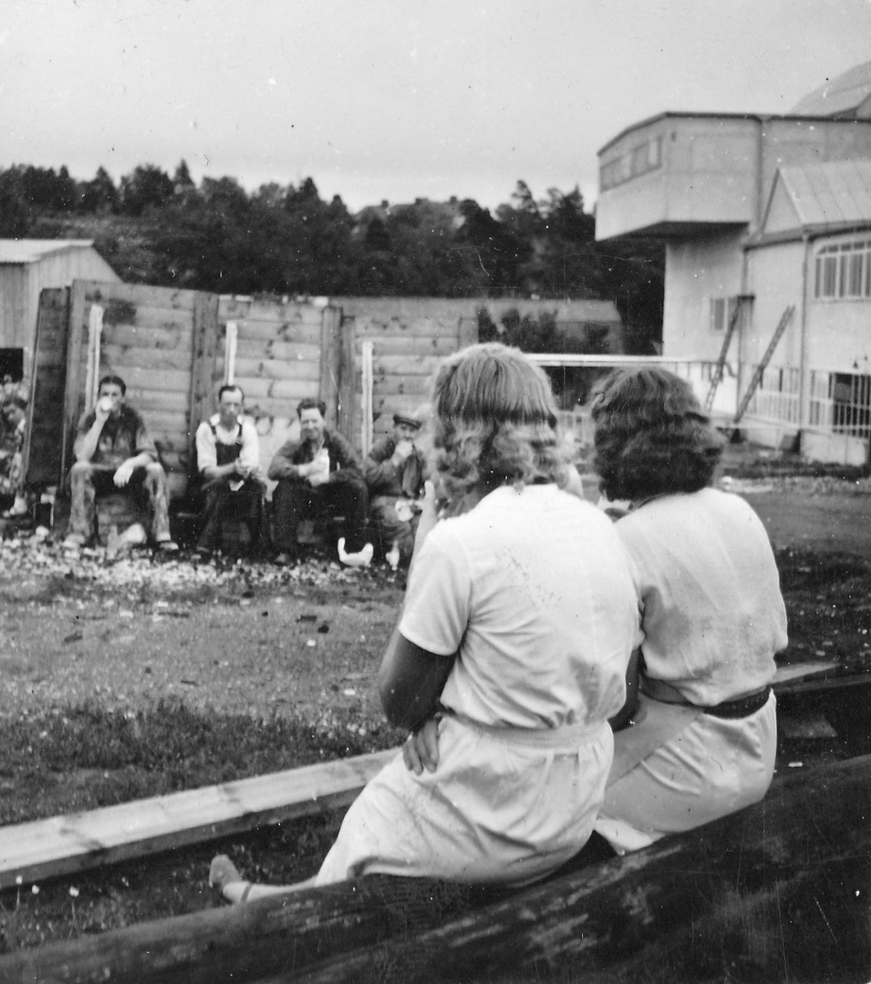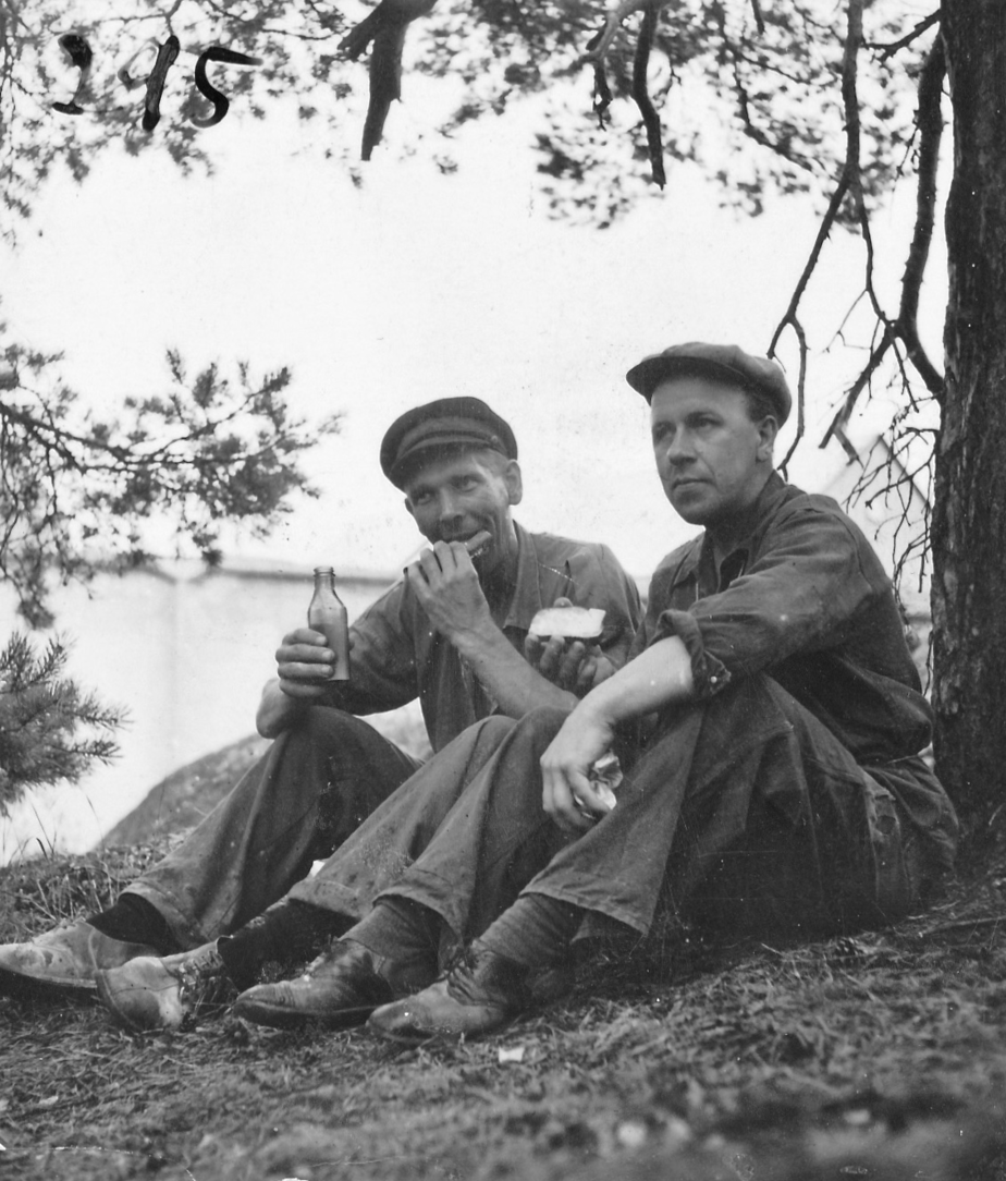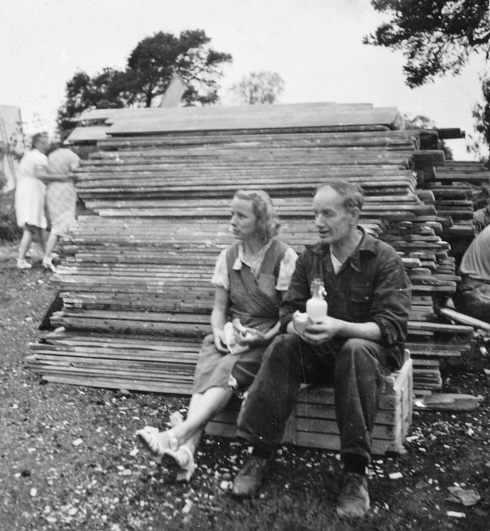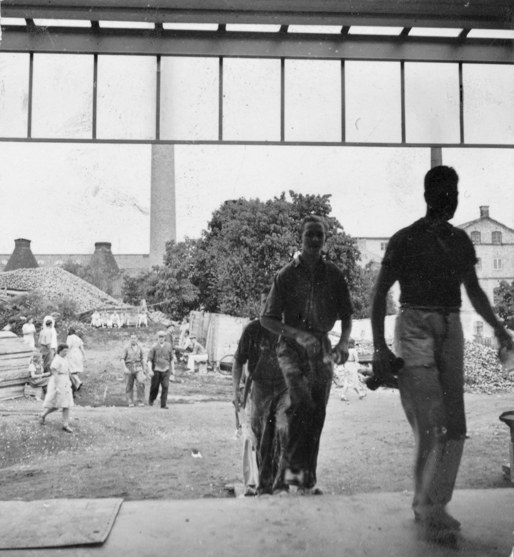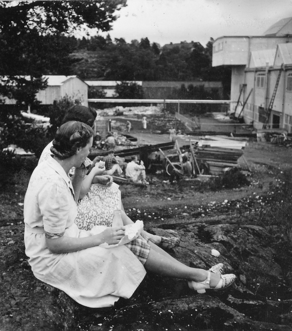 "Människor på rast. Två står och pratar. En har lerig arbetsoverall och cykel. Den andra kostym och något under armen, en rund meterlång träbit. Kanske en del till en båt? De verkar vara långt inne i ett samtal. Vardag, rast på en fabrik. På marken ligger högar av krossat porslin. En lång skorsten i bakgrunden. Är de bröder? Blir berörd av bilden. Den öppnar för allt det som inte är produktivitet i Gustavsberg och blir en ingång till att ta med bilder på människor under ledig tid i mitt urval från arkivet. Bilden löser ett problem. På en lång planka sitter en rad vitklädda män. Vitt damm på skor. De tittar rakt fram. Vilar. Bakom gruppen ett berg med runda stenar? Är det flinta? Som ska malas och blandas i flintgodsmassa? Brännas först? Det var väl ben också? Hur gjorde man? Flintgods. Benporslin. Två kvinnor går med armarna om varandra i 40-tals klänningar? En man och en kvinna sitter på en upp och nedvänd låda, nej en packkorg för porslin med ryggen mot en trave brädor. Eller är det brädor att ställa färdigt gods på? Tänker på fotografen. De verkar så ostörda. Röra sig runt mellan olika grupper med en kamera utan att ändra dynamiken på platsen. Uppfatta att det finns något att fotografera som pågår. Nästan ingen tittar in i kameran. En eller två. De flesta tittar långt bort. Ifred. Äter och dricker. I bakgrunden på varje bild syns någon av de andra grupperna, allt fotat vid samma tillfälle. Läser Roland Barthes ”Det ljusa rummet” (Alfabeta1986.) Funderar över hans begrepp Studium och Punktum. Om det är giltigt för mig med rastbilderna. Varför blir jag berörd av precis de här bilderna? Tror att det är bilderna tillsammans, utlagda bredvid varandra som visar ett slags berörande Punktum. Synliggjort är kanske ett vilande. Som får personerna att bli individer. En skymt av eget liv som inte utspelar sig i Fabriken. Identifierar mig kanske också med att äta lunch i arbetskläder. Som vi gör. Eller är det att de sätter sig ner där på backen, plankorna och bara äter och vilar, samtidigt, enkelt, med sina kroppar. Det visar sig långt senare att bilderna är fotade av Anna Riwkin. Ryskfödd judisk, fotograf född 1908. Verksam i Sverige och i världen. En utställning med hennes bilder på Moderna Museet 2004. Möjligen fotade hon för KF när det var ont om porträttjobb under kriget och fick syn på de som satt utanför och åt? Hon fick kritik av kollegor för att hon inte hade den bästa fotoutrustningen men sökte flexibla metoder. Det märks i bilderna att hon rör sig lätt runt på platsen, utan stora åthävor. Hittar anteckning ’Riwkin’ på ett av arken." ur Hur böjs arbete. Essä. I.A"