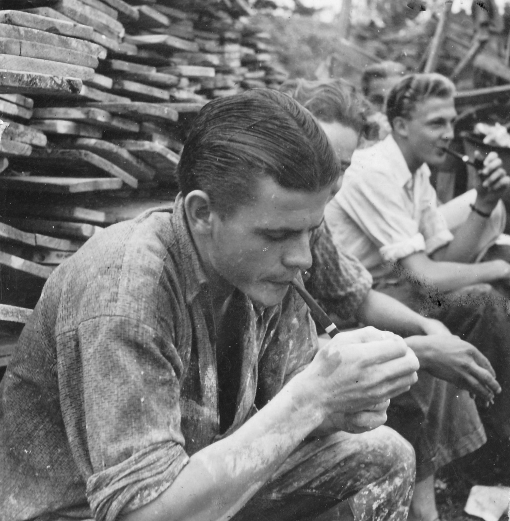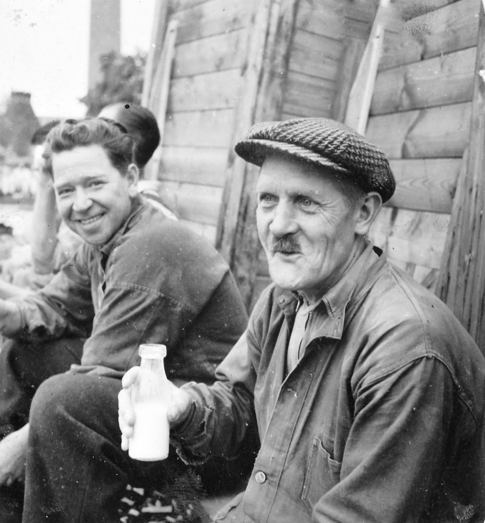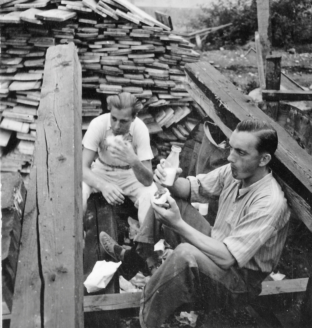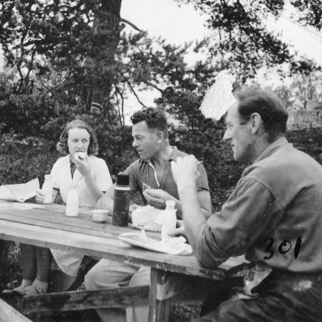 "Människor på rast. Två står och pratar. En har lerig arbetsoverall och cykel. Den andra kostym och något under armen, en rund meterlång träbit. Kanske en del till en båt? De verkar vara långt inne i ett samtal. Vardag, rast på en fabrik. På marken ligger högar av krossat porslin. En lång skorsten i bakgrunden. Är de bröder? Blir berörd av bilden. Den öppnar för allt det som inte är produktivitet i Gustavsberg och blir en ingång till att ta med bilder på människor under ledig tid i mitt urval från arkivet. Bilden löser ett problem. På en lång planka sitter en rad vitklädda män. Vitt damm på skor. De tittar rakt fram. Vilar. Bakom gruppen ett berg med runda stenar? Är det flinta? Som ska malas och blandas i flintgodsmassa? Brännas först? Det var väl ben också? Hur gjorde man? Flintgods. Benporslin. Två kvinnor går med armarna om varandra i 40-tals klänningar? En man och en kvinna sitter på en upp och nedvänd låda, nej en packkorg för porslin med ryggen mot en trave brädor. Eller är det brädor att ställa färdigt gods på? Tänker på fotografen. De verkar så ostörda. Röra sig runt mellan olika grupper med en kamera utan att ändra dynamiken på platsen. Uppfatta att det finns något att fotografera som pågår. Nästan ingen tittar in i kameran. En eller två. De flesta tittar långt bort. Ifred. Äter och dricker. I bakgrunden på varje bild syns någon av de andra grupperna, allt fotat vid samma tillfälle. Läser Roland Barthes ”Det ljusa rummet” (Alfabeta1986.) Funderar över hans begrepp Studium och Punktum. Om det är giltigt för mig med rastbilderna. Varför blir jag berörd av precis de här bilderna? Tror att det är bilderna tillsammans, utlagda bredvid varandra som visar ett slags berörande Punktum. Synliggjort är kanske ett vilande. Som får personerna att bli individer. En skymt av eget liv som inte utspelar sig i Fabriken. Identifierar mig kanske också med att äta lunch i arbetskläder. Som vi gör. Eller är det att de sätter sig ner där på backen, plankorna och bara äter och vilar, samtidigt, enkelt, med sina kroppar. Det visar sig långt senare att bilderna är fotade av Anna Riwkin. Ryskfödd judisk, fotograf född 1908. Verksam i Sverige och i världen. En utställning med hennes bilder på Moderna Museet 2004. Möjligen fotade hon för KF när det var ont om porträttjobb under kriget och fick syn på de som satt utanför och åt? Hon fick kritik av kollegor för att hon inte hade den bästa fotoutrustningen men sökte flexibla metoder. Det märks i bilderna att hon rör sig lätt runt på platsen, utan stora åthävor. Hittar anteckning ’Riwkin’ på ett av arken." ur Hur böjs arbete. Essä. I.A"