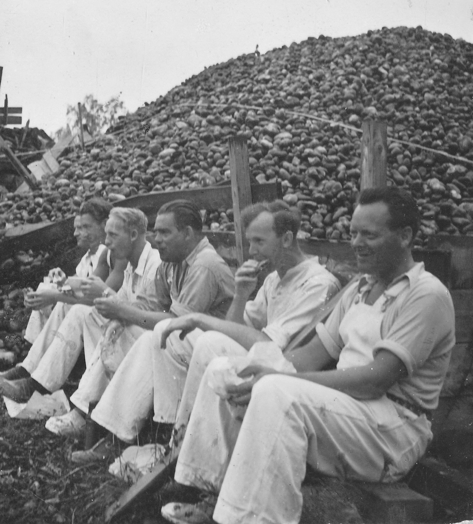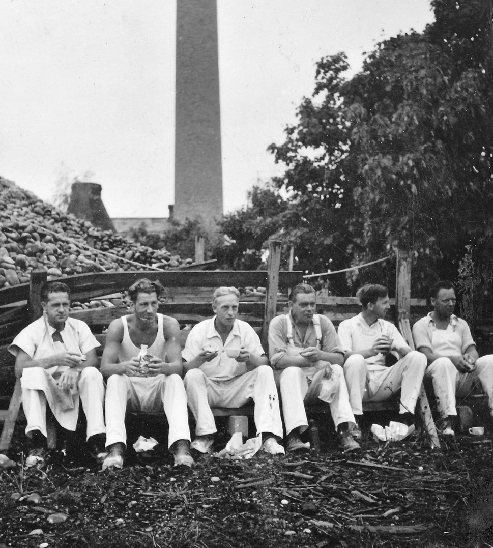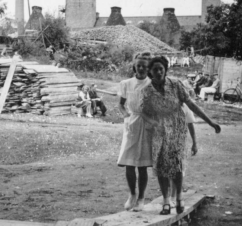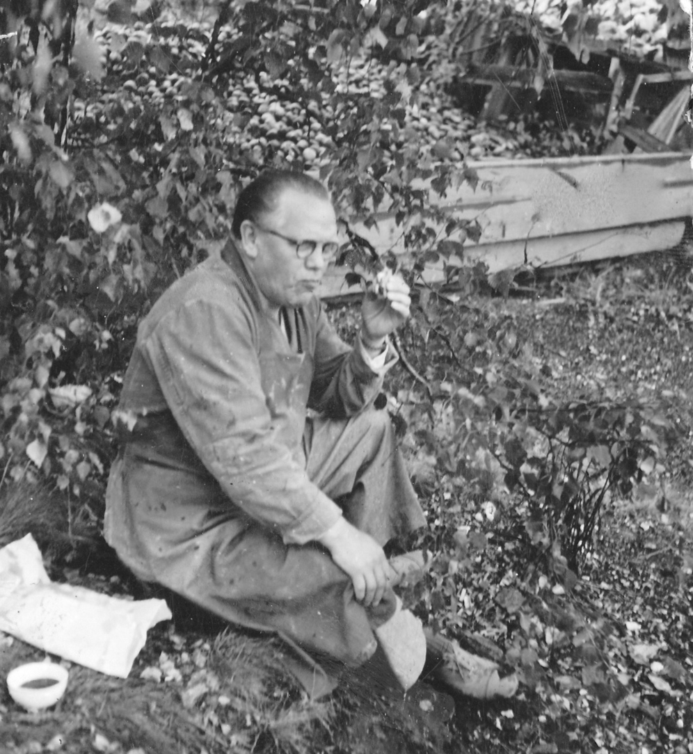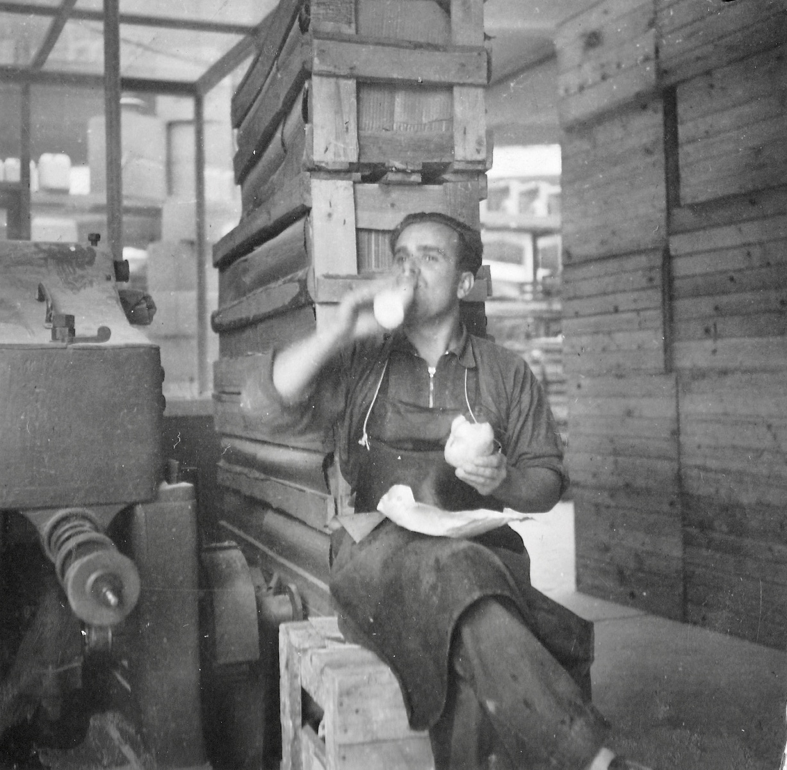 "Människor på rast. Två står och pratar. En har lerig arbetsoverall och cykel. Den andra kostym och något under armen, en rund meterlång träbit. Kanske en del till en båt? De verkar vara långt inne i ett samtal. Vardag, rast på en fabrik. På marken ligger högar av krossat porslin. En lång skorsten i bakgrunden. Är de bröder? Blir berörd av bilden. Den öppnar för allt det som inte är produktivitet i Gustavsberg och blir en ingång till att ta med bilder på människor under ledig tid i mitt urval från arkivet. Bilden löser ett problem. På en lång planka sitter en rad vitklädda män. Vitt damm på skor. De tittar rakt fram. Vilar. Bakom gruppen ett berg med runda stenar? Är det flinta? Som ska malas och blandas i flintgodsmassa? Brännas först? Det var väl ben också? Hur gjorde man? Flintgods. Benporslin. Två kvinnor går med armarna om varandra i 40-tals klänningar? En man och en kvinna sitter på en upp och nedvänd låda, nej en packkorg för porslin med ryggen mot en trave brädor. Eller är det brädor att ställa färdigt gods på? Tänker på fotografen. De verkar så ostörda. Röra sig runt mellan olika grupper med en kamera utan att ändra dynamiken på platsen. Uppfatta att det finns något att fotografera som pågår. Nästan ingen tittar in i kameran. En eller två. De flesta tittar långt bort. Ifred. Äter och dricker. I bakgrunden på varje bild syns någon av de andra grupperna, allt fotat vid samma tillfälle. Läser Roland Barthes ”Det ljusa rummet” (Alfabeta1986.) Funderar över hans begrepp Studium och Punktum. Om det är giltigt för mig med rastbilderna. Varför blir jag berörd av precis de här bilderna? Tror att det är bilderna tillsammans, utlagda bredvid varandra som visar ett slags berörande Punktum. Synliggjort är kanske ett vilande. Som får personerna att bli individer. En skymt av eget liv som inte utspelar sig i Fabriken. Identifierar mig kanske också med att äta lunch i arbetskläder. Som vi gör. Eller är det att de sätter sig ner där på backen, plankorna och bara äter och vilar, samtidigt, enkelt, med sina kroppar. Det visar sig långt senare att bilderna är fotade av Anna Riwkin. Ryskfödd judisk, fotograf född 1908. Verksam i Sverige och i världen. En utställning med hennes bilder på Moderna Museet 2004. Möjligen fotade hon för KF när det var ont om porträttjobb under kriget och fick syn på de som satt utanför och åt? Hon fick kritik av kollegor för att hon inte hade den bästa fotoutrustningen men sökte flexibla metoder. Det märks i bilderna att hon rör sig lätt runt på platsen, utan stora åthävor. Hittar anteckning ’Riwkin’ på ett av arken." ur Hur böjs arbete. Essä. I.A"