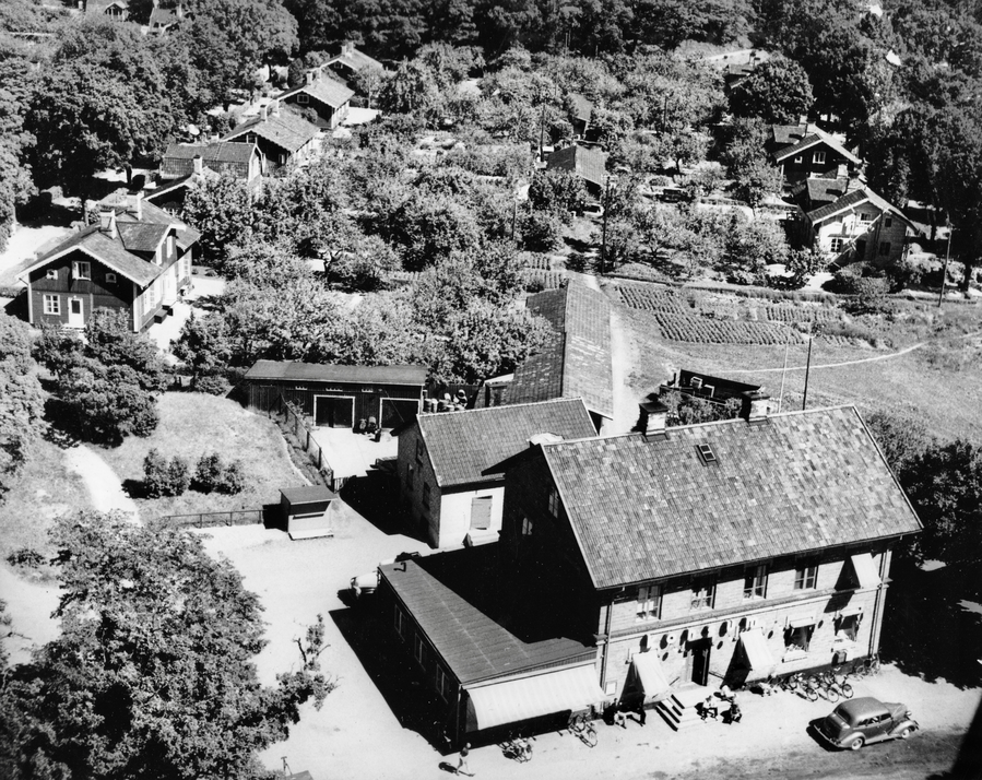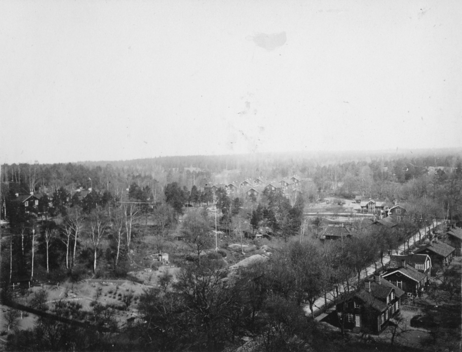 En person klättrade 1918 upp i kyrktornet på Gustavsbergs kyrka och fotograferade åt olika håll.