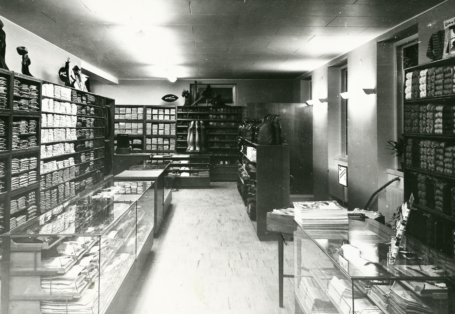 Sortimentet på övervåningen på butik Konsumettan nuvarande Kyrkettan mitt i bild på vykort t.v