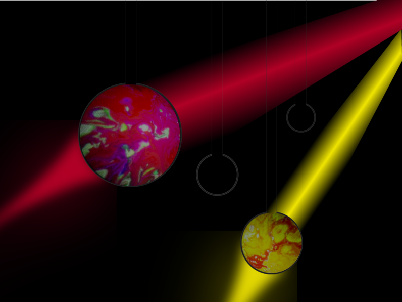 After that, a kind of slow sound by a Theremin begins. The LEDs go dark. Several beamers start to shine pictures on the balls. Some balls have a milky mixture on the inside, which means that the projections can be seen on the ball, other balls are filled with clear water, which focused the light at the end of the ball and vice versa. (I need smoke in the room to see it). It's a zoom out into the complete universe.