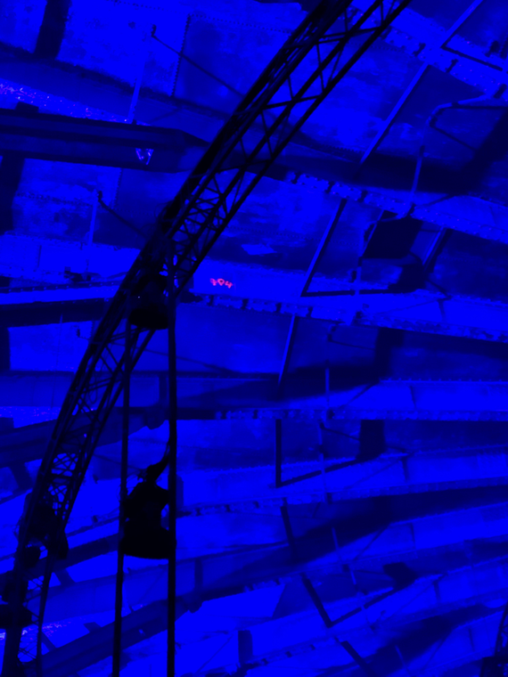 The light emitted by the ring changes during the performance, in colour and in solidity, occasionally pulsing and flashing. At times the effect of the light seems to turn the ring into a solid disc, floating and rotating in space or a portal into another world. This ethereal quality is heightened still further by the rich and atmospheric soundscape created by producer Huerco S. inspired by the harmonic resonances of colours. Live singing by soprano Brigitte van Hagen completes the installation.