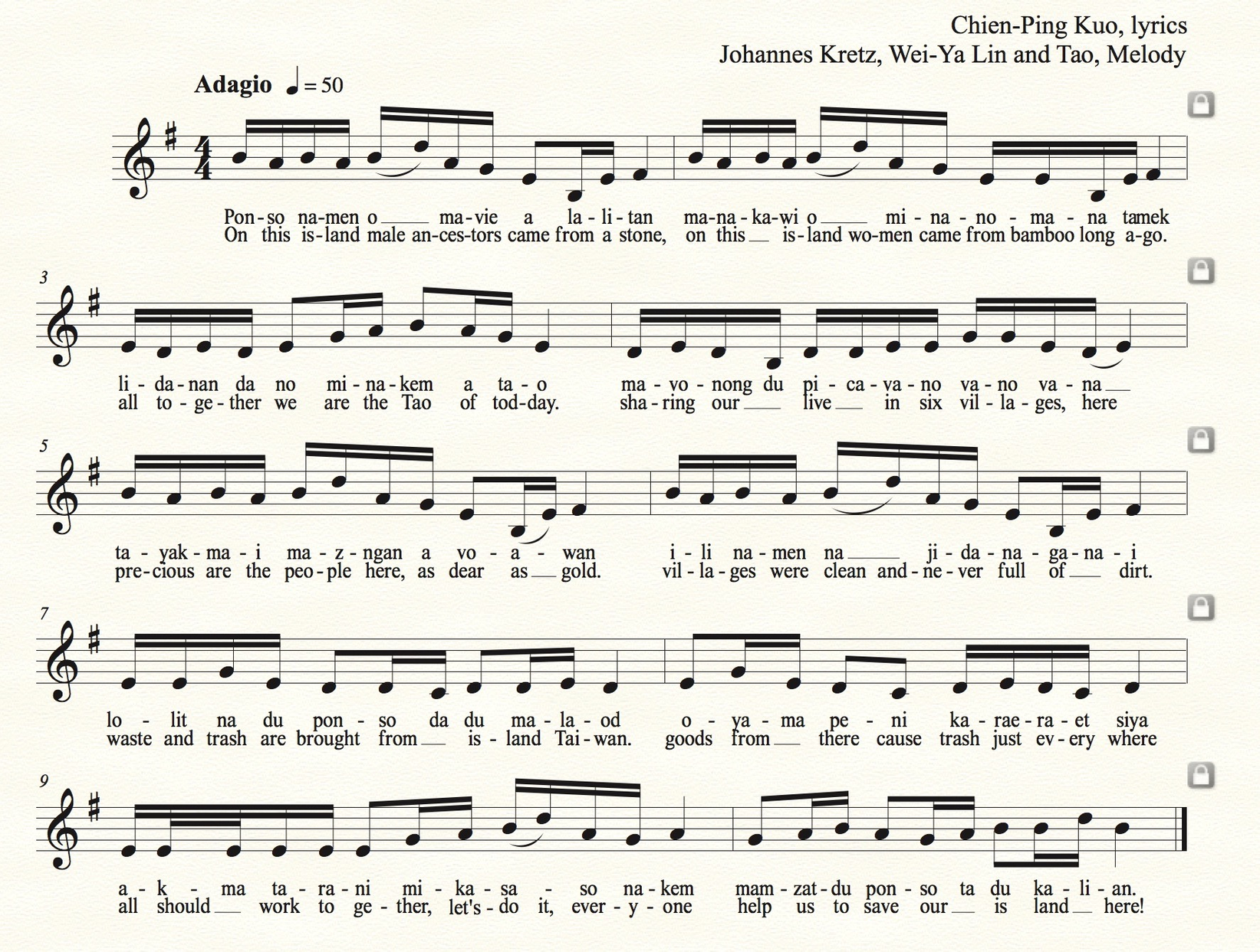 On this island male ancestors came from a stone, on this island women came from bamboo long ago. all together we are the Tao of today. sharing our live in six villages here, precious are the people here, as dear as gold. villages were clean and never full of dirt. Waste and trash are brought from island of Taiwan. Goods from there cause trash just everywhere, all should work together, let's do it, everyone! help us to save our island here!