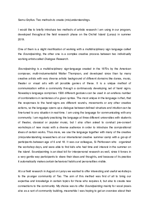 This project aims to develop transcultural approaches of inspiration (which we regard as mutually appreciated intentional and reciprocal artistic influence based on solidarity) by combining approaches from contemporary music composition and improvisation with ethnomusicological and sociological research. We encourage creative (mis)understandings emerging from the interaction between research and artistic practice, and between European art music, folk and non-western styles, in particular from indigenous minorities in Taiwan. Both comprehension and incomprehension yield serendipity and inspiration for new research questions, innovative artistic creation, and applied follow-ups among non-western communities. The project departs from two premises: first, that contemporary western art music as a practice often tends to resort to certain degrees of elitism; and second, that non-western musical knowledge is often either ignored or merely exploited when it comes to compositional inspiration. We do not regard inspiration as unidirectional, an “input” like recording or downloading material for artistic use. Instead, we foster artistic interaction by promoting dialogical and distributed knowledge production in musical encounters. Developing interdisciplinary and transcultural methodologies of musical creation will contribute on the one hand towards opening up the—rightly or wrongly supposed—“ivory tower of contemporary composition”, and on the other hand will contribute towards the recognition of the artistic value of non-western musical practices. By highlighting the reciprocal nature of inspiration, creative (mis)understandings will result in socially relevant and innovative methodologies for creating and disseminating music with meaning. The methods applied in the proposed project will start out from ethnographic evidence that people living in non-western or traditional societies often use methods of knowledge production within the sonic domain which are commonly unaddressed or even unknown among western contemporary music composers (aside from exotist or orientalistic appropriations of “the other”). The project is designed in four stages: field research and interaction with indigenous communities in Taiwan with a focus on the Tao people on Lanyu Island, collaborative workshops in Vienna, an artistic research and training phase with invited indigenous Taiwanese coaches in Vienna, and feeding back to the field in Taiwan. During all these stages, exchange and coordination between composers, music makers, scholars and source community experts will be essential in order to reflect not only on the creative process, but also to analyse and support strong interaction between creation and society. Re-interaction with source communities as well as audience participation in the widest sense will help to increase the social relevance of the artistic results. The University of Music and Performing Arts Vienna (MDW) will host the project. The contributors are Johannes Kretz (project leader) and Wei-Ya Lin (project co-leader, senior investigator) with their team of seven composers, ten artistic research partners from Taiwan and six artistic and academic consultants with extensive experience in the relevant fields.