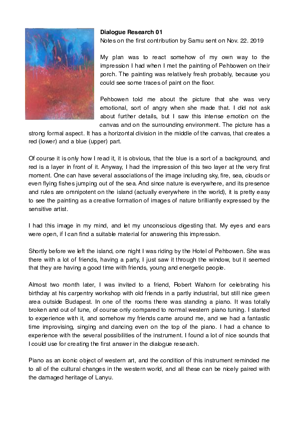 is a format of artistic research between two participants of the Creative (Mis)Understandings. It was initiated by Samu Gryllus during the second week of the field research period of the project on Lanyu, upon first exploring a painting of Si Pehbowen.