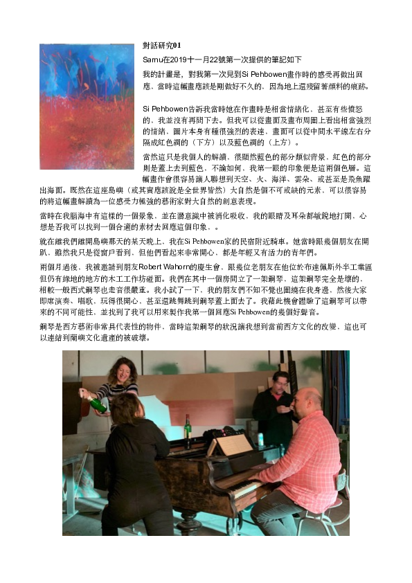 對話研究是兩位Creative (Mis)Understandings研究計畫成員之間正在進行的一個藝術研究模式,由Samu Gryllus在蘭嶼田野調查的第二個禮拜所提出,當時他正在第一次探討Si Pehbowen的繪畫作品。