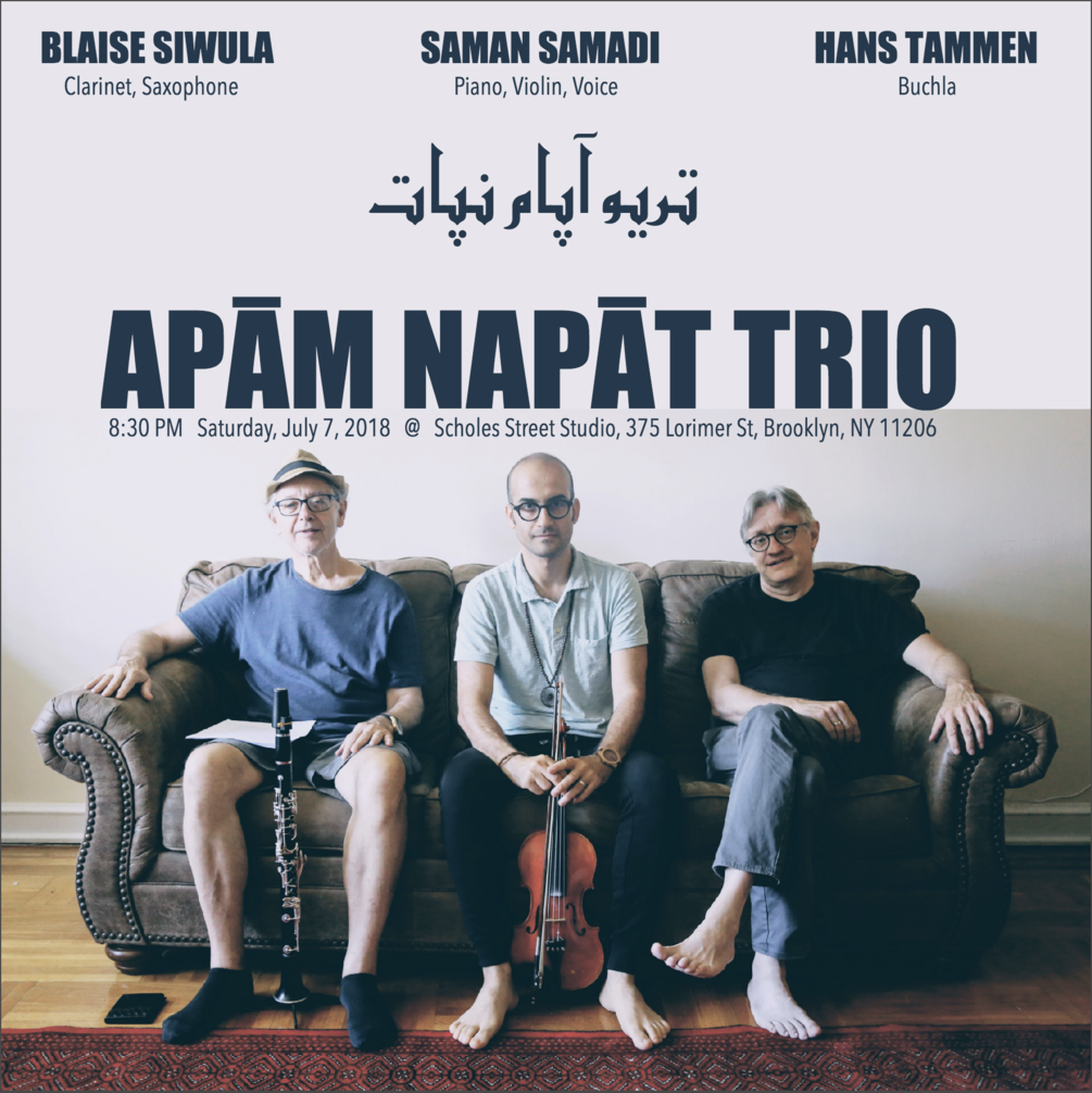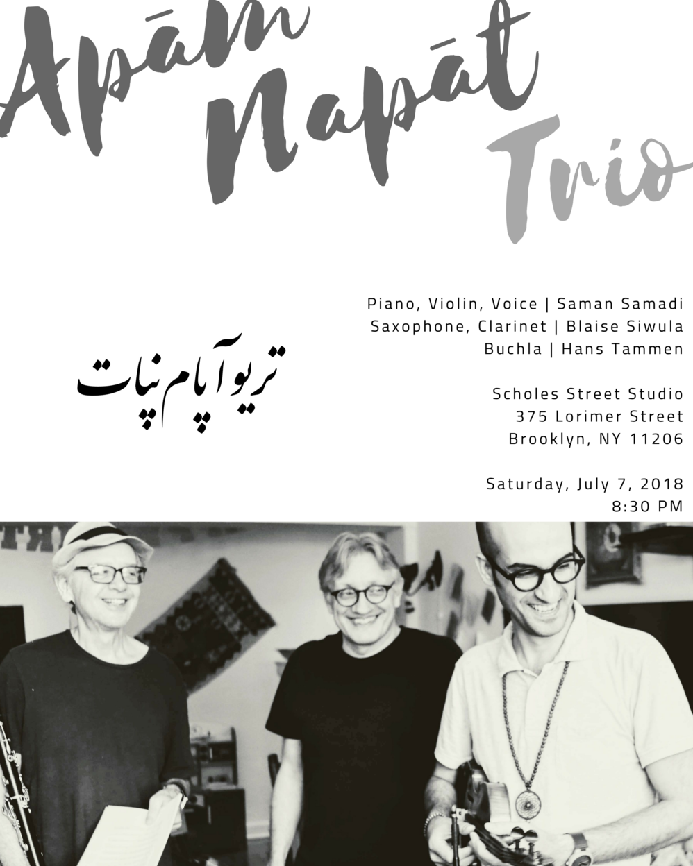 Apām Napāt (آپام نپات) is an NYC-based trio founded by Persian pianist, violinist, and vocalist Saman Samadi, in collaboration with clarinetist and saxophonist Blaise Siwula, and Buchla-player Hans Tammen. The ensemble presents improvisational compositions that draw connections between their musical backgrounds. Using Persian modes and poems as well as a structured and recognizable yet free impulsive interaction between the instruments, they set parallel narratives in motion, occasionally intersecting but always accompanying one another. The trio released an album called "Apām Napāt" consisting of the recordings of their first performance, in 2016.