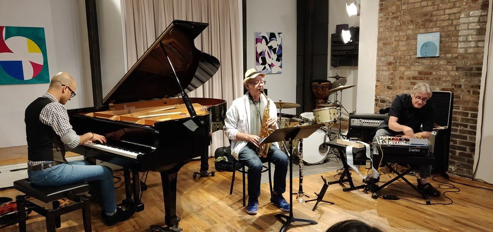 '18. Āpām Napāt Trio. At Scholes Studio. Concert. Saman Samadi, pianist, vocalist, violinist, and Blaise Siwula, clarinet, and Hans Tammen, Buchla player. Scholes Street Studio, Brooklyn, July 7, 2018.
