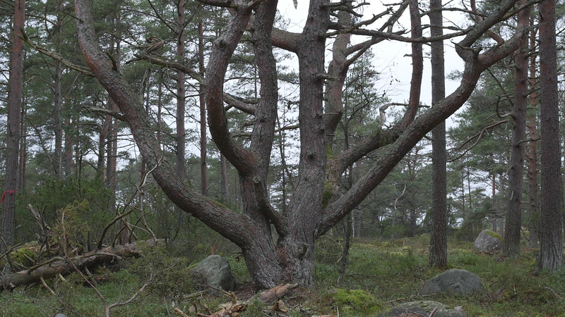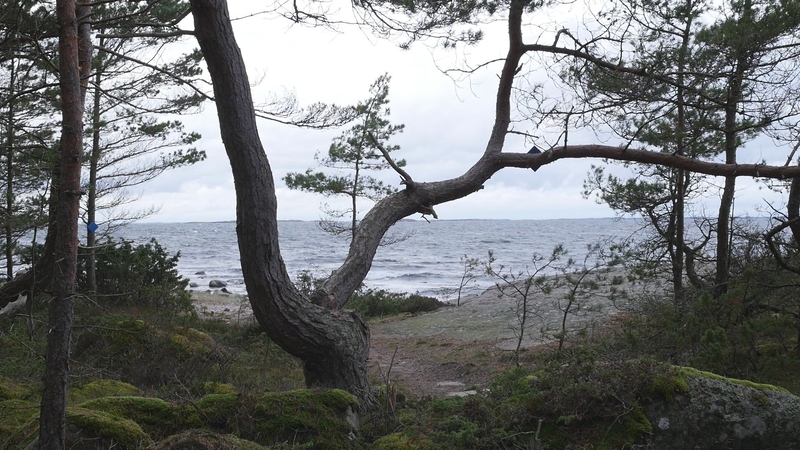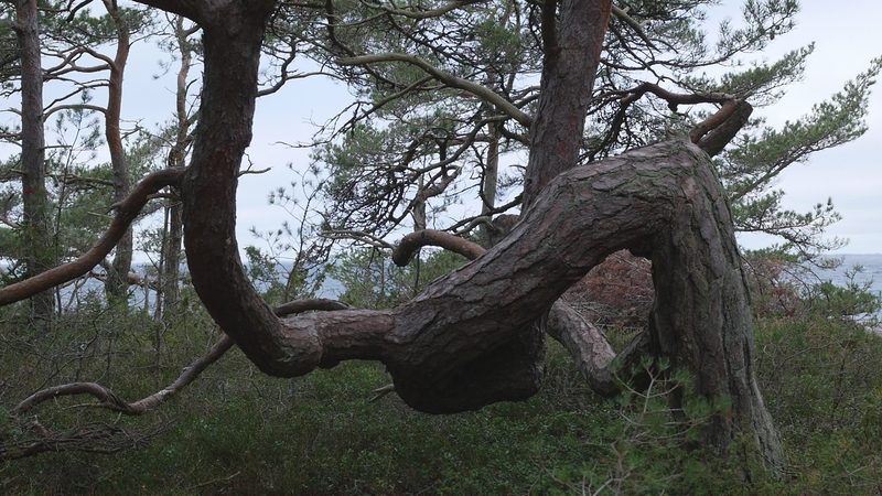 Kära tall, jag har gått förbi dig så många gånger, oftast om morgonen, att jag tyckte det var viktigt att komma och hälsa på dig ordentligt innan jag reser bort. Du, eller ni, för egentligen är det nog två separata träd som växer från samma plats men inte en gemensam rot, förmodar jag, för era stammar är inte sammanvuxna, så ja, ni är böjda som en perfekt liten bänk att sitta på intill stigen, och det ser ut som om en och annan mänskobesökare faktiskt suttit här, åtminstone tidigare på hösten. Dessutom har den ena av er, den som böjer sig över stigen, den jag inte sitter på, utan har framför mina fötter, en blå kvadrat spikad på sig för att markera vandringsstigen. Jag undrar om det är plågsamt att ha den fastspikad så där brutalt? Men å andra sidan tycks inte barken ha tagit skada, och ingen kåda har runnit kring spikarna. Kanske naturvårdarna vet vad de gör, det kan man ju hoppas för det är väl de som satt upp märkena. – Idag är det blåsigt, och det är faktiskt ganska kallt att sitta här på stranden med vinden rakt på, men om man betänker att det är december, alltså mitt i vintern, så är det ju inte ens minusgrader. Så har det blivit med vintrarna nu, ojoj! Eller kanske vintrarna alltid har varit rätt milda på Örö, för vi är ju rätt långt söderut, och ute till havs. Jag undrar hur det kommer sig att ni vuxit på det här sättet, böjda bort från varandra. Kanske det har funnits grenar som kapats av eller bara brustit av någon orsak. Den vridna formen är egentligen vacker, och bekväm att sitta på, faktiskt. Men det känns ändå konstigt att utnyttja era ”missbildningar”, om man skall säga som det är. Fast missbildning låter nog helt fel, för formerna är vackra, snarare ornament eller dekorationer. Jag vill inte vara oförskämd eller oartig, och absolut inte såra dig, ja er, utan bara tala om sakerna som de är, kalla dem för deras rätta namn. Men nej, nu är jag dum – vem bestämmer vad som är det rätta namnet på en förvriden gren, som lika gärna kunde kallas böjd och betagande. Bonsai-tallarna formas ju med flit till att böja sig åt olika håll. Men ni har valt att växa såhär självmant, förmodar jag? Oberoende av så tycker jag att ni är vackra och inbjudande här vid stigen, och det var därför jag ville sätta mig här en stund. Så förlåt att jag började tramsa om deformationer och liknande. Min avsikt var att visa min uppskattning, men det blev helt fel. Tack i alla fall för ert tålamod med min klumpighet, och tack för att jag fick sitta här en stund. Jag önskar er allt gott i fortsättningen, och en fridfull vinter här på stranden. Tack!