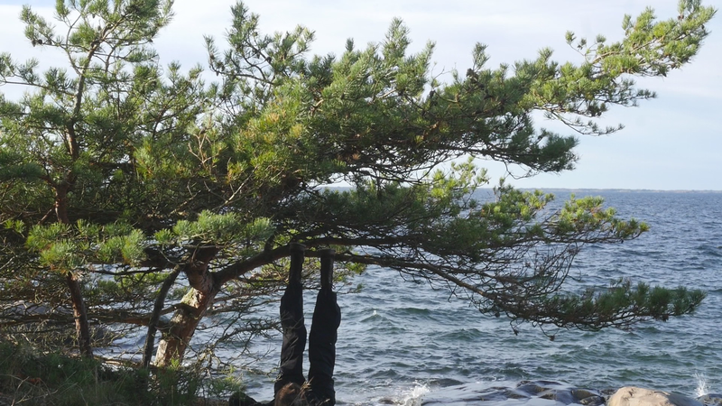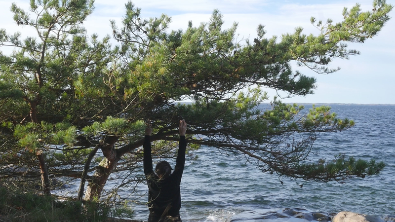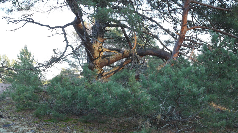 I turn to you in Swedish, because it feels like the most natural alternative here in the outer archipelago, although you probably hear at least as much Finnish and why not other languages, too, especially during the summer months. There has been some forestry work around you, many pine trees have been felled and it is great that you have been spared, probably thanks to your interesting form. You are really an ideal climbing tree for children that might come by, and why not adults, too. However, I am probably one of the oldest who have climbed up on this branch of yours. I am not an expert in tree climbing, and not especially daring either, but your branches seem so inviting, they form almost like a ladder to climb up with. It is really a bit too cold to sit and write with bare hands; luckily the wood protects against the wind that you can here in the noise from the seashore. By the way, I hope I am not disturbing you autumn rest, when I simply thrust myself up without any greetings or ceremonies of welcome. Clumsy, sure, but that is how I often behave with humans as well. Actually, I would prefer to simply sit here and breath in the wind together with you, but writing keeps me warm, however absurd it sounds. And I want to try to address you in some way and tell you how nice you are, elegant and exciting in your flame-like form. Actually, many of your branches are dead, or at least they lack needles and cones; only high up in your crown you are green and healthy. There is a lot of moss and lichen growing on your trunk and it is probably full of all kinds of small bugs, too. I join those small bugs that feed on you, even though I guess I am a “big bug”, at least regarding my weight. No, that was not very funny, sorry for that. But your lower branches are really very strong; I cannot feel the least swaying under my weight. Although I think I am not causing you any suffering or trouble it is becoming too cold for me to sit here in the wind. So, I say thank you for me and wish you all the best for the future. Thank you for letting me sit here and farewell. Yours AA