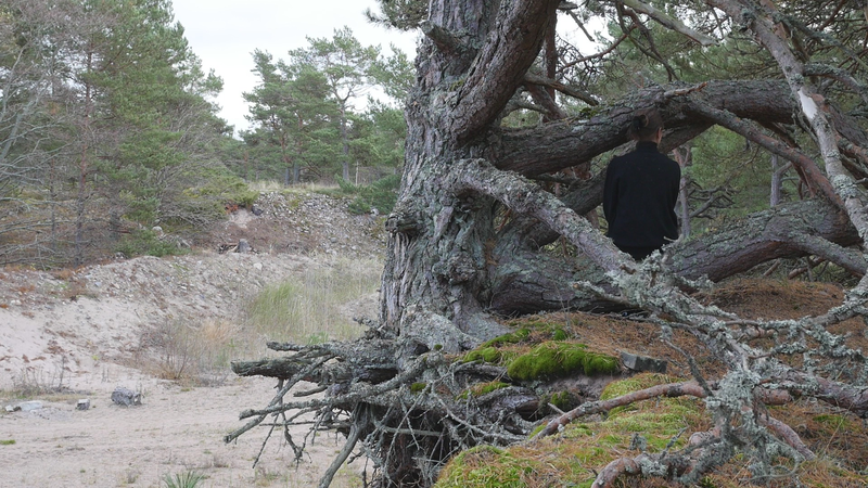Excuse me for disturbing you this November afternoon and please forgive me for recording this meeting with a video camera. I am very grateful for having the opportunity to spend time with you on this island, which was previously reserved for the military only, and has been transformed into a national park and opened to the public only five years ago. And I am grateful to you for allowing me to sit on your branch and to appearing or performing together with me for this brief moment. I also have to apologize for addressing you in English, which is not my native language, nor your preferred language, I assume. What your preferred language would be I do not even dare guess, something with (volatile) chemicals, perhaps. The reason for this formal address is that I hope this letter to reach other humans and not only you, that is, humans will hear or probably read this letter as an example of my practice of writing letters to trees, and also as a “meta-letter” of sorts, since my aim is to consider this practice in terms of its ethical and artistic implications, at least I will try to do that. Meanwhile, I also hope that these thoughts will somehow reach you, if not through these words, then through my thoughts. And even though you might not be able to read my thoughts in a strict sense, I hope you will be able to sense my intentions, somehow, and to affirm [ascertain] that they are benign and respectful. Anyway, I hope you are well this lovely afternoon, which is truly exceptional by being completely still. I have only spent little more than a week on this island, and so far, the wind has been heavy [strong] day in and day out. You have spent all your life here, so you should know. Many of your relatives are bent in all kinds of strange contortions due to the wind, being broken in storms and then growing from what was left; remarkable bravery, I must say. You too, have a rather precarious position next to the sand [pit], with half of your roots, or what is left of them, right in mid-air. The branches that I sit on have reached far out on the slope to counterbalance that, I suppose. I came here before, last week, as you might remember, and tried to pose with your roots, creating a small video that I call “On the Edge”. But that is another story. My concern now is this act of writing, of “performing writing for camera” on one hand and of addressing you as a tree with a letter on the other. Usually letters are written to those who are absent, not to those present, of course. Somehow it feels easier to address you in writing than through speech, though, probably because formulating or articulating my thoughts into words could make them somehow “clearer” for you to discern, This attempt at addressing you, however, is a result of various attempts at performing with trees, beginning with speaking “as” trees in a series of site-specific monologues called Trees Talk, using mp3 players with brief texts spoken as if by the trees and hanging them on the branches of those trees together with earphones for passers-by to listen to. That made the tree like a puppet to hang stories on, not a very satisfactory solution. By addressing you in writing I am of course also risking a “pathetic fallacy” of sorts, thinking of you as a [kind of] human being. But perhaps that is not so dangerous. As Martin Buber suggested and I-You relationship to other living beings is worth striving for, and as Efraim Kohak has suggested, our manner of speaking matters. – Now I hear some strange sounds, birds… – Nevertheless, it might be that simply spending time together, listening to you rather than addressing you, would be a more appropriate form of conversation. Anyway, my time is up, and I want to thank you for this moment together, for your friendliness, patience and generosity, and wish you all the best for the coming winter! Yours AA