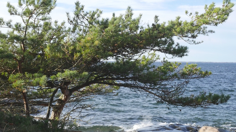 greetings from down here at your roots, or actually your lowest branches – or perhaps this thick branch that I sit on is really part of your bended trunk. You might not remember me, but we have met once before. I sat here last week, feeling cold in the wind, though at that time I did not have writing tools with me, and the camera was shaking so disturbingly in the wind that I never edited the image. Let’s see how it goes this time! As such this wind is not that strong; the open shore makes it feel harder. They have forecasted a gale for tomorrow, more than twenty meters per second, and that will have an effect on traffic at sea. From your perspective it is perhaps not that extraordinary, you have probably experienced many storms and can prepare for them. But how, actually? You cannot pull back your branches close to the trunk or your needles together – I suppose. The fact that you grow along the ground, however, and more like a shrub is probably the consequence of your preparing for wind, although I do not know how. Or, if we think in terms of simplified natural selection those pines that chose a more defiant way and grew straight, have perhaps fallen in storms. On the shores one can see those who have continued growing along the ground afterwards and create new branches upwards for a crown. Perhaps you had a similar accident and have simply continued growing from the new starting point. That is indeed quite good advice for anybody who is ageing and no longer able to do things in the same way as one used to do. However, it is not always easy to see in which direction one should begin to grow. I do not have to decide right now; I can only sit here with you and let the wind blow through me. It comes from the south and is not as cold as one would imagine – or from the west, really. Perhaps it is nevertheless wisest to leave you here in the wind, since you are used to it and have grown with it. For me, a fragile human, it is getting too cold. Thank you for letting me sit here in the wind with you and thank you for the calming thoughts you gave me, in some manner or mediation. I wish you all the best for the coming winter and above all that the storm tomorrow will not cause you distress or damage. Thank you, thank you and keep well! AA