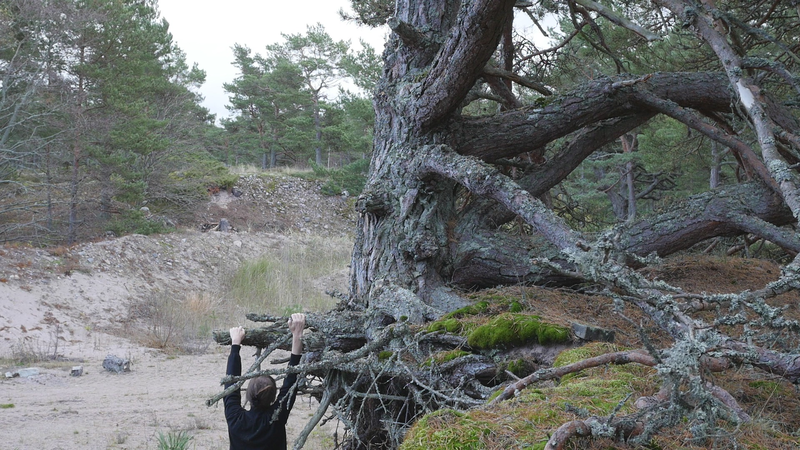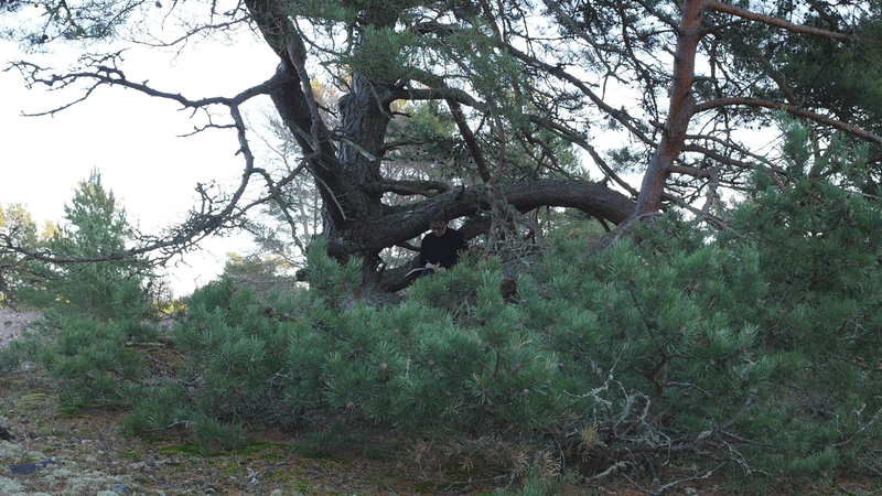 Excuse me for bumping into your “lap” without notice, coming to you like this without forewarning, and disturbing you this November afternoon. It is a great pleasure and honour to be able to sit on your branch and address you with this letter, and simply to be with you and to spend time with you on this island, a former military area that has been turned into a national park and opened to the public only five years ago. I am grateful to you for appearing or performing together with me for this brief moment and for allowing me to record this meeting with a video camera. At this point I probably have to explain why I address you formally like this, and I also have to apologize for addressing you in English, which is not my native language, nor your preferred language, I assume. What your preferred language would be I do not even dare guess, something with volatile chemicals, perhaps. The reason for this formal address is that I hope this letter will reach other humans and not only you, that is, humans will hear or probably read this letter as an example of my practice of writing letters to trees. And unlike some other letters to trees I have written, this will be a letter pondering on letter writing and especially writing letters to trees, so it will be a “meta-letter” of sorts, probably, at least on some level, since my aim is to consider this practice in terms of its ethical and artistic implications; at least I will try to do that. Meanwhile, I also hope that these thoughts will somehow reach you, if not through these words, then through my thoughts. And even though you might not be able to read my thoughts in a strict sense, I hope you will be able to sense my intentions, somehow, and to affirm that they are benign and respectful. I would not like to bother you with ponderings that have no relevance for you if I did not feel that you somehow accept being part of this attempt. And I do not really demand any response from you; I simply try to articulate my thoughts in your presence, in writing, as clearly as possible, so that you can sense them in your manner, or then my intentions at least, and my respect, if nothing else. With all your experience of winter storms, military assaults and visiting tourists, lately, you are of course accustomed to many things, including human attention.