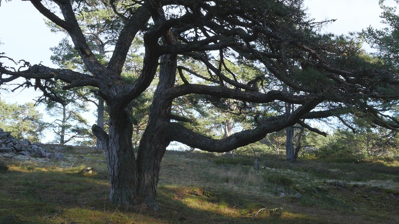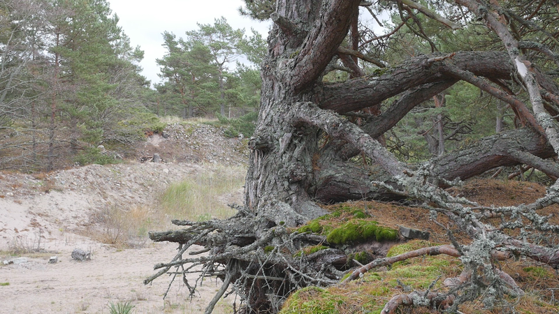 I turn to you in Swedish, because it feels like the most natural alternative here in the outer archipelago, although you probably hear at least as much Finnish and why not other languages, too, especially during the summer months. There has been some forestry work around you, many pine trees have been felled and it is great that you have been spared, probably thanks to your interesting form. You are really an ideal climbing tree for children that might come by, and why not adults, too. However, I am probably one of the oldest who have climbed up on this branch of yours. I am not an expert in tree climbing, and not especially daring either, but your branches seem so inviting, they form almost like a ladder to climb up with. It is really a bit too cold to sit and write with bare hands; luckily the wood protects against the wind that you can here in the noise from the seashore. By the way, I hope I am not disturbing you autumn rest, when I simply thrust myself up without any greetings or ceremonies of welcome. Clumsy, sure, but that is how I often behave with humans as well. Actually, I would prefer to simply sit here and breath in the wind together with you, but writing keeps me warm, however absurd it sounds. And I want to try to address you in some way and tell you how nice you are, elegant and exciting in your flame-like form. Actually, many of your branches are dead, or at least they lack needles and cones; only high up in your crown you are green and healthy. There is a lot of moss and lichen growing on your trunk and it is probably full of all kinds of small bugs, too. I join those small bugs that feed on you, even though I guess I am a “big bug”, at least regarding my weight. No, that was not very funny, sorry for that. But your lower branches are really very strong; I cannot feel the least swaying under my weight. Although I think I am not causing you any suffering or trouble it is becoming too cold for me to sit here in the wind. So, I say thank you for me and wish you all the best for the future. Thank you for letting me sit here and farewell. Yours AA
