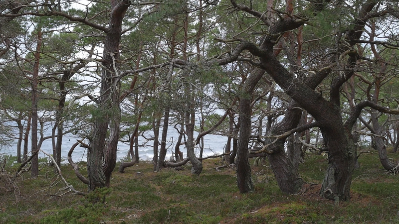 Kära tall, jag har gått förbi dig så många gånger, oftast om morgonen, att jag tyckte det var viktigt att komma och hälsa på dig ordentligt innan jag reser bort. Du, eller ni, för egentligen är det nog två separata träd som växer från samma plats men inte en gemensam rot, förmodar jag, för era stammar är inte sammanvuxna, så ja, ni är böjda som en perfekt liten bänk att sitta på intill stigen, och det ser ut som om en och annan mänskobesökare faktiskt suttit här, åtminstone tidigare på hösten. Dessutom har den ena av er, den som böjer sig över stigen, den jag inte sitter på, utan har framför mina fötter, en blå kvadrat spikad på sig för att markera vandringsstigen. Jag undrar om det är plågsamt att ha den fastspikad så där brutalt? Men å andra sidan tycks inte barken ha tagit skada, och ingen kåda har runnit kring spikarna. Kanske naturvårdarna vet vad de gör, det kan man ju hoppas för det är väl de som satt upp märkena. – Idag är det blåsigt, och det är faktiskt ganska kallt att sitta här på stranden med vinden rakt på, men om man betänker att det är december, alltså mitt i vintern, så är det ju inte ens minusgrader. Så har det blivit med vintrarna nu, ojoj! Eller kanske vintrarna alltid har varit rätt milda på Örö, för vi är ju rätt långt söderut, och ute till havs. Jag undrar hur det kommer sig att ni vuxit på det här sättet, böjda bort från varandra. Kanske det har funnits grenar som kapats av eller bara brustit av någon orsak. Den vridna formen är egentligen vacker, och bekväm att sitta på, faktiskt. Men det känns ändå konstigt att utnyttja era ”missbildningar”, om man skall säga som det är. Fast missbildning låter nog helt fel, för formerna är vackra, snarare ornament eller dekorationer. Jag vill inte vara oförskämd eller oartig, och absolut inte såra dig, ja er, utan bara tala om sakerna som de är, kalla dem för deras rätta namn. Men nej, nu är jag dum – vem bestämmer vad som är det rätta namnet på en förvriden gren, som lika gärna kunde kallas böjd och betagande. Bonsai-tallarna formas ju med flit till att böja sig åt olika håll. Men ni har valt att växa såhär självmant, förmodar jag? Oberoende av så tycker jag att ni är vackra och inbjudande här vid stigen, och det var därför jag ville sätta mig här en stund. Så förlåt att jag började tramsa om deformationer och liknande. Min avsikt var att visa min uppskattning, men det blev helt fel. Tack i alla fall för ert tålamod med min klumpighet, och tack för att jag fick sitta här en stund. Jag önskar er allt gott i fortsättningen, och en fridfull vinter här på stranden. Tack!