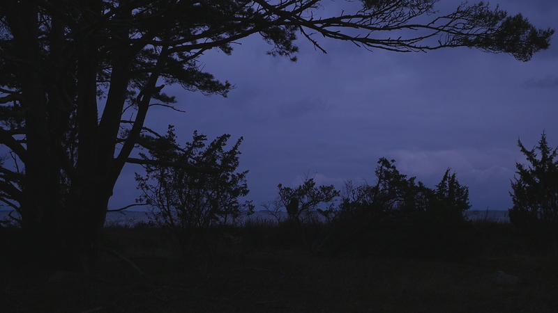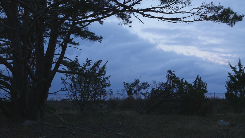 5 pm, almost dark, for the camera at least. The human eye easily adapts to the twilight, and the sea reflects the light from the sky which is still dark indigo. It is easy to walk on the shore, among the trees it is harder. I wait for the right moment, knowing that I will be barely visible in the darkness. When, writing this, I look out the window, the darkness is already impenetrable. Darkness, a rare luxury in this day and age, available daily for the pines here and for me as their guest, for now.