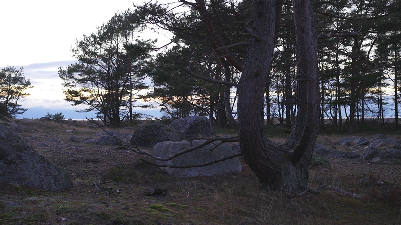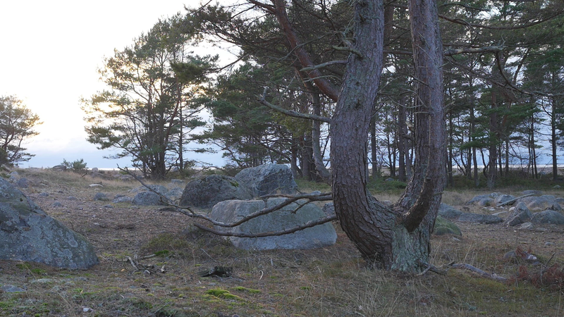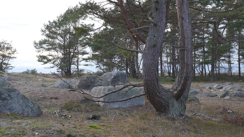 Det börjar bli eftermiddag, dagarna är korta, men solen sticker fram under molnen emellanåt. Vinden tilltar också, tror jag. Och man kan höra havet brusa, som alltid här på Örö, eller nästan alltid, från något håll. Jag undrar hur du förhåller dig till vinden, som måste vara ganska farlig ibland. Inte långt härifrån ligger en av dina släktingar och växer med stammen utmed marken, efter att ha fallit omkull - med största sannolikhet fälld av vinden. Du är hög och reslig med dina två stammar som böjer sig ifrån varandra och närmar sig igen högre upp i kronan. Är den här formen på något sätt till hjälp i hård vind? Jag undrar hur det känns när vinden trycker på, spjärnar du emot, eller kan du flytta på tyngdpunkten på något sätt? Eller är det roten som borrar sig in i jorden som håller balansen?