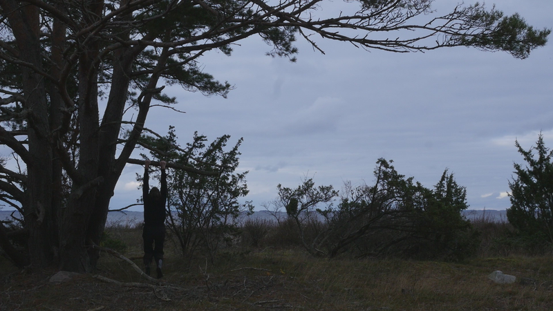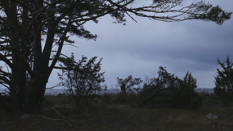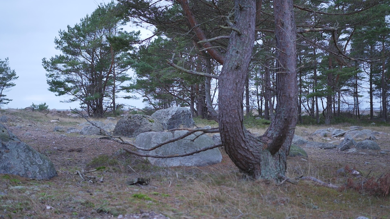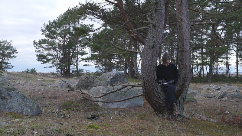 On Friday the 13th November 2020, the sun rises 8.23 am on Örö in the Finnish archipelago. At 8 am before daybreak, in the dim bluish grey light I am already down by the shore, placing my camera tripod behind a rock, which I checked last night, in order to start my day’s work with one of the pines. To choose the pine was no easy matter, but this big beautiful pine was standing apart and had a perfect little branch to hang from. That is my plan, to simply hang for a moment on the branch, nine times, on the hour until sunset at 4 pm. There is a soft drizzle, and I cover the camera with a plastic bag before returning to the house.