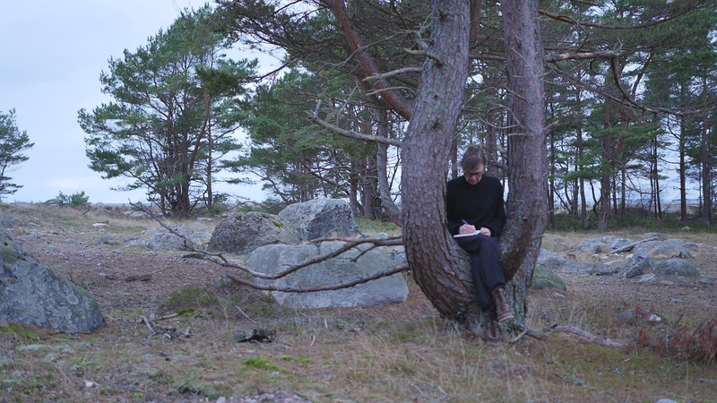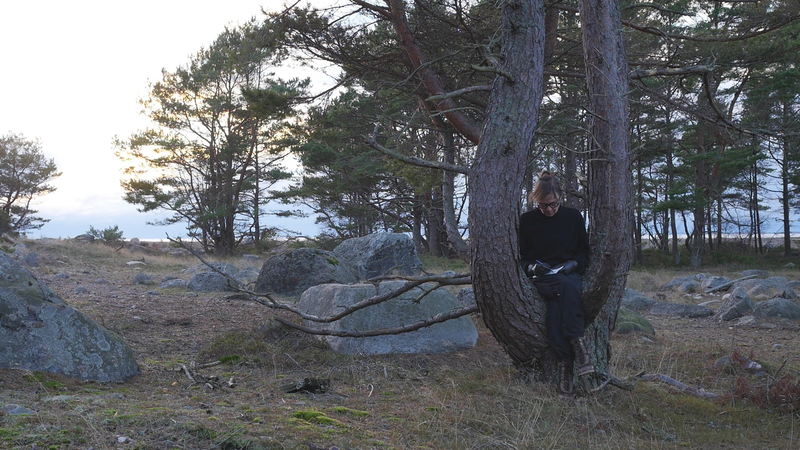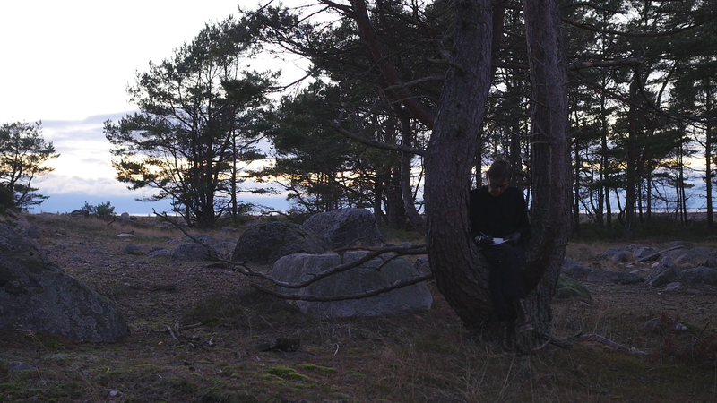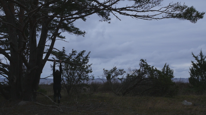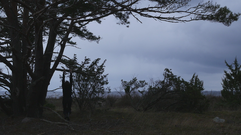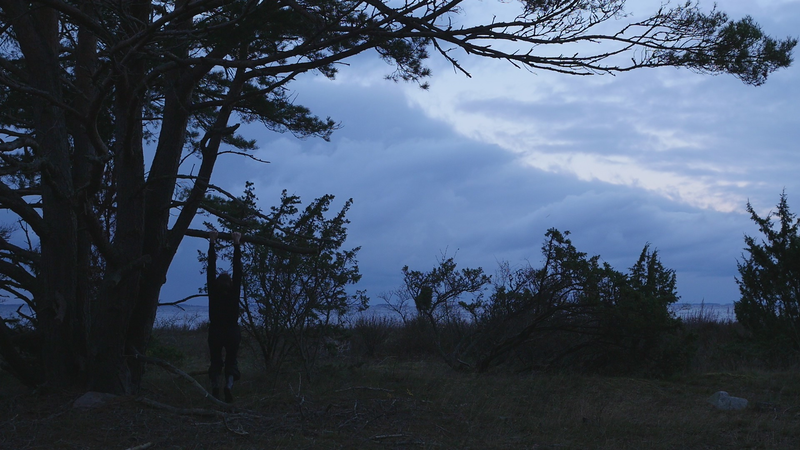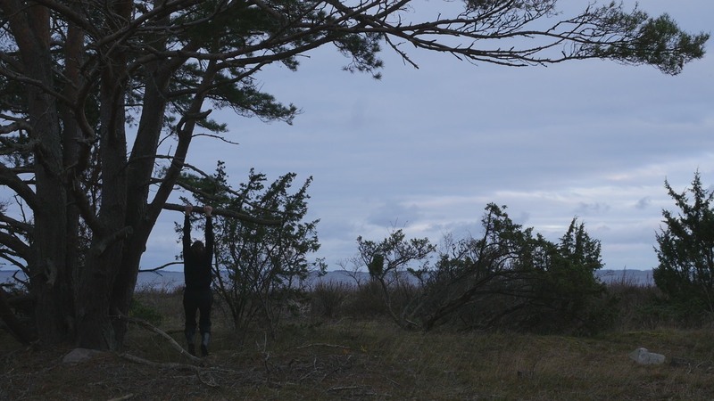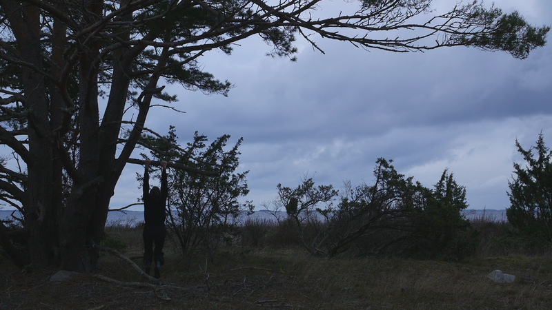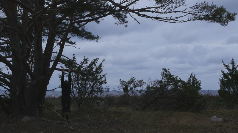 On Friday the 13th November 2020, the sun rises 8.23 am on Örö in the Finnish archipelago. At 8 am before daybreak, in the dim bluish grey light I am already down by the shore, placing my camera tripod behind a rock, which I checked last night, in order to start my day’s work with one of the pines. To choose the pine was no easy matter, but this big beautiful pine was standing apart and had a perfect little branch to hang from. That is my plan, to simply hang for a moment on the branch, nine times, on the hour until sunset at 4 pm. There is a soft drizzle, and I cover the camera with a plastic bag before returning to the house.
