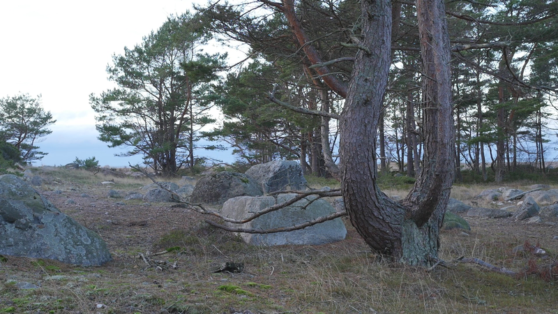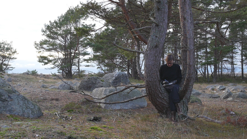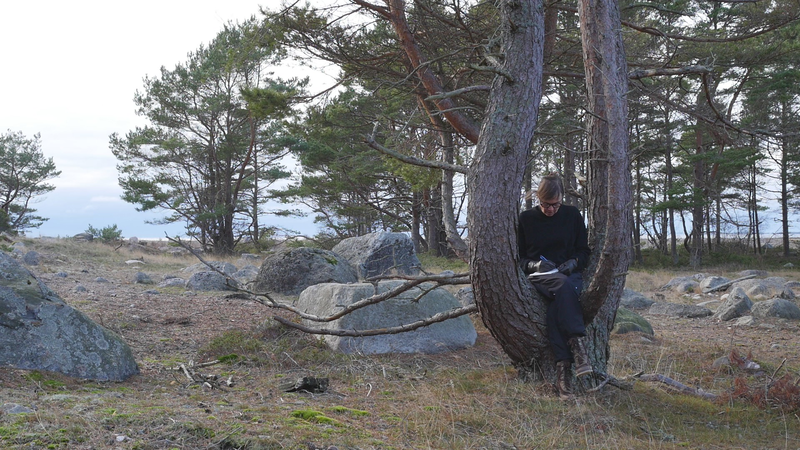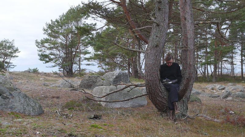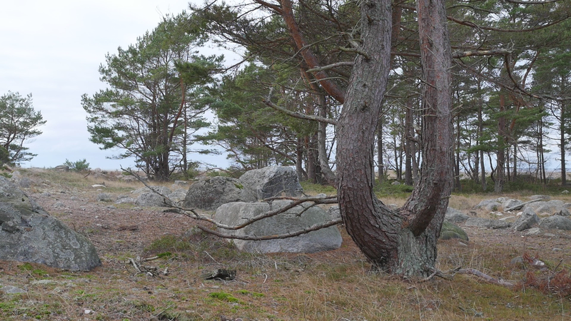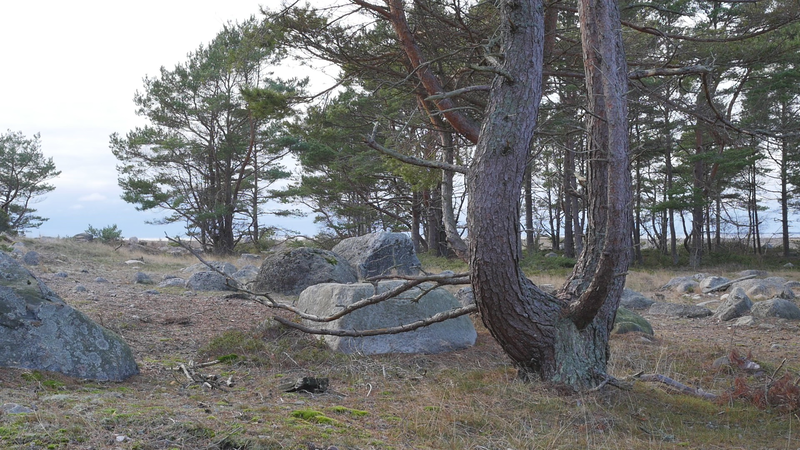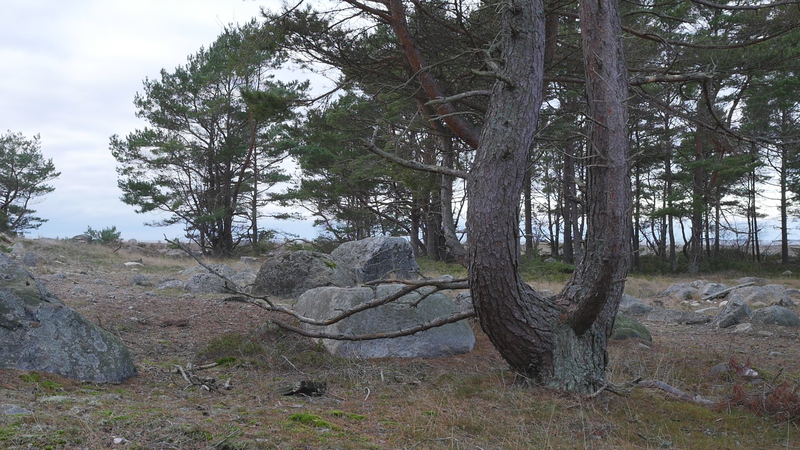 Det börjar bli eftermiddag, dagarna är korta, men solen sticker fram under molnen emellanåt. Vinden tilltar också, tror jag. Och man kan höra havet brusa, som alltid här på Örö, eller nästan alltid, från något håll. Jag undrar hur du förhåller dig till vinden, som måste vara ganska farlig ibland. Inte långt härifrån ligger en av dina släktingar och växer med stammen utmed marken, efter att ha fallit omkull - med största sannolikhet fälld av vinden. Du är hög och reslig med dina två stammar som böjer sig ifrån varandra och närmar sig igen högre upp i kronan. Är den här formen på något sätt till hjälp i hård vind? Jag undrar hur det känns när vinden trycker på, spjärnar du emot, eller kan du flytta på tyngdpunkten på något sätt? Eller är det roten som borrar sig in i jorden som håller balansen?