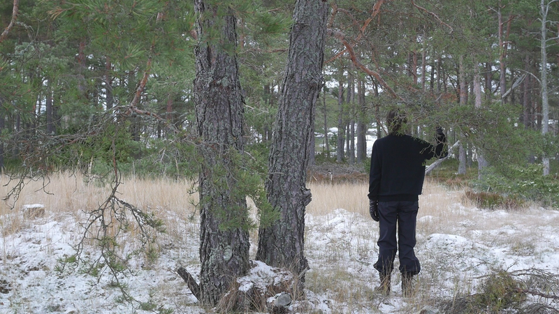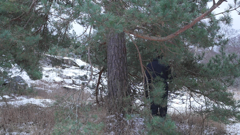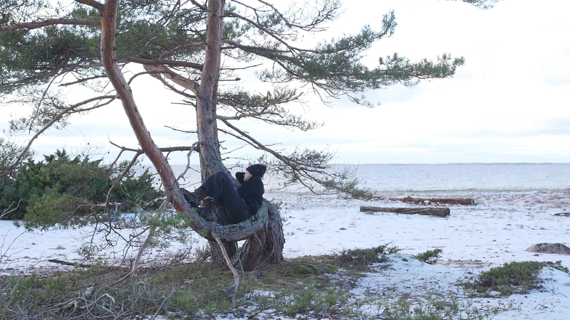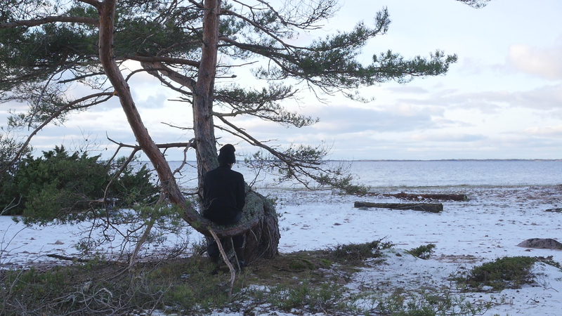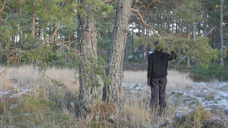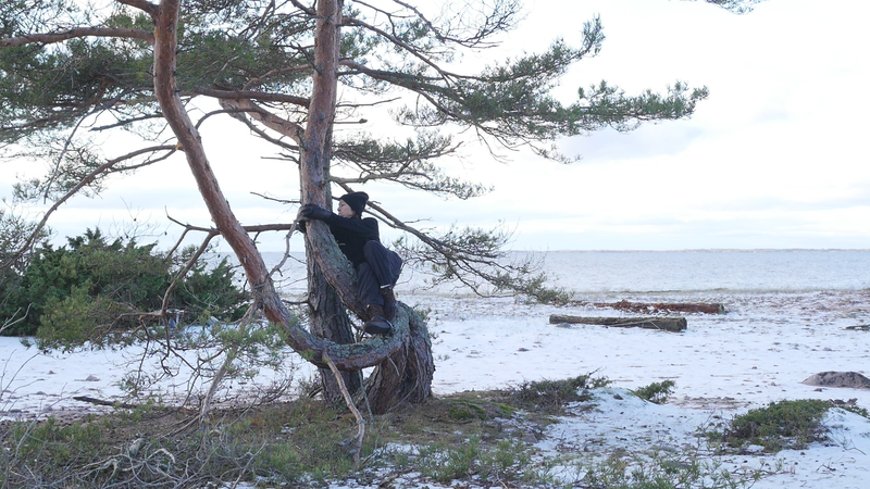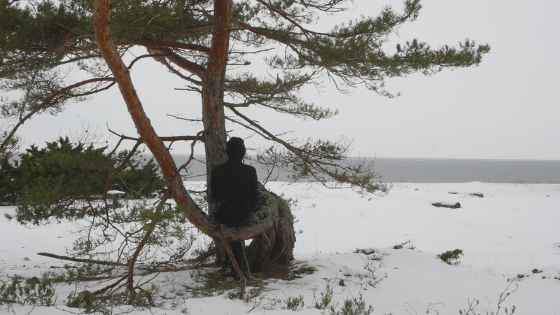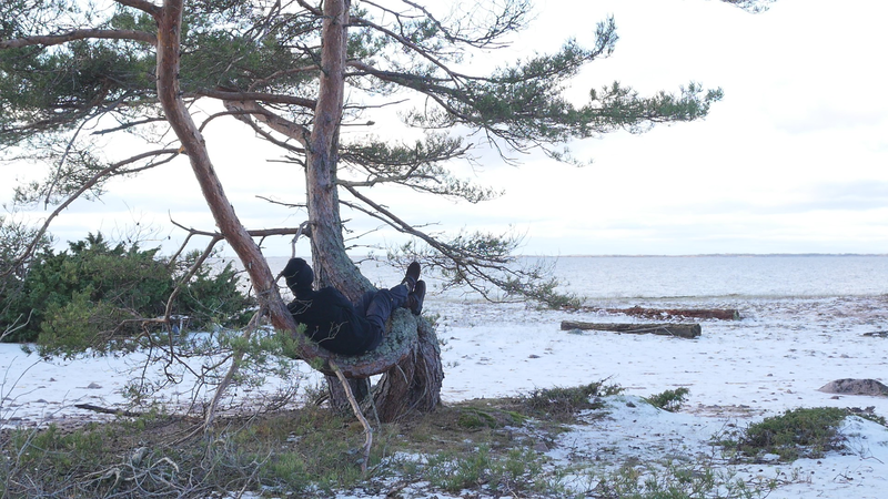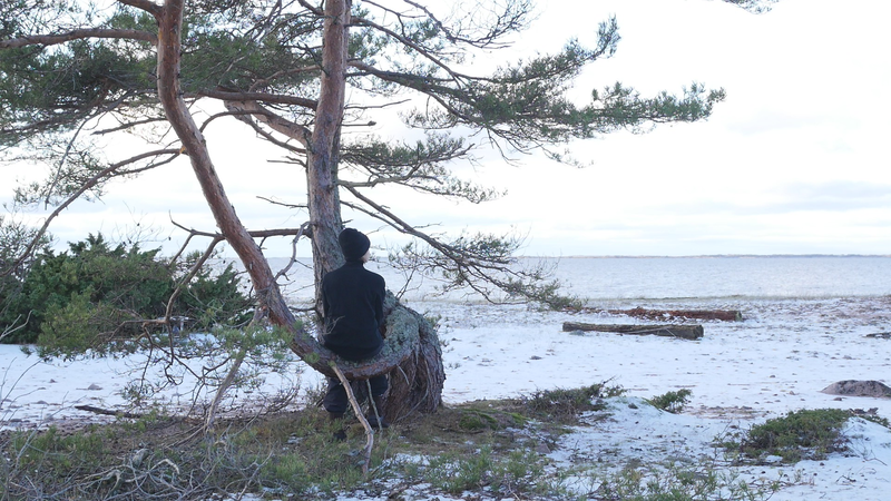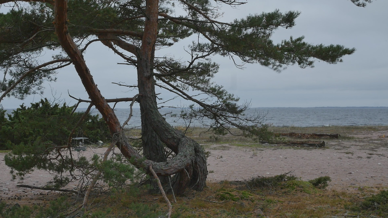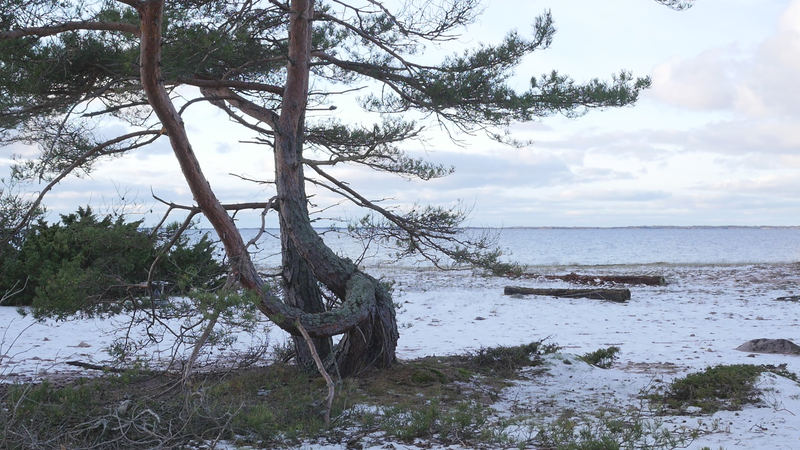 Tack för att jag får sitta så här, på dig, här vid stranden på Örö. Jag beslöt mig för att komma och hälsa på dig medan jag är här nu helt enkelt för att du växer på en så fin plats här på västra stranden och är böjd på ett sånt sätt att det är, som du skulle vara inbjudande för att sitta på. Jag är säkert inte den första människa som sitter här, men de flesta sitter här antagligen under sommarhalvåret, och nu är det den elfte januari tjugotusen [sic] tjugoett. Och även om det är soligt och klart väder idag och inte väldigt kallt, så är det ändå vinter. Jag har tidigare försökt skriva till tallar här, men den här gången bestämde jag mig för att försöka tala in i en mikrofon, att bokstavligen tala om det för tallen. Och även om det känns lite konstigt, och jag vet inte hur det kommer att låta, så är det ju ett mer direkt sätt att tala till dig. Jag antar inte att du förstår svenska eller människospråk överhuvudtaget, men det är fullt möjligt att du kan känna eller höra, känna av min röst på något sätt. Många växter kan höra ljud, känna igen ljud på något sätt. Sen tycker jag om att tänka mig att du på något sätt anar mina avsikter, och att du känner efter, ifall du känner efter så kan du känna att jag vill dig väl, eller åtminstone inte vill dig något illa. Men för att vara riktigt ärlig så talar jag till dig idag, inte så mycket för din skull som för min egen skull. Jag har just fyllt sextiofem år, i förrgår, och det kändes bra att fira det, den bemärkelsedagen här på ön med tallarna här. Jag besökte en annan tall belägen nära kasernområdet då. Men även om, även om det här är ett bra ställe att bli äldre på så är det ändå lite kusligt. Det slog mig att jag nu egentligen borde pensionera mig, gå i pension helt enkelt, ansöka om pension. Jag har inget arbete just nu att gå i pension från, men jag har lyckligtvis ett arbetsstipendium, så att jag kan arbeta helt normalt hela det här året ännu. Men själva tanken på att gå i pension är lite skrämmande. Du är ju ingen ung tall själv heller, men jag har svårt att tänka mig att tallar skulle gå i pension. Tallar kan ju dö, torka bort, förtvina, men också bli väldigt, väldigt gamla, och jag ser ju på dina barr och på dina kottar att du jobbar på för fullt, även om du är böjd på ett sånt här underligt sätt, antagligen på grund av någon höststorm när du var ung. Men, ja, jag vet inte, kanske jag inte direkt ber om råd från dig hur jag skall förhålla mig till det där med pension, men jag vill bara ha ett perspektiv på det genom att fundera på det tillsammans med dig. Om man tänker det på ett annat sätt så är du ju pensionär hela tiden, i den bemärkelsen att du arbetar för dig själv och gör det som känns viktigt för dig och som du behöver göra för att hålla dig vid liv, och för att hjälpa alla de andra varelser som livnär sig på dig, som alla de olika typer av lav som växer på din bark just här intill. För att inte tala om alla andra växter och djur och mikrober som du hjälper att fungera. Det är svårt att förstå ett träd om man är människa, att förstå på riktigt. Men antagligen är det också svårt att förstå en människa om man är tall. Istället för att beklaga mig för dig eller lätta på hjärtat som man säger, berätta om min oro inför att bli gammal och pensionerad och inte behövas längre kan man kanske säga, så borde jag kanske lyssna på dig istället. Men det vad jag hör, det är inte dig utan det är havet här intill. Men tack i varje fall att du lyssnade på mig. Tack för att du finns, och för att jag vet att jag kan kanske komma tillbaka till dig nån gång. Jag hoppas du har det bra resten av vintern. Sköt om dig.