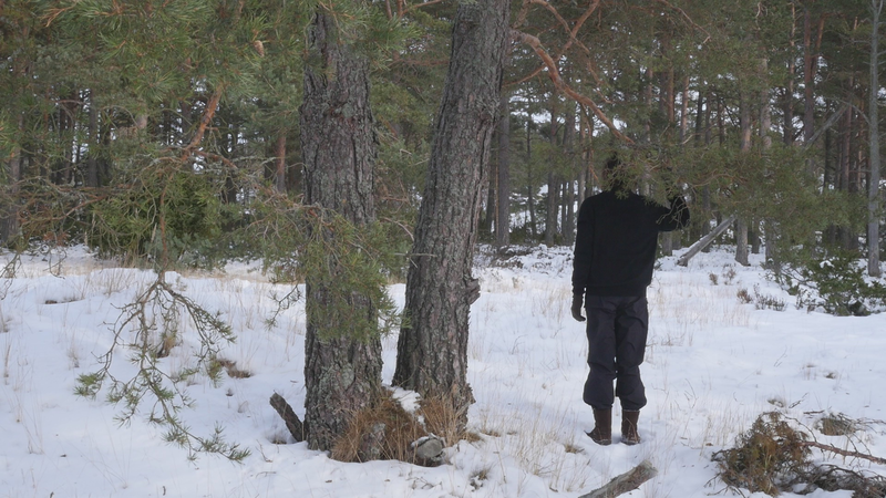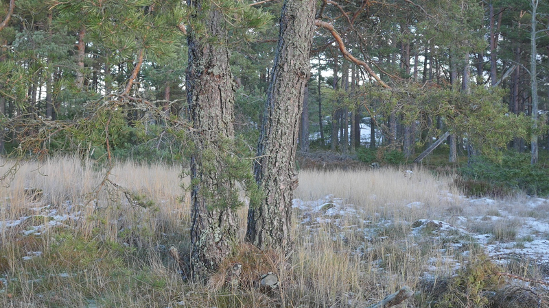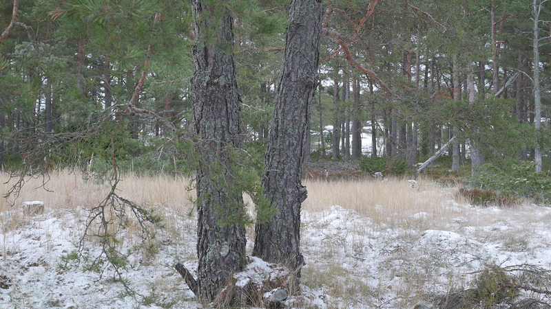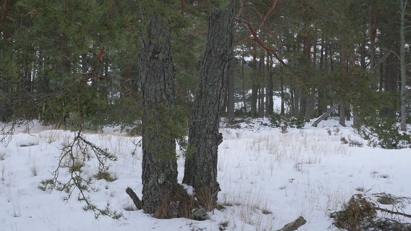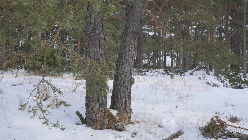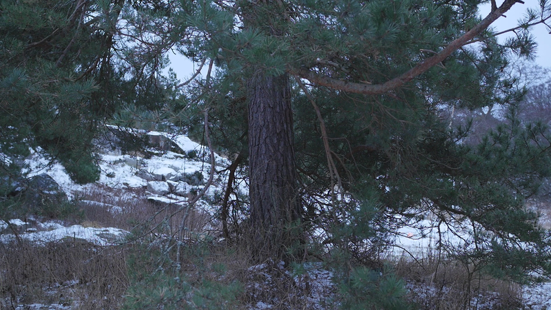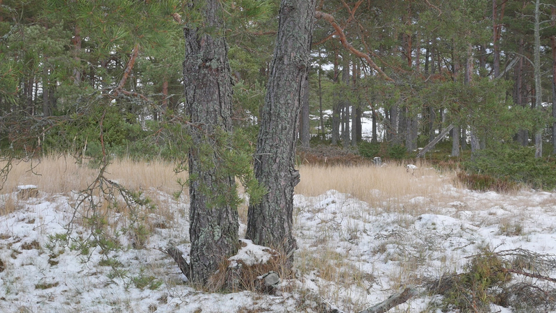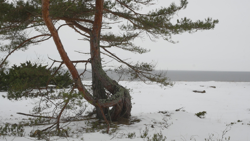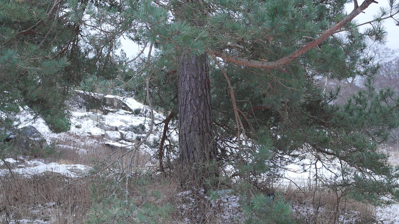 Det är roligt att vara här hos dig igen. Det är över en månad sen jag var här senast. Det är februari, tjugonde februari tjugohundra tjugoett, och det är ovanligt mycket snö i år, en riktig vinter, trots klimatförändringen. Jag undrar om du sover över vinterns, som björnar gör, och många djur, eller vilar, det gör du säkert åtminstone. Men du har ju dina gröna barr så i princip kan du väl fortsätta jobba som vanligt. Men jag tänker mig att, att det är för kallt för alla vätskorna att röra sig i din stam. Men kanske barken är tjock. Nu är det inte så kallt, det är egentligen snöbollsväder, kring noll [grader], men förra veckan var det väldigt kallt, och veckan innan också. Kanske växter inte fryser på samma sätt som djur. Frysa gör de ju, kölden tar livet av växter förstås. Men ni tallar är vana med kölden. Jag kan tänka mig att det blir svårare när det blir varmare. Inte för att värmen i sig skulle vara jobbig, bara det finns vatten, och det finns det säkert nog här. Men det kommer ju en massa nya insekter och svampar och all slags smådjur som tycker om att äta och borra hål i dig och så vidare. Det handlar ju om balans, det förstår jag. Din bark är alldeles full av olika typers lav, och det verkar inte vara något problem för dig. Men det är klart att om, om det sen finns insekter som borrar sig in i ditt trä och sprider sjukdomar, så är det en annan sak. Jag vet inte om det är möjligt för dig att förbereda dig för klimatförändringen. I princip skulle det kunna vara farligt för dig att vara så här nära vattenbrynet, nära havet, för om havsnivån skulle stiga så mycket som den har planerats att den skall göra, så då skulle du hamna under vatten, faktiskt. Men lyckligtvis har vi ju fortfarande landupphöjningen efter istiden här, som motverkar det stigande havs-, den stigande havsnivån en aning. Havet ser häftigt ut nu när det är isbelagt. Isen är mörk och inte vit idag, så det liknar vanligt hav, men det som är spännande med det är att det är helt tyst. Nu blåser det lite, och jag kan tänka mig att vinden slår mot mikrofonen också ibland, men i morse var det alldeles tyst. När man kommer från stan är det nästan overkligt med en sån tystnad. Så plötsligt hörs det en liten fågel som inser att det börjar bli vår så småningom. Det känns ju inte som vår i den här kylan, men ljuset återvänder. De säger att växterna förstår att de skall börja växa, inte för att ljuset återvänder, utan för att de, utan innan det, redan innan det när det blir mörkt. Jag undrar om det stämmer för dig också. - Jag vet inte om du, om du sover, om du vilar, eller om du är här nu, medveten, medveten på det sätt som en tall är medveten. På sätt och vis är du ju mycket mer medveten än människorna, till exempel när det gäller olika nyanser av ljus eller nyanser av fukt, antar jag, och så vidare. Men å andra sidan så har du ju inte en medvetenhet som är som vår. Jag kan tänka mig att vinden är det viktigaste, för det är vinden som böjer dig och tvingar dig att följa sig själv, eller följa, böja sig för vinden. Och det är bara vinden som hörs just nu, när havet inte brusar fritt. Jag hoppas jag inte stör din vila genom att sätta mig här. Kanske jag skall lämna dig att vila i lugn och ro. Men tack för att jag fick sitta här, och tack för att jag fick tala med dig, även om jag inte har något spännande att berätta åt dig just nu. Och inte heller några goda nyheter vad gäller klimatförändringen i sig. Även om det känns lite gran som om folk så småningom skulle vakna till att nu måste det göras något. Kanske det. Men än så länge, ha det så bra. Jag hoppas att vi träffas ännu, innan våren. Tack.