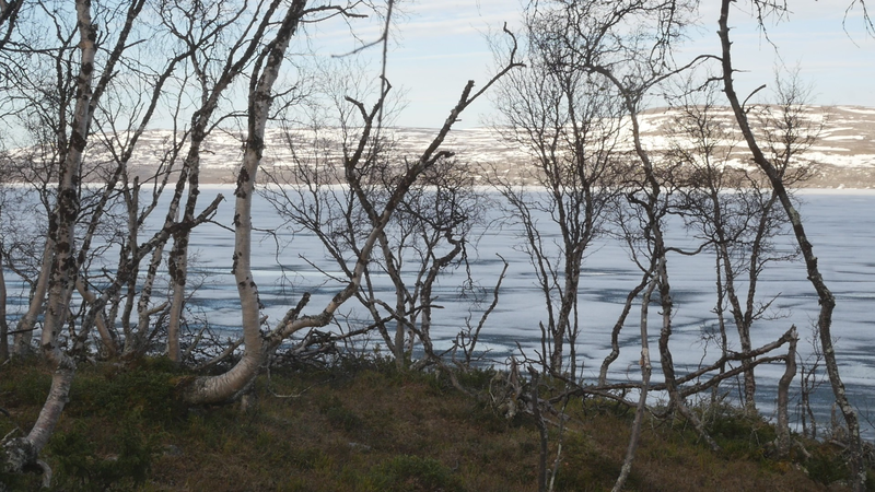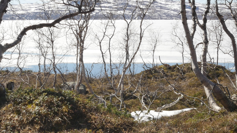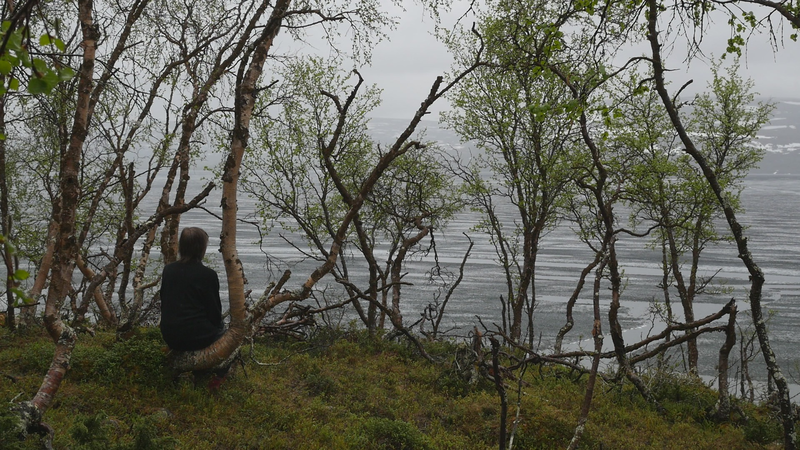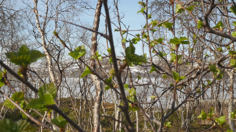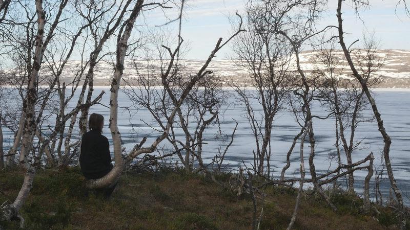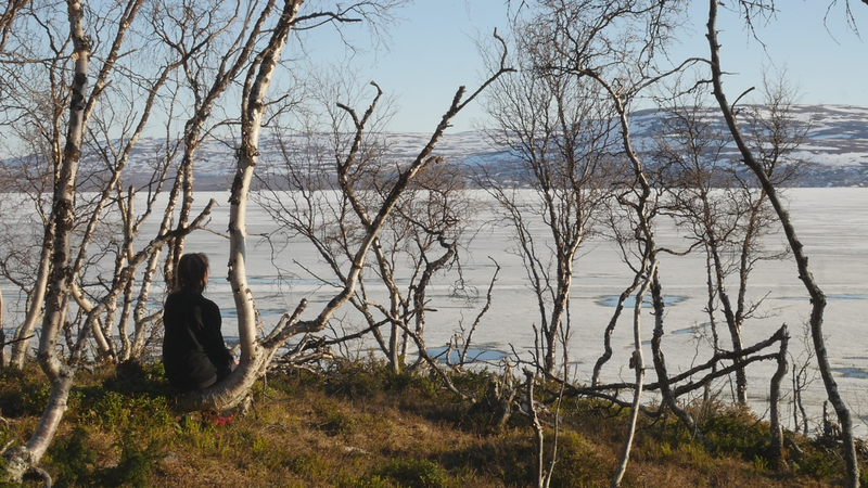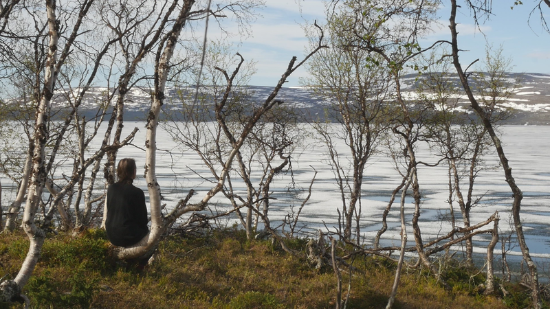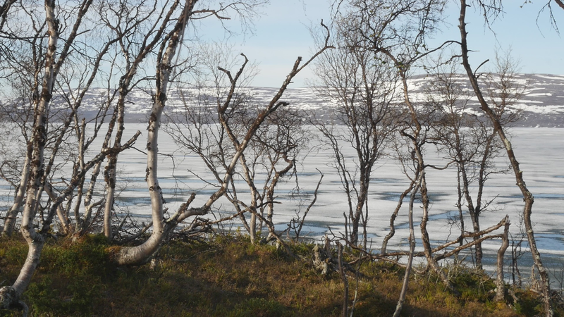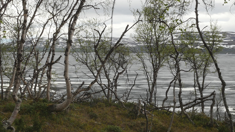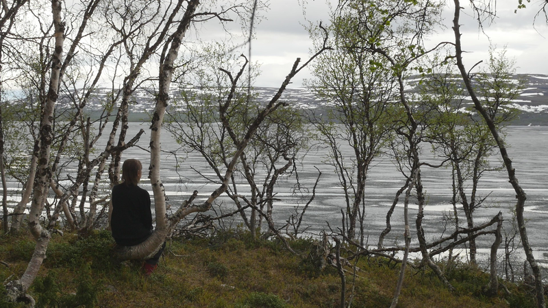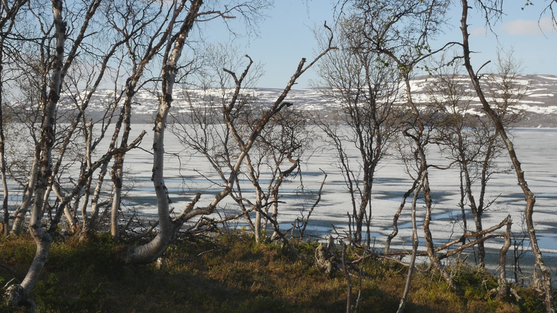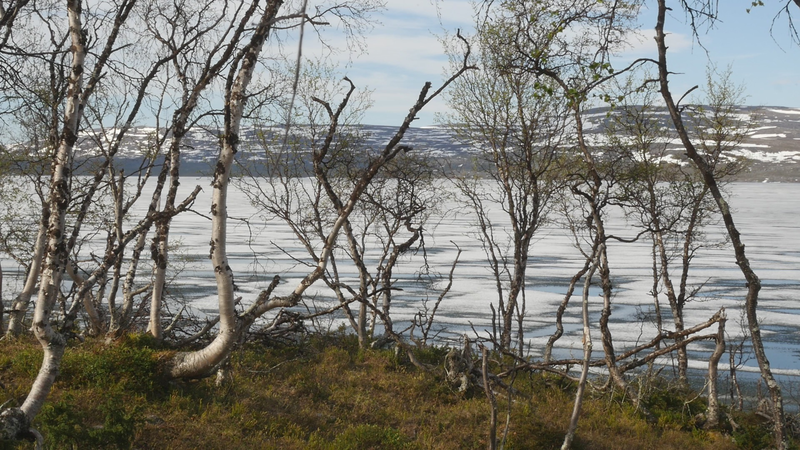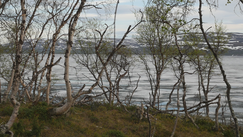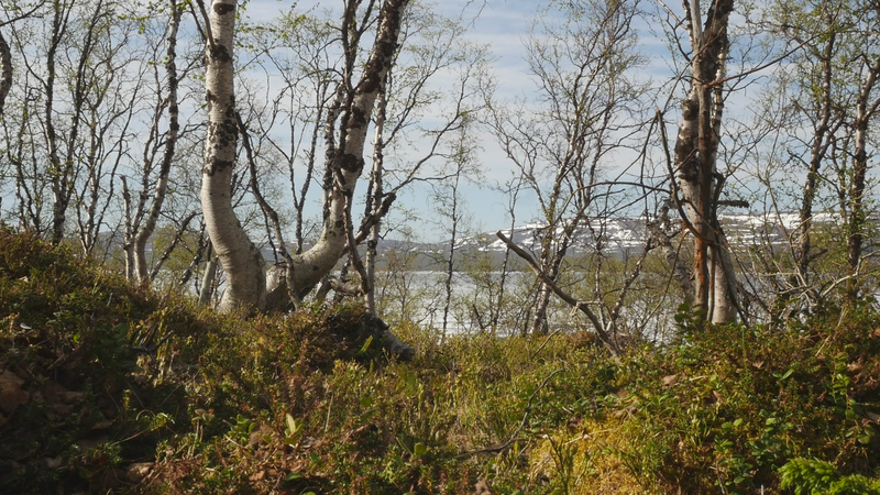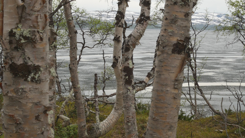 Dearest Mountain Birch, I guess it is about time to try to explain to you what I have been doing, sitting here on your bent branch every morning and evening for almost two weeks. It is actually rather rude of me to do that without asking for your approval or consent or any kind of permission, but I did not know how to approach you in order to ask for your consent, and in many cases I usually choose to “just do it” rather than ask for permission, which often makes things unnecessarily complicated. I nevertheless sincerely hope that I did not offend you by my behavior, especially since I plan to continue with it for a few more days. I chose you of all the birches growing near or below the biological station because you live here on a small hill right by the lake, and have a beautiful view, on the shore. I did not realize that the lake functions like a cooler, so you and your immediate family here below are among the latest to grow out your leaves. Now, you too, have turned green and “dressed up” in small fresh leaves. This time of year, there is no real dusk or dawn, except in the middle of the night, perhaps, because we are here in the shadow of Saana fell so visiting you in the mornings and evenings is more of a change in the direction of the light, not its amount. Right now, the sky is clouded, though, so those usual shifts of light and shadow do not apply. And I am dressed in my ordinary grey clothes rather than my black “performance” outfit. When I say I have been visiting you that is not completely correct, because I have come down to sit on you and with you mainly in order to listen to the surrounding sounds. Now, for example, I can hear some birds, but on many occasions the traffic on the road between the mountain and the lake provides most of the sounds. Especially the huge trucks travelling to the Norwegian border can be heard from far away when approaching. I wonder what they transport, and where? Perhaps there is a harbor in Tromsø, or something. Besides listening to the sounds with you I often count my breaths slowly, trying to wind down and become present in the moment with you. Twenty-one breaths are my usual duration, a way of keeping track of time, approximately. That is of course a very brief instant in your temporal experience. Although birches do not live longer than 100 or 150 years, that is way more than most humans. And here, where the shift in light conditions is so extreme, with a long night-time, the winter, and a long day, the summer, rather than the constant fluctuation, your sense of time must be different, too. – I actually learnt a lot about your way of life from a biologist who kindly gave me a private lecture today. She explained, among other things, that there are two types of birch woods here, the maritime and the continental ones, and the whole ecosystem in them is different, as well as the form of the birches. Here, obviously, we are in the “maritime” type of wood, with blueberry shrubs [twigs] on the ground and the trunks of the birches relatively straight and singular – well, most of you are bent to some degree, but not as twisted and divided as the ones higher up on the slopes. The term “maritime” refers to the way the birch woods look on the Norwegian side, and even though Lake Kilpis is a lake, of course, the northwesterly winds come from the Arctic ocean, which is actually not that far from here, and bring in sea air. In both habitats one can distinguish the height of the snow from your trunks, because the dark brown lichen that decorate them do not like to live below snow level. That I learned already from the sign board on the nature path [trail]. Why some of you have a completely white bark while others are pale grey, I do not know, and it might be just a coincidence. There are two types of birches that have hybridized, the dwarf ones and the downy birches, and you can see the difference in the autumn, because the dwarf ones turn read rather than orange yellow. I realize I would really like to come and spend some time with you in the autumn, too, and to listen to the sounds of autumn together with you, like we now have listened to the sounds of spring. I want to thank you for your hospitality and generosity and sincerely hope that I have not been too much of a disturbance for you. I hope you can somehow sense my gratitude and appreciation, and I wish you all the best for the coming summer. Let us hope it will be a peaceful, invigorating and productive time for you. Take care!