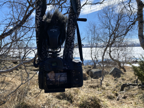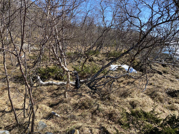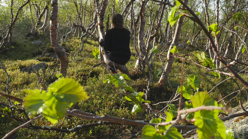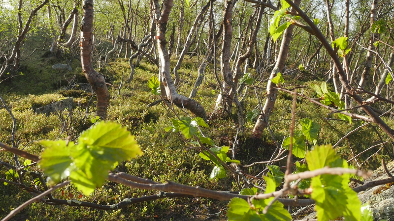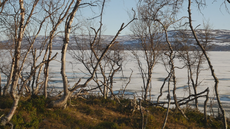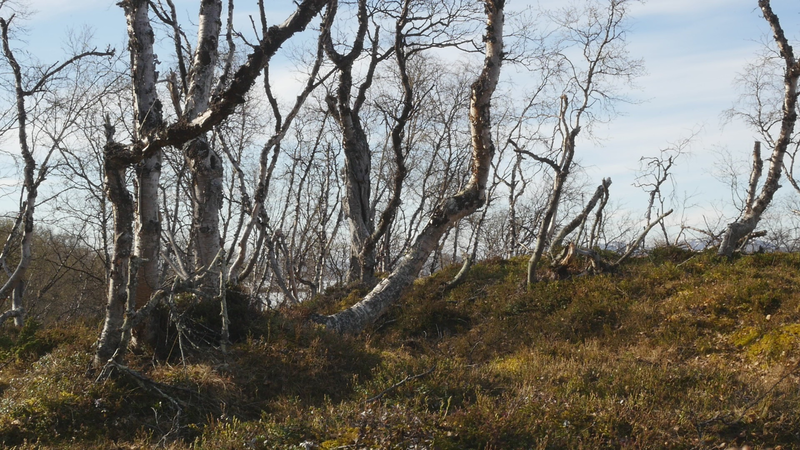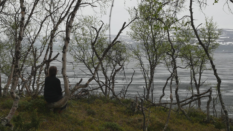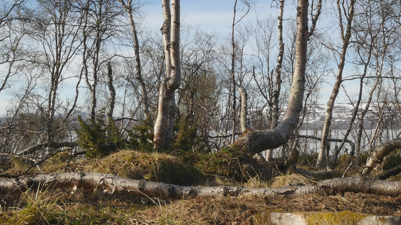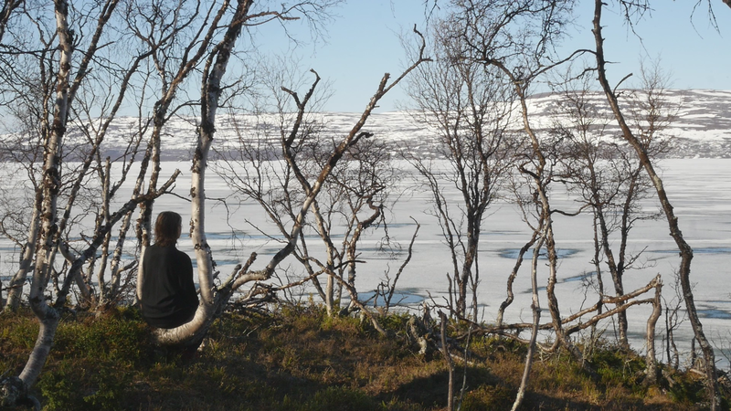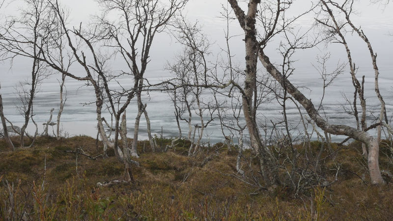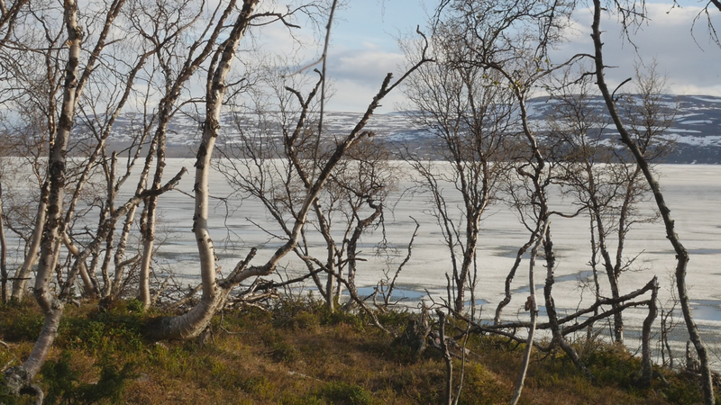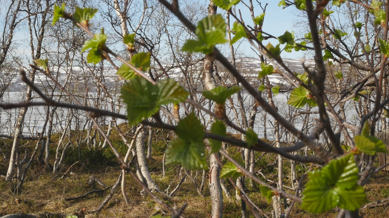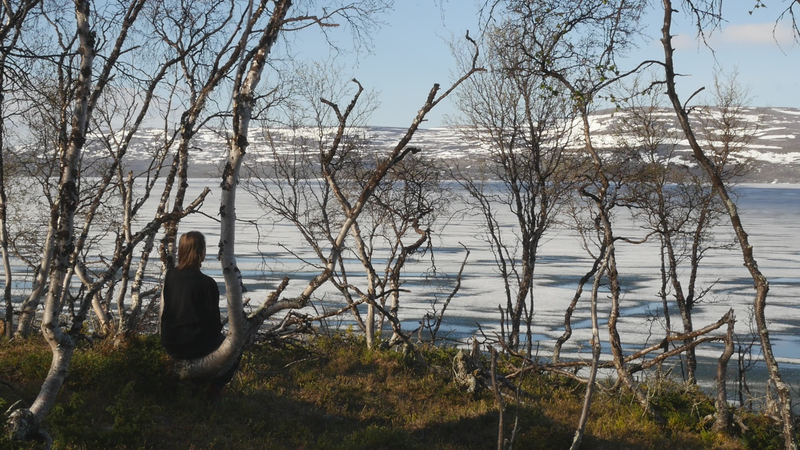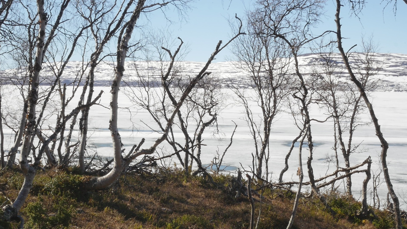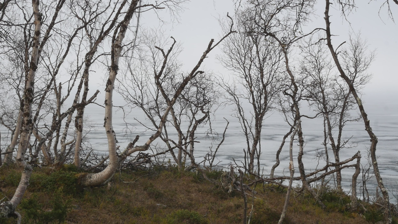 Dearest Mountain Birch, I guess it is about time to try to explain to you what I have been doing, sitting here on your bent branch every morning and evening for almost two weeks. It is actually rather rude of me to do that without asking for your approval or consent or any kind of permission, but I did not know how to approach you in order to ask for your consent, and in many cases I usually choose to “just do it” rather than ask for permission, which often makes things unnecessarily complicated. I nevertheless sincerely hope that I did not offend you by my behavior, especially since I plan to continue with it for a few more days. I chose you of all the birches growing near or below the biological station because you live here on a small hill right by the lake, and have a beautiful view, on the shore. I did not realize that the lake functions like a cooler, so you and your immediate family here below are among the latest to grow out your leaves. Now, you too, have turned green and “dressed up” in small fresh leaves. This time of year, there is no real dusk or dawn, except in the middle of the night, perhaps, because we are here in the shadow of Saana fell so visiting you in the mornings and evenings is more of a change in the direction of the light, not its amount. Right now, the sky is clouded, though, so those usual shifts of light and shadow do not apply. And I am dressed in my ordinary grey clothes rather than my black “performance” outfit. When I say I have been visiting you that is not completely correct, because I have come down to sit on you and with you mainly in order to listen to the surrounding sounds. Now, for example, I can hear some birds, but on many occasions the traffic on the road between the mountain and the lake provides most of the sounds. Especially the huge trucks travelling to the Norwegian border can be heard from far away when approaching. I wonder what they transport, and where? Perhaps there is a harbor in Tromsø, or something. Besides listening to the sounds with you I often count my breaths slowly, trying to wind down and become present in the moment with you. Twenty-one breaths are my usual duration, a way of keeping track of time, approximately. That is of course a very brief instant in your temporal experience. Although birches do not live longer than 100 or 150 years, that is way more than most humans. And here, where the shift in light conditions is so extreme, with a long night-time, the winter, and a long day, the summer, rather than the constant fluctuation, your sense of time must be different, too. – I actually learnt a lot about your way of life from a biologist who kindly gave me a private lecture today. She explained, among other things, that there are two types of birch woods here, the maritime and the continental ones, and the whole ecosystem in them is different, as well as the form of the birches. Here, obviously, we are in the “maritime” type of wood, with blueberry shrubs [twigs] on the ground and the trunks of the birches relatively straight and singular – well, most of you are bent to some degree, but not as twisted and divided as the ones higher up on the slopes. The term “maritime” refers to the way the birch woods look on the Norwegian side, and even though Lake Kilpis is a lake, of course, the northwesterly winds come from the Arctic ocean, which is actually not that far from here, and bring in sea air. In both habitats one can distinguish the height of the snow from your trunks, because the dark brown lichen that decorate them do not like to live below snow level. That I learned already from the sign board on the nature path [trail]. Why some of you have a completely white bark while others are pale grey, I do not know, and it might be just a coincidence. There are two types of birches that have hybridized, the dwarf ones and the downy birches, and you can see the difference in the autumn, because the dwarf ones turn read rather than orange yellow. I realize I would really like to come and spend some time with you in the autumn, too, and to listen to the sounds of autumn together with you, like we now have listened to the sounds of spring. I want to thank you for your hospitality and generosity and sincerely hope that I have not been too much of a disturbance for you. I hope you can somehow sense my gratitude and appreciation, and I wish you all the best for the coming summer. Let us hope it will be a peaceful, invigorating and productive time for you. Take care!