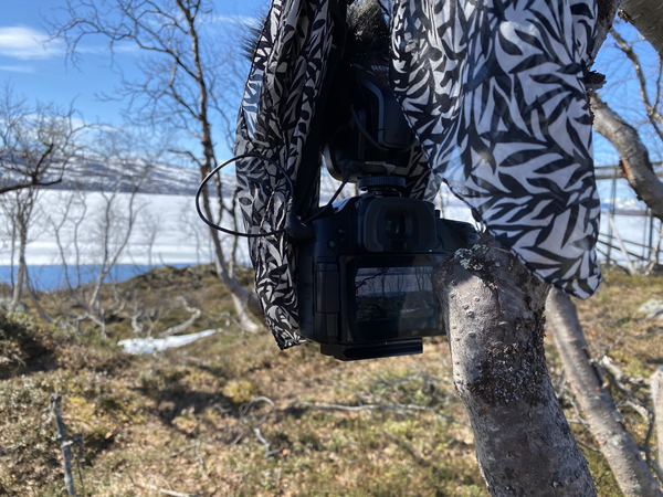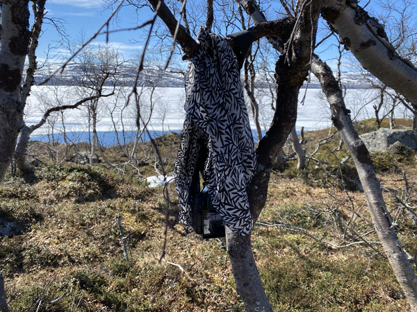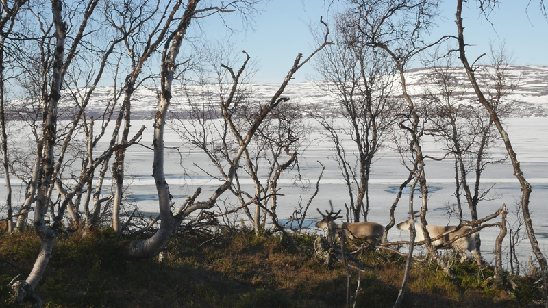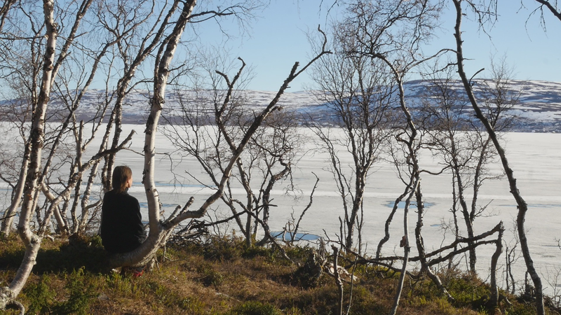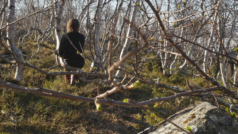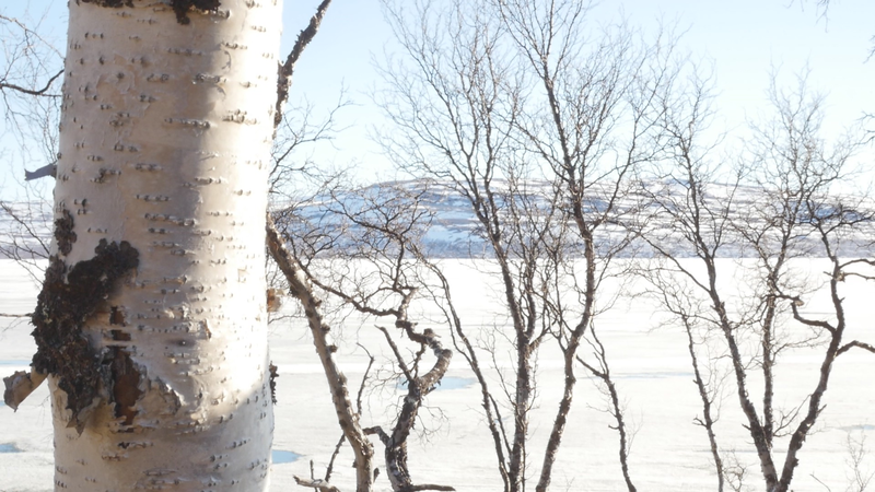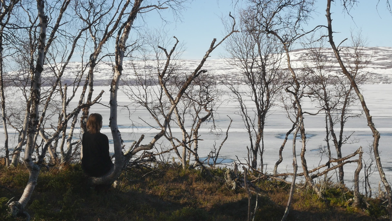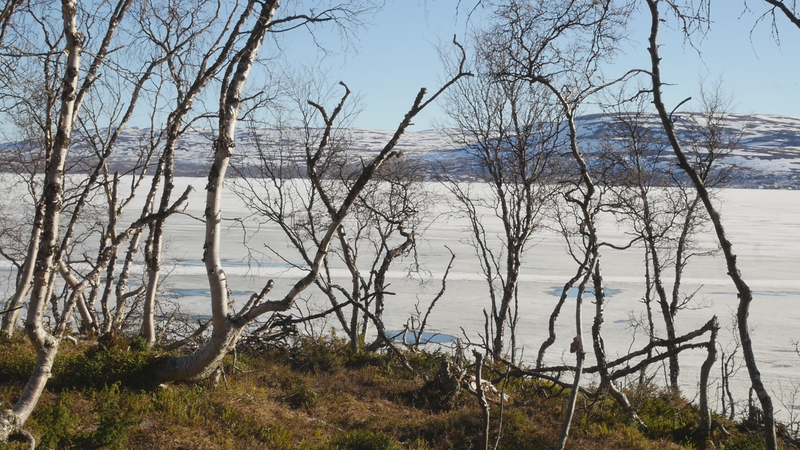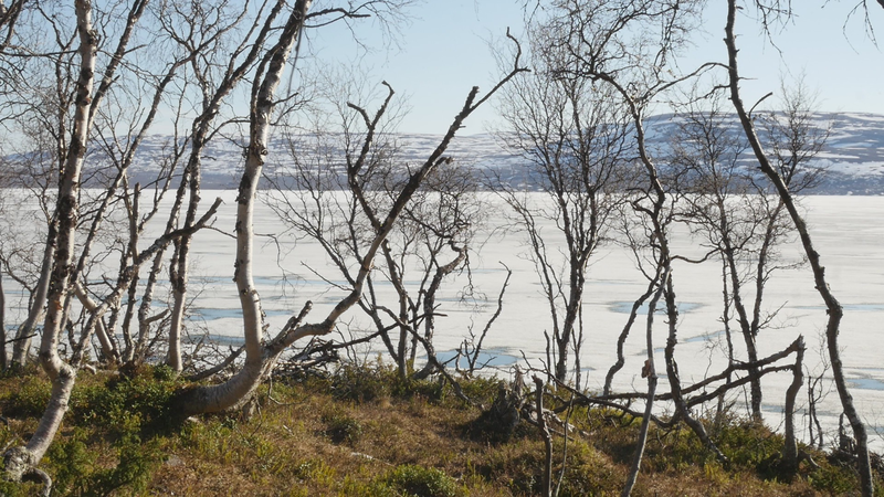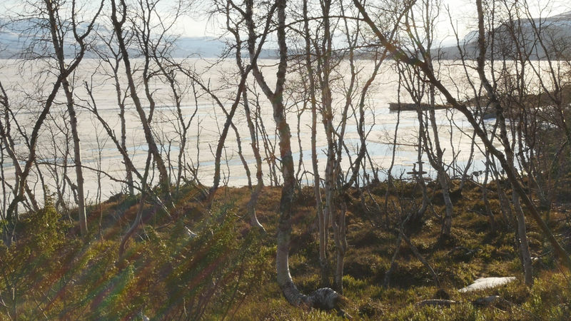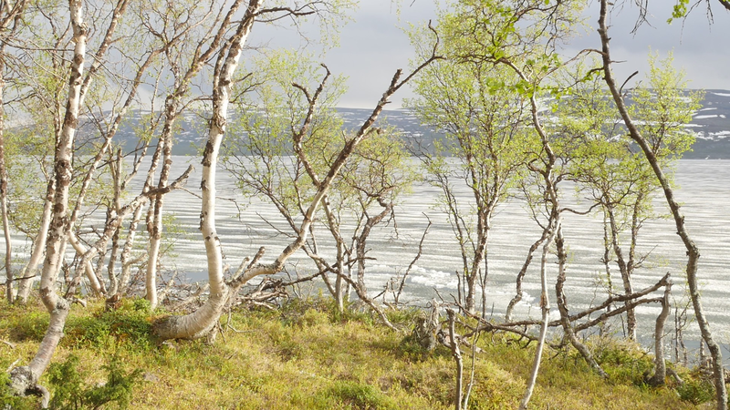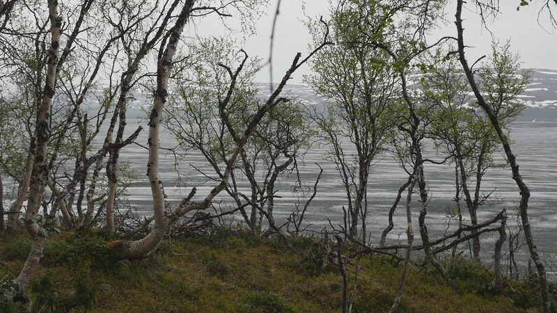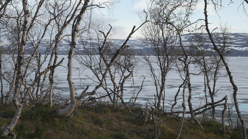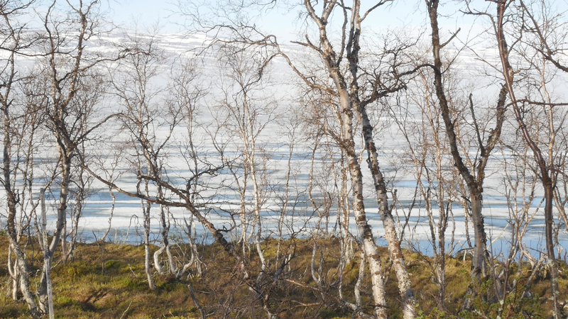 Dearest Mountain Birch, I guess it is about time to try to explain to you what I have been doing, sitting here on your bent branch every morning and evening for almost two weeks. It is actually rather rude of me to do that without asking for your approval or consent or any kind of permission, but I did not know how to approach you in order to ask for your consent, and in many cases I usually choose to “just do it” rather than ask for permission, which often makes things unnecessarily complicated. I nevertheless sincerely hope that I did not offend you by my behavior, especially since I plan to continue with it for a few more days. I chose you of all the birches growing near or below the biological station because you live here on a small hill right by the lake, and have a beautiful view, on the shore. I did not realize that the lake functions like a cooler, so you and your immediate family here below are among the latest to grow out your leaves. Now, you too, have turned green and “dressed up” in small fresh leaves. This time of year, there is no real dusk or dawn, except in the middle of the night, perhaps, because we are here in the shadow of Saana fell so visiting you in the mornings and evenings is more of a change in the direction of the light, not its amount. Right now, the sky is clouded, though, so those usual shifts of light and shadow do not apply. And I am dressed in my ordinary grey clothes rather than my black “performance” outfit. When I say I have been visiting you that is not completely correct, because I have come down to sit on you and with you mainly in order to listen to the surrounding sounds. Now, for example, I can hear some birds, but on many occasions the traffic on the road between the mountain and the lake provides most of the sounds. Especially the huge trucks travelling to the Norwegian border can be heard from far away when approaching. I wonder what they transport, and where? Perhaps there is a harbor in Tromsø, or something. Besides listening to the sounds with you I often count my breaths slowly, trying to wind down and become present in the moment with you. Twenty-one breaths are my usual duration, a way of keeping track of time, approximately. That is of course a very brief instant in your temporal experience. Although birches do not live longer than 100 or 150 years, that is way more than most humans. And here, where the shift in light conditions is so extreme, with a long night-time, the winter, and a long day, the summer, rather than the constant fluctuation, your sense of time must be different, too. – I actually learnt a lot about your way of life from a biologist who kindly gave me a private lecture today. She explained, among other things, that there are two types of birch woods here, the maritime and the continental ones, and the whole ecosystem in them is different, as well as the form of the birches. Here, obviously, we are in the “maritime” type of wood, with blueberry shrubs [twigs] on the ground and the trunks of the birches relatively straight and singular – well, most of you are bent to some degree, but not as twisted and divided as the ones higher up on the slopes. The term “maritime” refers to the way the birch woods look on the Norwegian side, and even though Lake Kilpis is a lake, of course, the northwesterly winds come from the Arctic ocean, which is actually not that far from here, and bring in sea air. In both habitats one can distinguish the height of the snow from your trunks, because the dark brown lichen that decorate them do not like to live below snow level. That I learned already from the sign board on the nature path [trail]. Why some of you have a completely white bark while others are pale grey, I do not know, and it might be just a coincidence. There are two types of birches that have hybridized, the dwarf ones and the downy birches, and you can see the difference in the autumn, because the dwarf ones turn read rather than orange yellow. I realize I would really like to come and spend some time with you in the autumn, too, and to listen to the sounds of autumn together with you, like we now have listened to the sounds of spring. I want to thank you for your hospitality and generosity and sincerely hope that I have not been too much of a disturbance for you. I hope you can somehow sense my gratitude and appreciation, and I wish you all the best for the coming summer. Let us hope it will be a peaceful, invigorating and productive time for you. Take care!