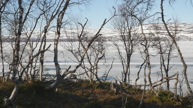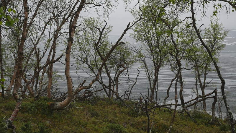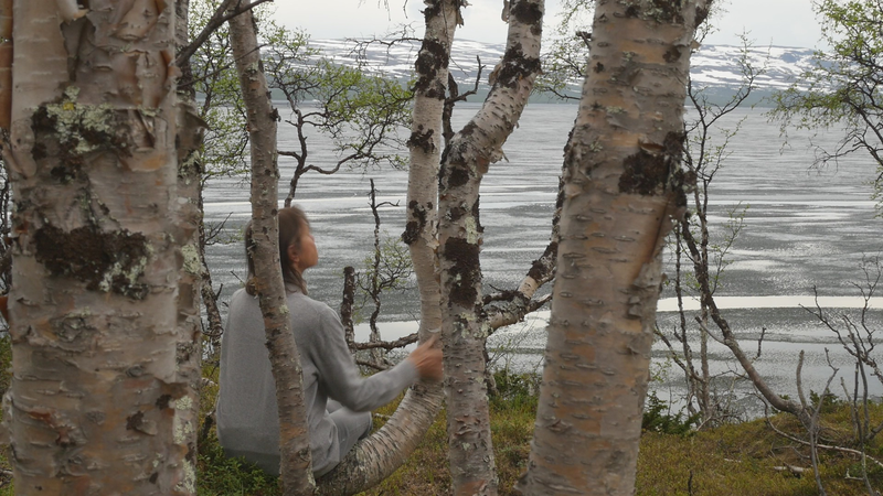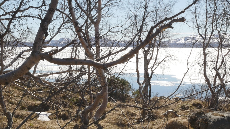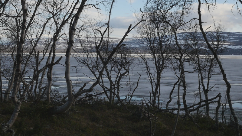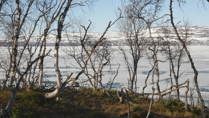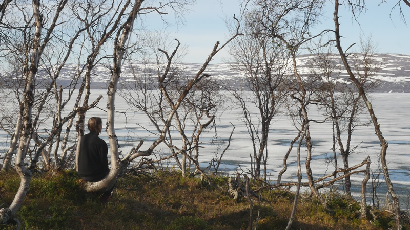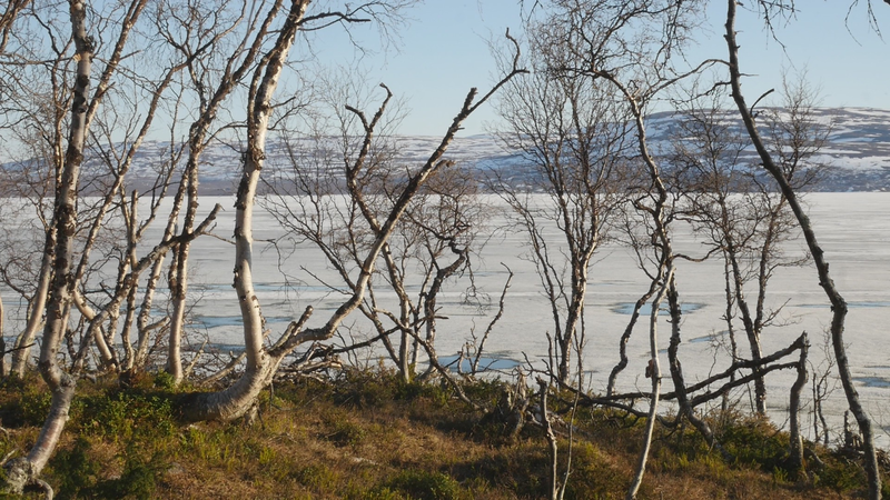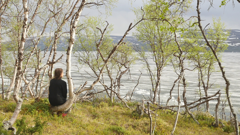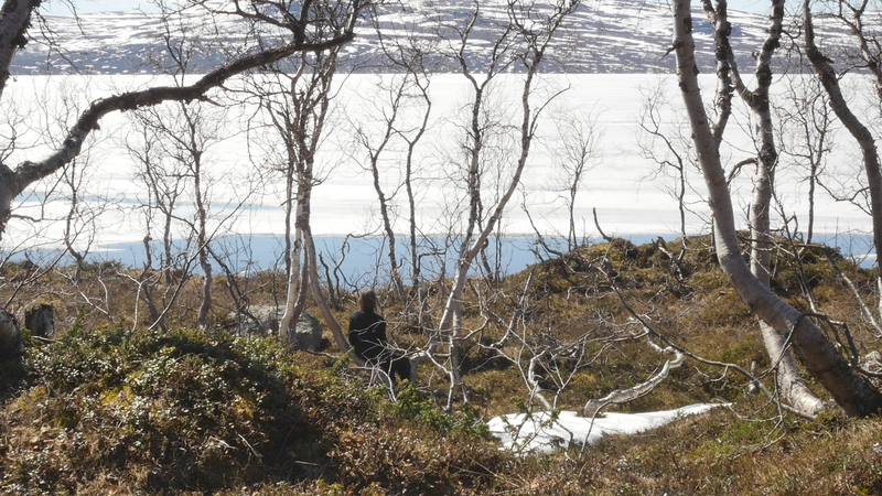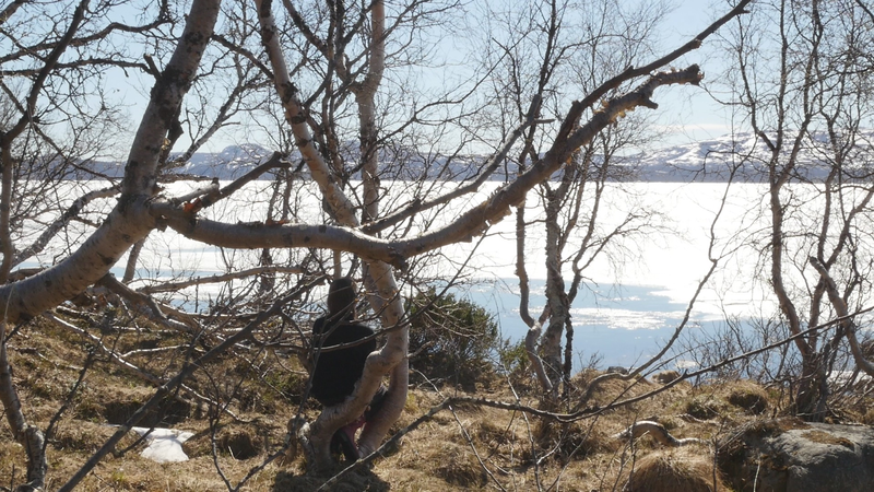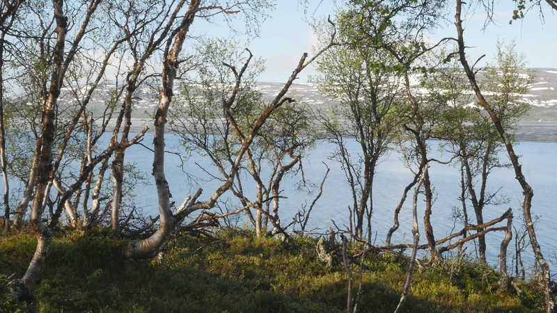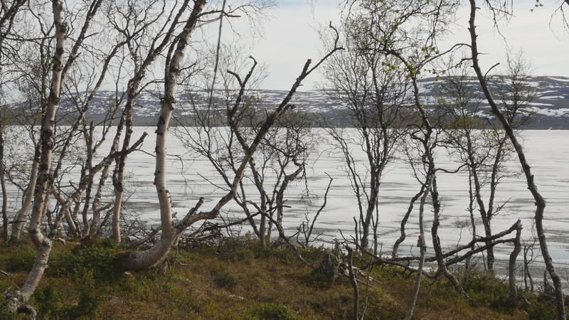 Dearest Mountain Birch, I guess it is about time to try to explain to you what I have been doing, sitting here on your bent branch every morning and evening for almost two weeks. It is actually rather rude of me to do that without asking for your approval or consent or any kind of permission, but I did not know how to approach you in order to ask for your consent, and in many cases I usually choose to “just do it” rather than ask for permission, which often makes things unnecessarily complicated. I nevertheless sincerely hope that I did not offend you by my behavior, especially since I plan to continue with it for a few more days. I chose you of all the birches growing near or below the biological station because you live here on a small hill right by the lake, and have a beautiful view, on the shore. I did not realize that the lake functions like a cooler, so you and your immediate family here below are among the latest to grow out your leaves. Now, you too, have turned green and “dressed up” in small fresh leaves. This time of year, there is no real dusk or dawn, except in the middle of the night, perhaps, because we are here in the shadow of Saana fell so visiting you in the mornings and evenings is more of a change in the direction of the light, not its amount. Right now, the sky is clouded, though, so those usual shifts of light and shadow do not apply. And I am dressed in my ordinary grey clothes rather than my black “performance” outfit. When I say I have been visiting you that is not completely correct, because I have come down to sit on you and with you mainly in order to listen to the surrounding sounds. Now, for example, I can hear some birds, but on many occasions the traffic on the road between the mountain and the lake provides most of the sounds. Especially the huge trucks travelling to the Norwegian border can be heard from far away when approaching. I wonder what they transport, and where? Perhaps there is a harbor in Tromsø, or something. Besides listening to the sounds with you I often count my breaths slowly, trying to wind down and become present in the moment with you. Twenty-one breaths are my usual duration, a way of keeping track of time, approximately. That is of course a very brief instant in your temporal experience. Although birches do not live longer than 100 or 150 years, that is way more than most humans. And here, where the shift in light conditions is so extreme, with a long night-time, the winter, and a long day, the summer, rather than the constant fluctuation, your sense of time must be different, too. – I actually learnt a lot about your way of life from a biologist who kindly gave me a private lecture today. She explained, among other things, that there are two types of birch woods here, the maritime and the continental ones, and the whole ecosystem in them is different, as well as the form of the birches. Here, obviously, we are in the “maritime” type of wood, with blueberry shrubs [twigs] on the ground and the trunks of the birches relatively straight and singular – well, most of you are bent to some degree, but not as twisted and divided as the ones higher up on the slopes. The term “maritime” refers to the way the birch woods look on the Norwegian side, and even though Lake Kilpis is a lake, of course, the northwesterly winds come from the Arctic ocean, which is actually not that far from here, and bring in sea air. In both habitats one can distinguish the height of the snow from your trunks, because the dark brown lichen that decorate them do not like to live below snow level. That I learned already from the sign board on the nature path [trail]. Why some of you have a completely white bark while others are pale grey, I do not know, and it might be just a coincidence. There are two types of birches that have hybridized, the dwarf ones and the downy birches, and you can see the difference in the autumn, because the dwarf ones turn read rather than orange yellow. I realize I would really like to come and spend some time with you in the autumn, too, and to listen to the sounds of autumn together with you, like we now have listened to the sounds of spring. I want to thank you for your hospitality and generosity and sincerely hope that I have not been too much of a disturbance for you. I hope you can somehow sense my gratitude and appreciation, and I wish you all the best for the coming summer. Let us hope it will be a peaceful, invigorating and productive time for you. Take care!