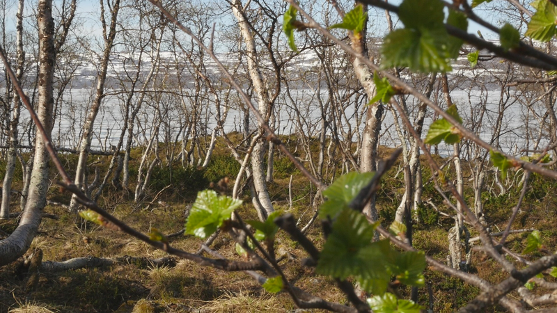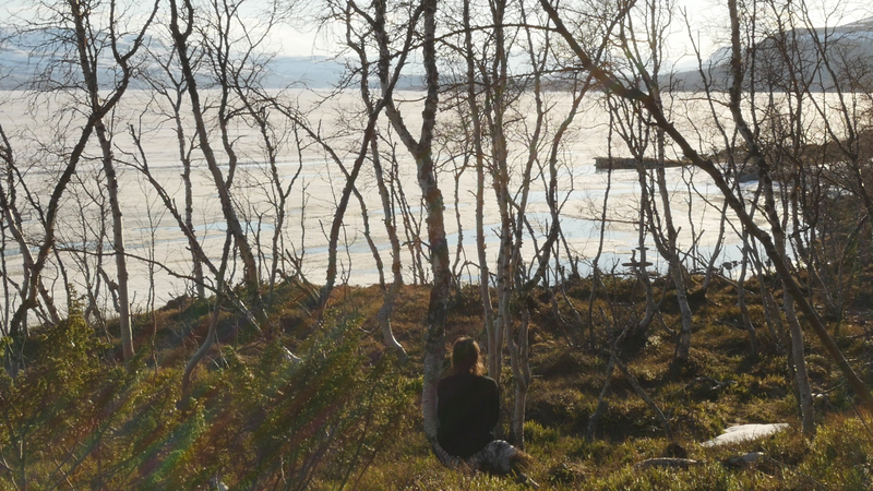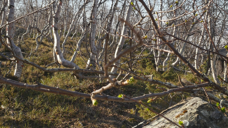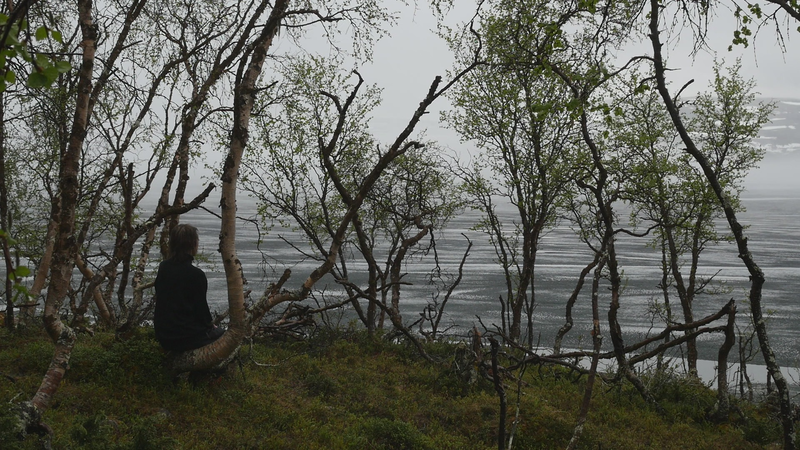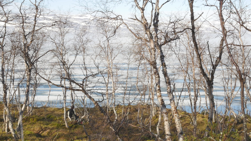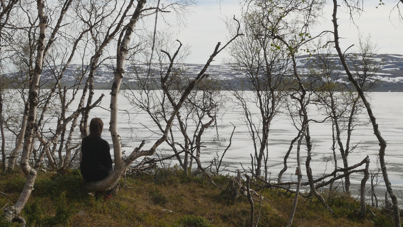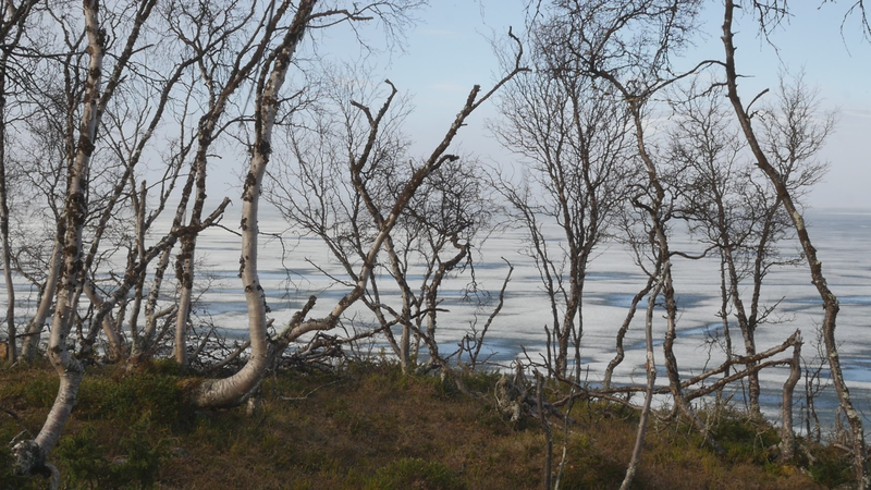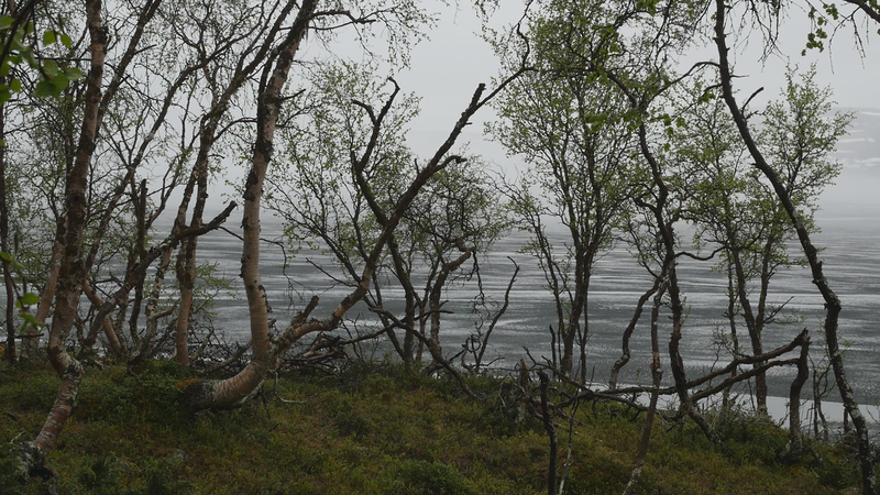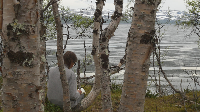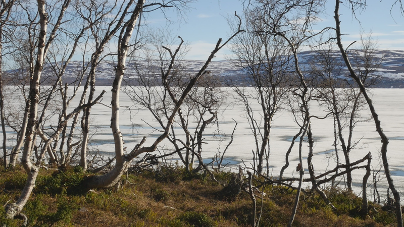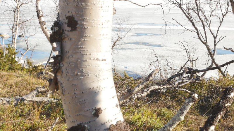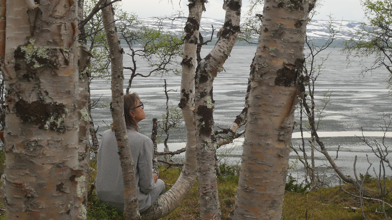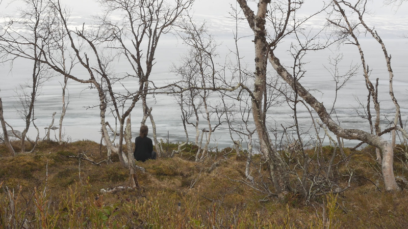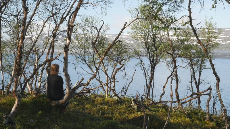Dearest Mountain Birch, I guess it is about time to try to explain to you what I have been doing, sitting here on your bent branch every morning and evening for almost two weeks. It is actually rather rude of me to do that without asking for your approval or consent or any kind of permission, but I did not know how to approach you in order to ask for your consent, and in many cases I usually choose to “just do it” rather than ask for permission, which often makes things unnecessarily complicated. I nevertheless sincerely hope that I did not offend you by my behavior, especially since I plan to continue with it for a few more days. I chose you of all the birches growing near or below the biological station because you live here on a small hill right by the lake, and have a beautiful view, on the shore. I did not realize that the lake functions like a cooler, so you and your immediate family here below are among the latest to grow out your leaves. Now, you too, have turned green and “dressed up” in small fresh leaves. This time of year, there is no real dusk or dawn, except in the middle of the night, perhaps, because we are here in the shadow of Saana fell so visiting you in the mornings and evenings is more of a change in the direction of the light, not its amount. Right now, the sky is clouded, though, so those usual shifts of light and shadow do not apply. And I am dressed in my ordinary grey clothes rather than my black “performance” outfit. When I say I have been visiting you that is not completely correct, because I have come down to sit on you and with you mainly in order to listen to the surrounding sounds. Now, for example, I can hear some birds, but on many occasions the traffic on the road between the mountain and the lake provides most of the sounds. Especially the huge trucks travelling to the Norwegian border can be heard from far away when approaching. I wonder what they transport, and where? Perhaps there is a harbor in Tromsø, or something. Besides listening to the sounds with you I often count my breaths slowly, trying to wind down and become present in the moment with you. Twenty-one breaths are my usual duration, a way of keeping track of time, approximately. That is of course a very brief instant in your temporal experience. Although birches do not live longer than 100 or 150 years, that is way more than most humans. And here, where the shift in light conditions is so extreme, with a long night-time, the winter, and a long day, the summer, rather than the constant fluctuation, your sense of time must be different, too. – I actually learnt a lot about your way of life from a biologist who kindly gave me a private lecture today. She explained, among other things, that there are two types of birch woods here, the maritime and the continental ones, and the whole ecosystem in them is different, as well as the form of the birches. Here, obviously, we are in the “maritime” type of wood, with blueberry shrubs [twigs] on the ground and the trunks of the birches relatively straight and singular – well, most of you are bent to some degree, but not as twisted and divided as the ones higher up on the slopes. The term “maritime” refers to the way the birch woods look on the Norwegian side, and even though Lake Kilpis is a lake, of course, the northwesterly winds come from the Arctic ocean, which is actually not that far from here, and bring in sea air. In both habitats one can distinguish the height of the snow from your trunks, because the dark brown lichen that decorate them do not like to live below snow level. That I learned already from the sign board on the nature path [trail]. Why some of you have a completely white bark while others are pale grey, I do not know, and it might be just a coincidence. There are two types of birches that have hybridized, the dwarf ones and the downy birches, and you can see the difference in the autumn, because the dwarf ones turn read rather than orange yellow. I realize I would really like to come and spend some time with you in the autumn, too, and to listen to the sounds of autumn together with you, like we now have listened to the sounds of spring. I want to thank you for your hospitality and generosity and sincerely hope that I have not been too much of a disturbance for you. I hope you can somehow sense my gratitude and appreciation, and I wish you all the best for the coming summer. Let us hope it will be a peaceful, invigorating and productive time for you. Take care!