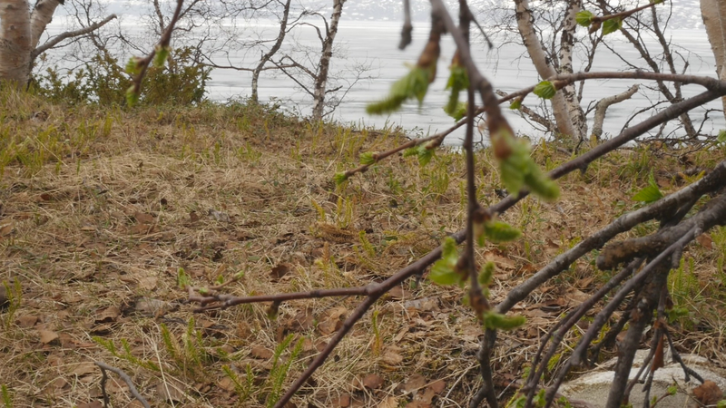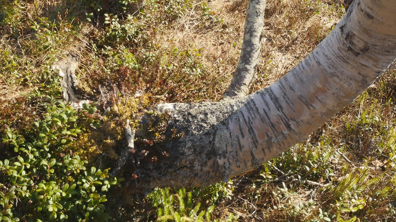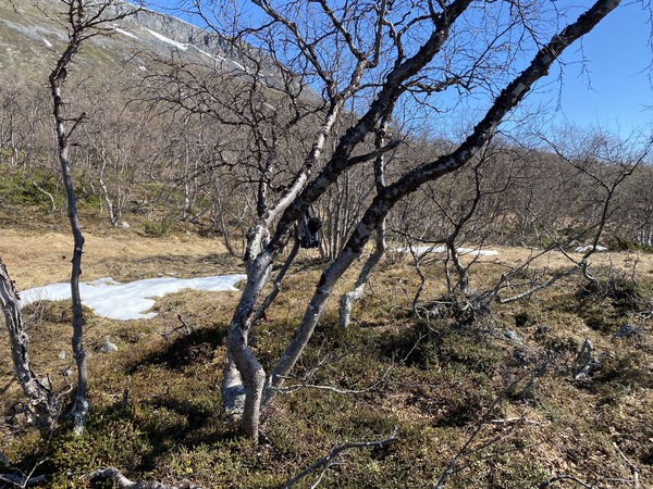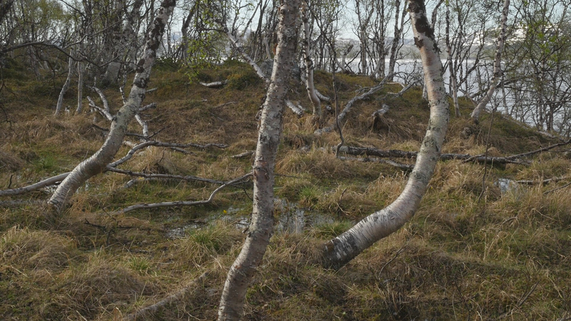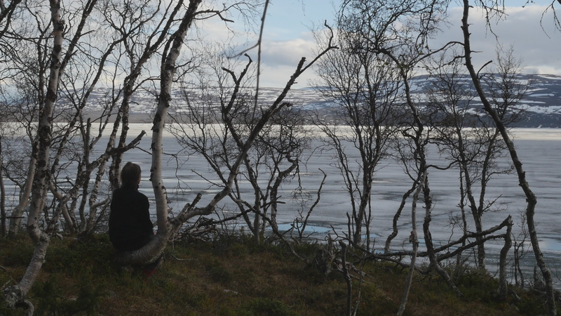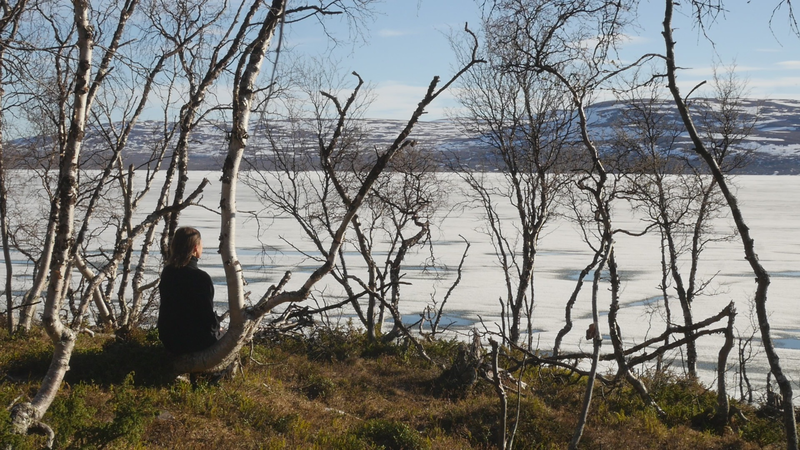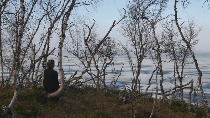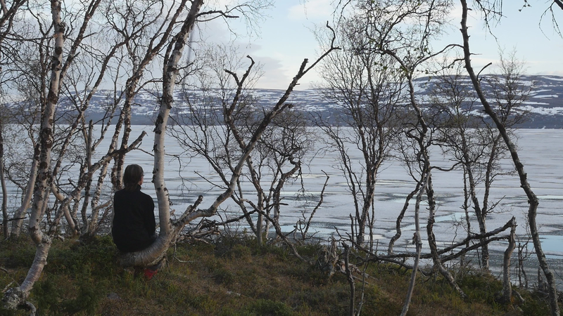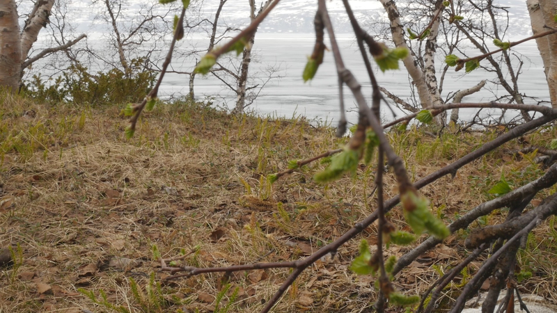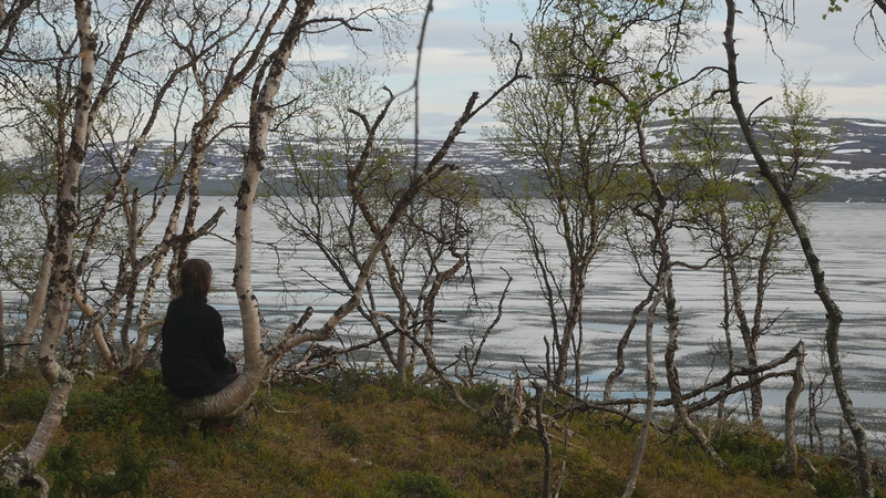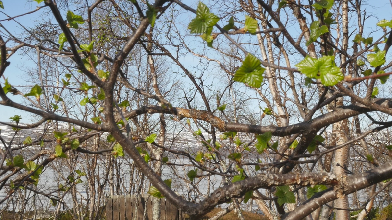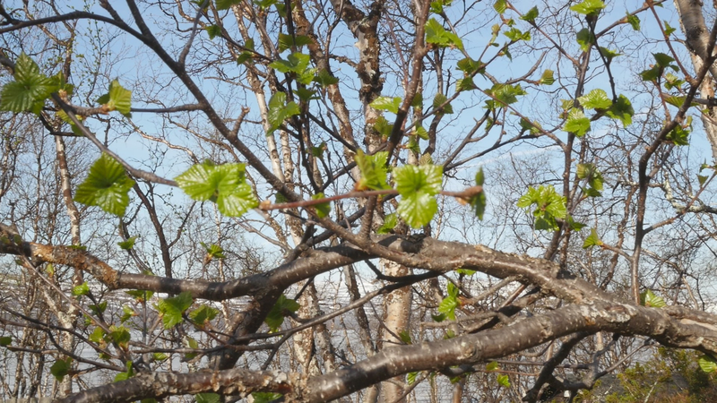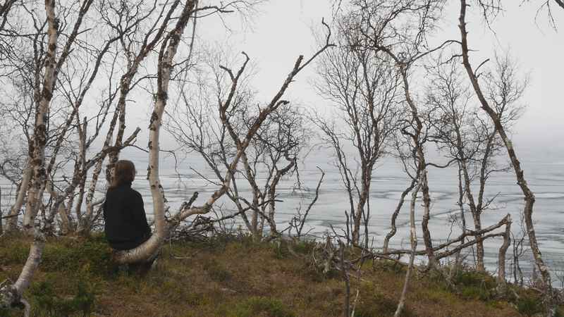 Dearest Mountain Birch, I guess it is about time to try to explain to you what I have been doing, sitting here on your bent branch every morning and evening for almost two weeks. It is actually rather rude of me to do that without asking for your approval or consent or any kind of permission, but I did not know how to approach you in order to ask for your consent, and in many cases I usually choose to “just do it” rather than ask for permission, which often makes things unnecessarily complicated. I nevertheless sincerely hope that I did not offend you by my behavior, especially since I plan to continue with it for a few more days. I chose you of all the birches growing near or below the biological station because you live here on a small hill right by the lake, and have a beautiful view, on the shore. I did not realize that the lake functions like a cooler, so you and your immediate family here below are among the latest to grow out your leaves. Now, you too, have turned green and “dressed up” in small fresh leaves. This time of year, there is no real dusk or dawn, except in the middle of the night, perhaps, because we are here in the shadow of Saana fell so visiting you in the mornings and evenings is more of a change in the direction of the light, not its amount. Right now, the sky is clouded, though, so those usual shifts of light and shadow do not apply. And I am dressed in my ordinary grey clothes rather than my black “performance” outfit. When I say I have been visiting you that is not completely correct, because I have come down to sit on you and with you mainly in order to listen to the surrounding sounds. Now, for example, I can hear some birds, but on many occasions the traffic on the road between the mountain and the lake provides most of the sounds. Especially the huge trucks travelling to the Norwegian border can be heard from far away when approaching. I wonder what they transport, and where? Perhaps there is a harbor in Tromsø, or something. Besides listening to the sounds with you I often count my breaths slowly, trying to wind down and become present in the moment with you. Twenty-one breaths are my usual duration, a way of keeping track of time, approximately. That is of course a very brief instant in your temporal experience. Although birches do not live longer than 100 or 150 years, that is way more than most humans. And here, where the shift in light conditions is so extreme, with a long night-time, the winter, and a long day, the summer, rather than the constant fluctuation, your sense of time must be different, too. – I actually learnt a lot about your way of life from a biologist who kindly gave me a private lecture today. She explained, among other things, that there are two types of birch woods here, the maritime and the continental ones, and the whole ecosystem in them is different, as well as the form of the birches. Here, obviously, we are in the “maritime” type of wood, with blueberry shrubs [twigs] on the ground and the trunks of the birches relatively straight and singular – well, most of you are bent to some degree, but not as twisted and divided as the ones higher up on the slopes. The term “maritime” refers to the way the birch woods look on the Norwegian side, and even though Lake Kilpis is a lake, of course, the northwesterly winds come from the Arctic ocean, which is actually not that far from here, and bring in sea air. In both habitats one can distinguish the height of the snow from your trunks, because the dark brown lichen that decorate them do not like to live below snow level. That I learned already from the sign board on the nature path [trail]. Why some of you have a completely white bark while others are pale grey, I do not know, and it might be just a coincidence. There are two types of birches that have hybridized, the dwarf ones and the downy birches, and you can see the difference in the autumn, because the dwarf ones turn read rather than orange yellow. I realize I would really like to come and spend some time with you in the autumn, too, and to listen to the sounds of autumn together with you, like we now have listened to the sounds of spring. I want to thank you for your hospitality and generosity and sincerely hope that I have not been too much of a disturbance for you. I hope you can somehow sense my gratitude and appreciation, and I wish you all the best for the coming summer. Let us hope it will be a peaceful, invigorating and productive time for you. Take care!