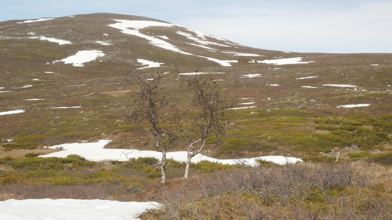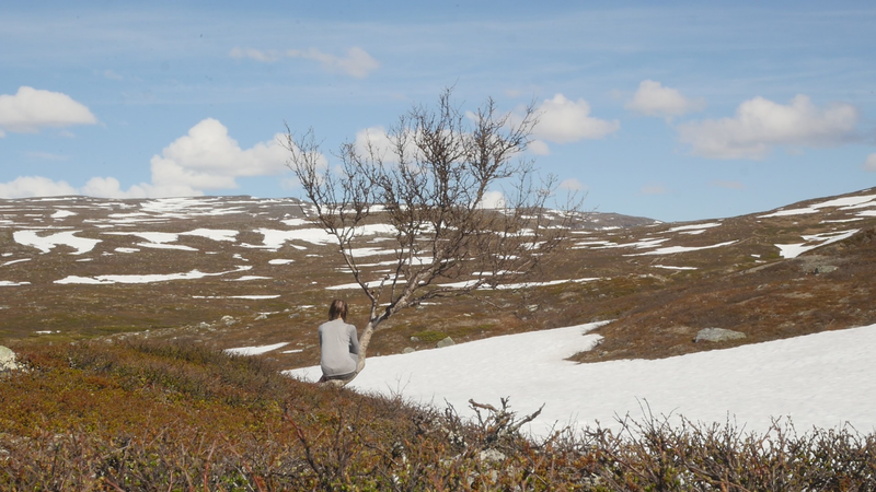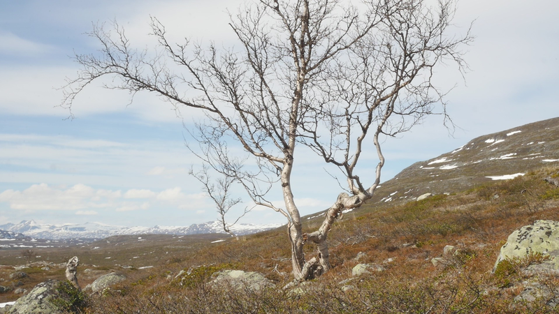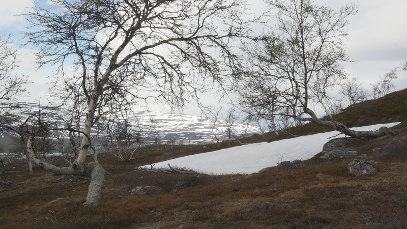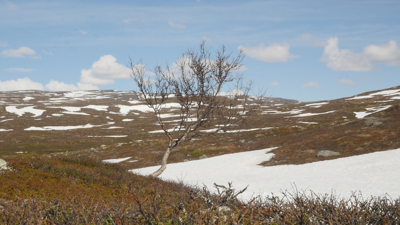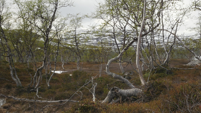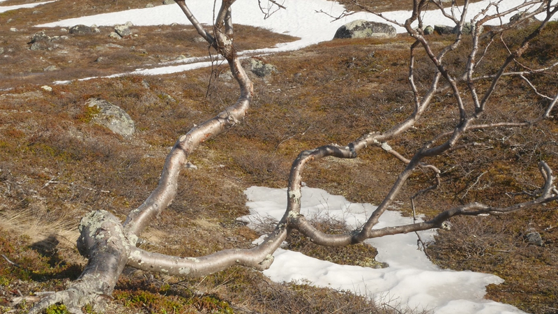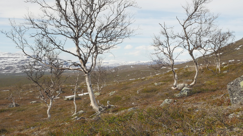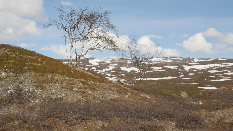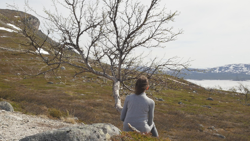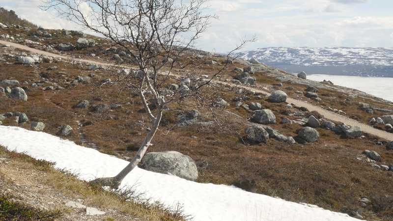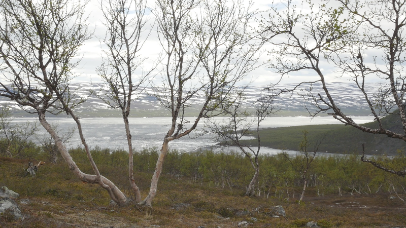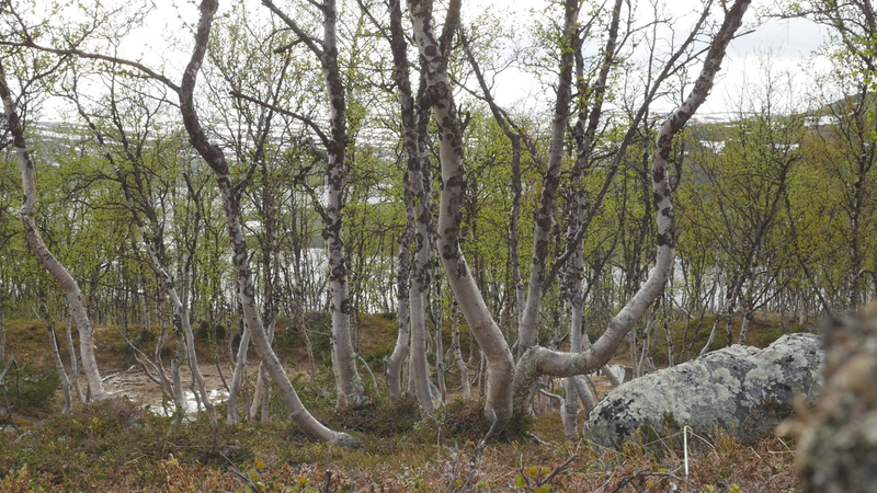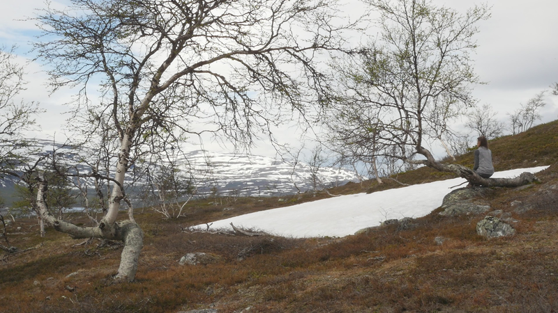 Dear Mountain Birch, thank you for allowing me to sit on the dead part of your trunk, the old part of you, here by the spring brook gushing into a small temporary lake in front of me. I chose you partly because of the sound of the brook, which is inspiring and lively, somehow invigorating by its constant movement. Another reason was that you were so clearly divided in parts. The old dead, or at least seemingly dead trunk lying on the ground and then the strong young fresh new trunk growing straight up, with its bright green leaves. We are here a little below the tree line I guess, or actually on the tree line but in the part where there are more trees than a few meters further up on the slope of Saana, where they are sparser, smaller and with more distance between them. I thought it would be easier to find an individual tree to address there, but although each one of the tiny small birches were fascinating in their own right, I did not feel invited to write to them, like here with you. This setting is more protected, of course, but I also feel that you are a better representative of your kin, or your family here, as part of a collective, rather than the ones higher up on the slope. I should also explain that I am sitting here on the western slopes of Saana, or I am actually not sure if this is not really the slope of the other mountain, Jeahkas, which I probably cannot spell correctly. In any case this is the high north, very near the Norwegian border, in the thumb of Finland and in the heartlands of Sapmi or sami country. There are reindeers walking everywhere and although the village is full of tourists from the southern part of Finland or then from Norway, in the north or west, it is important to acknowledge that I am a visitor and an outsider in this place, a recipient of the hospitality of the Sami people, and of the mountains and their representatives, today especially you, the mountain birches. Unlike the birches further south, you seem more like shrubs, because you often have several slender trunks from the same root. And you often bend in strange contortions, because of the wind or the weight of the snow or for some other reason. So, actually you are a good example of the difficulty of thinking of trees as individuals with distinct borders, and although that is exactly what I am trying to do, you force me to acknowledge that it is not really possible, at least not in your case. In many places coniferous trees, like pine trees or spruces, are the last ones to grow on the tree line up on the mountains. Here, however, the pines continue only about half-way into the ”arm” of Finland, and spruces give up even before that, and it is you, the small mountain birches that will climb up on the slopes and create the tree line. There are some small groups of spruces or pines in the area, but I hear that they are planted. You are the only native or indigenous trees and superbly important for all or most forms of life in this area, including humans, at least in the traditional ways of life. To be honest, I do not know so much about you, but some details are described on the sign boards marking the nature path [trail], like the dark brown lichen that grow on your trunks. One can read the level of the snow by their placement, because they grow only above snow level. I wonder what the greenish-yellowish lichen that grow further down on your trunk are called. At least further down, near the lake, they grow in profusion, and shimmer as if in a neon color in the evening or morning light, which here, this time of year, resembles afternoon light further south, because the sun does not set, of course. It hides behind the mountain, viewed from the village. Here, high on the slopes it shines all through the night, I suppose. – There, a raindrop falling in the meltwater lake, I can feel them on my head as well. Perhaps there will be a rainfall soon, or then it will remain a drizzle. In any case it might be a good idea to end this letter, before all the writing is washed away by raindrops. So, thank you for your hospitality, generosity and patience. And all the best for the future!