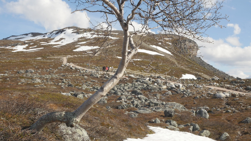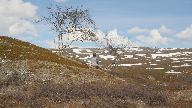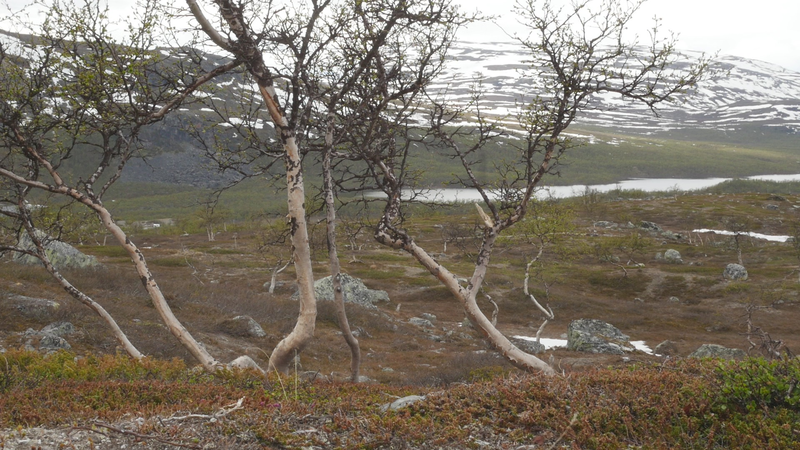 Dear Mountain Birch, thank you for allowing me to sit on the dead part of your trunk, the old part of you, here by the spring brook gushing into a small temporary lake in front of me. I chose you partly because of the sound of the brook, which is inspiring and lively, somehow invigorating by its constant movement. Another reason was that you were so clearly divided in parts. The old dead, or at least seemingly dead trunk lying on the ground and then the strong young fresh new trunk growing straight up, with its bright green leaves. We are here a little below the tree line I guess, or actually on the tree line but in the part where there are more trees than a few meters further up on the slope of Saana, where they are sparser, smaller and with more distance between them. I thought it would be easier to find an individual tree to address there, but although each one of the tiny small birches were fascinating in their own right, I did not feel invited to write to them, like here with you. This setting is more protected, of course, but I also feel that you are a better representative of your kin, or your family here, as part of a collective, rather than the ones higher up on the slope. I should also explain that I am sitting here on the western slopes of Saana, or I am actually not sure if this is not really the slope of the other mountain, Jeahkas, which I probably cannot spell correctly. In any case this is the high north, very near the Norwegian border, in the thumb of Finland and in the heartlands of Sapmi or sami country. There are reindeers walking everywhere and although the village is full of tourists from the southern part of Finland or then from Norway, in the north or west, it is important to acknowledge that I am a visitor and an outsider in this place, a recipient of the hospitality of the Sami people, and of the mountains and their representatives, today especially you, the mountain birches. Unlike the birches further south, you seem more like shrubs, because you often have several slender trunks from the same root. And you often bend in strange contortions, because of the wind or the weight of the snow or for some other reason. So, actually you are a good example of the difficulty of thinking of trees as individuals with distinct borders, and although that is exactly what I am trying to do, you force me to acknowledge that it is not really possible, at least not in your case. In many places coniferous trees, like pine trees or spruces, are the last ones to grow on the tree line up on the mountains. Here, however, the pines continue only about half-way into the ”arm” of Finland, and spruces give up even before that, and it is you, the small mountain birches that will climb up on the slopes and create the tree line. There are some small groups of spruces or pines in the area, but I hear that they are planted. You are the only native or indigenous trees and superbly important for all or most forms of life in this area, including humans, at least in the traditional ways of life. To be honest, I do not know so much about you, but some details are described on the sign boards marking the nature path [trail], like the dark brown lichen that grow on your trunks. One can read the level of the snow by their placement, because they grow only above snow level. I wonder what the greenish-yellowish lichen that grow further down on your trunk are called. At least further down, near the lake, they grow in profusion, and shimmer as if in a neon color in the evening or morning light, which here, this time of year, resembles afternoon light further south, because the sun does not set, of course. It hides behind the mountain, viewed from the village. Here, high on the slopes it shines all through the night, I suppose. – There, a raindrop falling in the meltwater lake, I can feel them on my head as well. Perhaps there will be a rainfall soon, or then it will remain a drizzle. In any case it might be a good idea to end this letter, before all the writing is washed away by raindrops. So, thank you for your hospitality, generosity and patience. And all the best for the future!