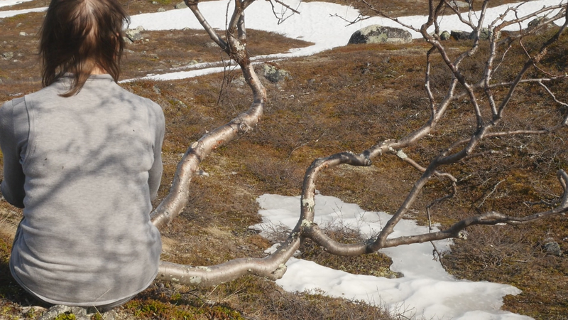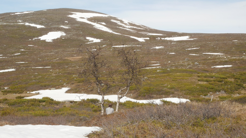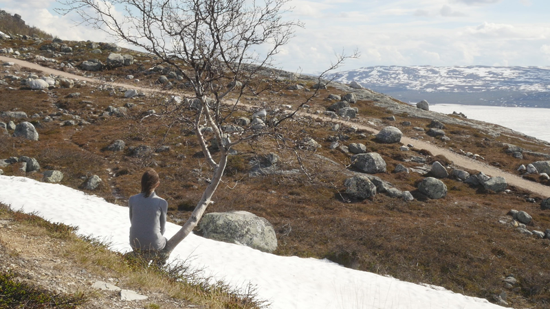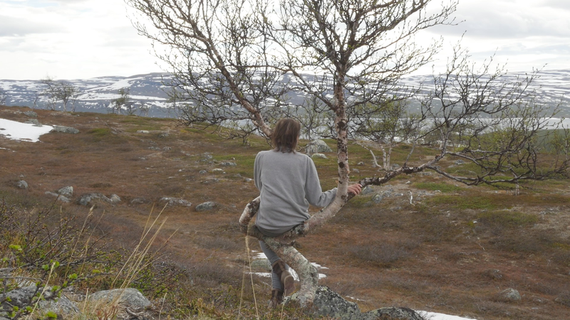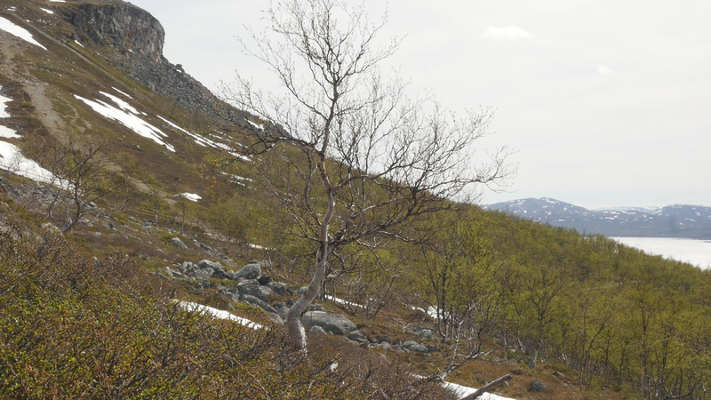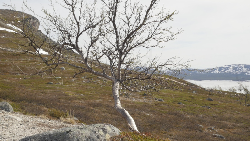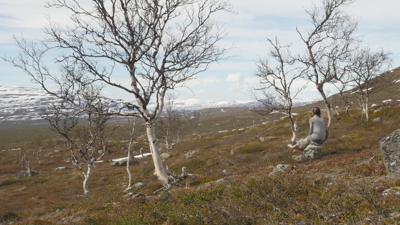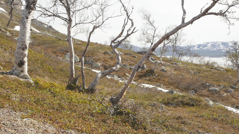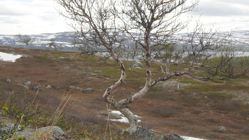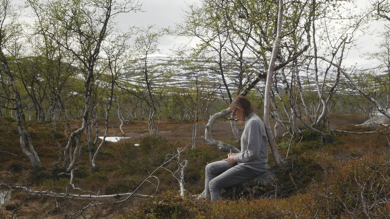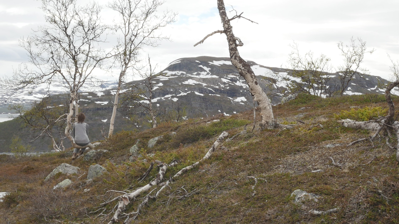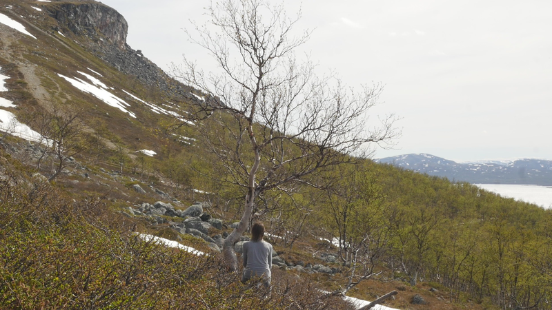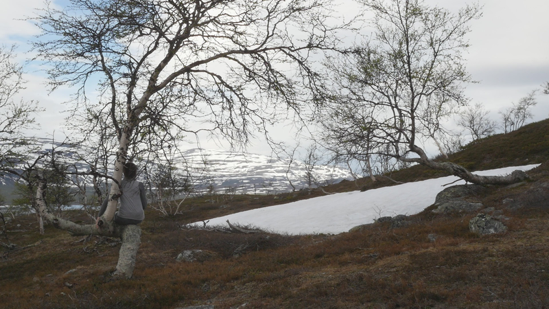 Dear Mountain Birch, thank you for allowing me to sit on the dead part of your trunk, the old part of you, here by the spring brook gushing into a small temporary lake in front of me. I chose you partly because of the sound of the brook, which is inspiring and lively, somehow invigorating by its constant movement. Another reason was that you were so clearly divided in parts. The old dead, or at least seemingly dead trunk lying on the ground and then the strong young fresh new trunk growing straight up, with its bright green leaves. We are here a little below the tree line I guess, or actually on the tree line but in the part where there are more trees than a few meters further up on the slope of Saana, where they are sparser, smaller and with more distance between them. I thought it would be easier to find an individual tree to address there, but although each one of the tiny small birches were fascinating in their own right, I did not feel invited to write to them, like here with you. This setting is more protected, of course, but I also feel that you are a better representative of your kin, or your family here, as part of a collective, rather than the ones higher up on the slope. I should also explain that I am sitting here on the western slopes of Saana, or I am actually not sure if this is not really the slope of the other mountain, Jeahkas, which I probably cannot spell correctly. In any case this is the high north, very near the Norwegian border, in the thumb of Finland and in the heartlands of Sapmi or sami country. There are reindeers walking everywhere and although the village is full of tourists from the southern part of Finland or then from Norway, in the north or west, it is important to acknowledge that I am a visitor and an outsider in this place, a recipient of the hospitality of the Sami people, and of the mountains and their representatives, today especially you, the mountain birches. Unlike the birches further south, you seem more like shrubs, because you often have several slender trunks from the same root. And you often bend in strange contortions, because of the wind or the weight of the snow or for some other reason. So, actually you are a good example of the difficulty of thinking of trees as individuals with distinct borders, and although that is exactly what I am trying to do, you force me to acknowledge that it is not really possible, at least not in your case. In many places coniferous trees, like pine trees or spruces, are the last ones to grow on the tree line up on the mountains. Here, however, the pines continue only about half-way into the ”arm” of Finland, and spruces give up even before that, and it is you, the small mountain birches that will climb up on the slopes and create the tree line. There are some small groups of spruces or pines in the area, but I hear that they are planted. You are the only native or indigenous trees and superbly important for all or most forms of life in this area, including humans, at least in the traditional ways of life. To be honest, I do not know so much about you, but some details are described on the sign boards marking the nature path [trail], like the dark brown lichen that grow on your trunks. One can read the level of the snow by their placement, because they grow only above snow level. I wonder what the greenish-yellowish lichen that grow further down on your trunk are called. At least further down, near the lake, they grow in profusion, and shimmer as if in a neon color in the evening or morning light, which here, this time of year, resembles afternoon light further south, because the sun does not set, of course. It hides behind the mountain, viewed from the village. Here, high on the slopes it shines all through the night, I suppose. – There, a raindrop falling in the meltwater lake, I can feel them on my head as well. Perhaps there will be a rainfall soon, or then it will remain a drizzle. In any case it might be a good idea to end this letter, before all the writing is washed away by raindrops. So, thank you for your hospitality, generosity and patience. And all the best for the future!