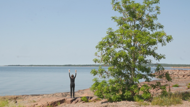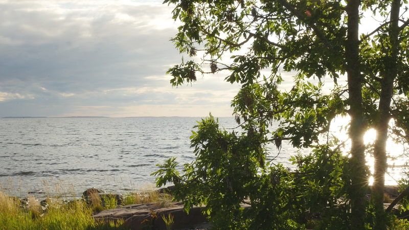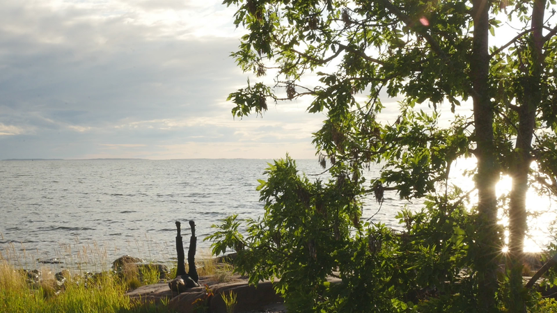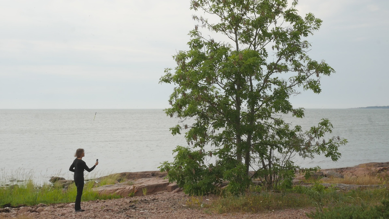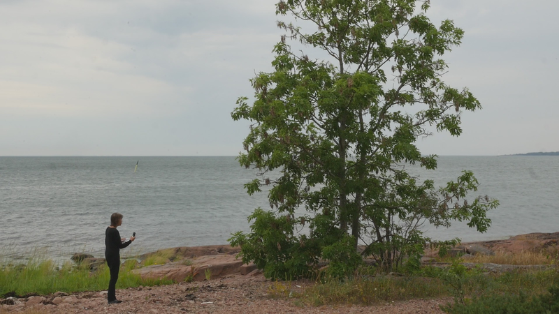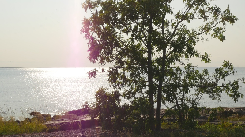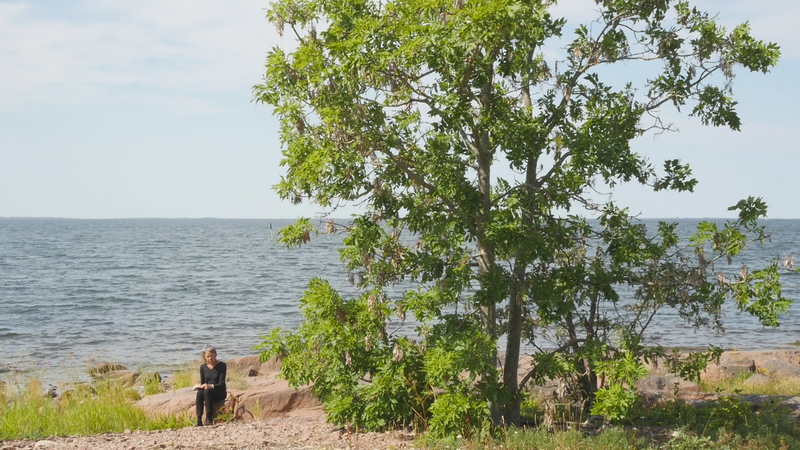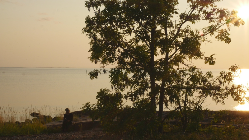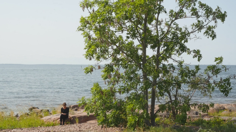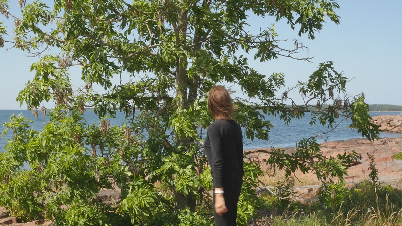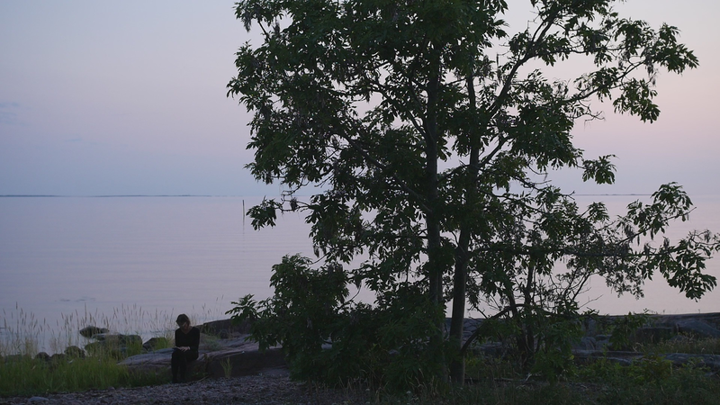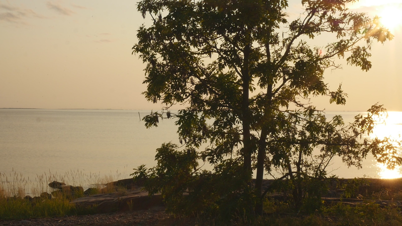 It is eleven pm, almost half an hour past sunset, although the sky and the sea still shine with a pale violet shimmer. The Eckerö ferry from Grisslehamn has arrived, although now most of the cars have already driven past, peace returns. A strange bird sounds behind me, and there are still two cars on the quay, all else is calm. – I looked at the recorded material and was surprised of the small abrupt displacements of the images in the afternoon – obviously I have been careless while placing the camera. Otherwise, the material looked fine. The proportions between the tree, or you, and the human, or me, are quite acceptable. I look very small on the rock next to you, although you are rather small for a tree. How things look in the image and how they appear in reality are two very different things. The same goes for the experience of coming to sit next to you every other hour for a day and trying to write to you, with you – that is something else than what can be seen in the image, and also the effect, feeling and mood created by the images and by the video formed of them. If I will add this text that I am writing, if I for instance read it and record it and attach it as a voice-over to the video, it will change everything again. Time will tell. Now I simply want to say goodbye at least for tonight and thank you for our collaboration during the day. I don’t know if you experienced it as a collaboration or anything at all. For me, however, it has been important to sit here next to you. And I think I will remember this day for a long time –regardless whether I find something worth pondering in these notes. Thus, simply: Thank you. And Good Night!