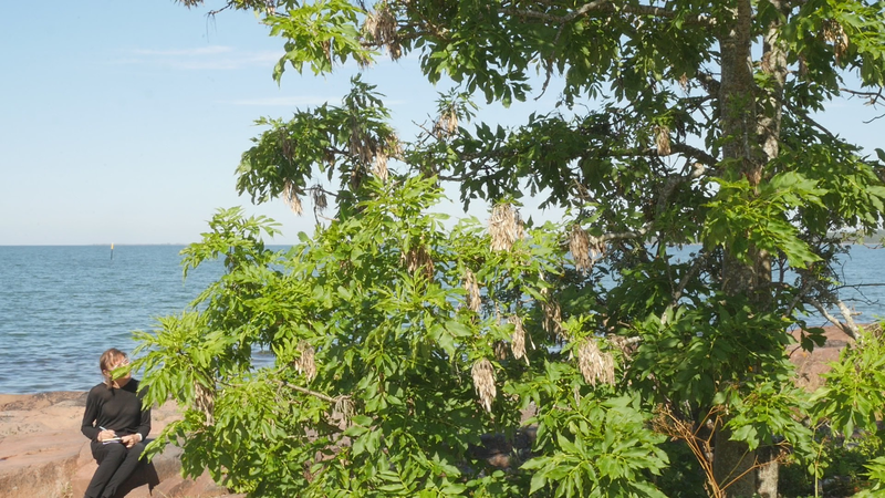 Dear Ash tree pleased to meet you here next to Eckerö mail bridge when the sun is shining from a clear blue sky and the sea is lapping softly against the rock behind me. I have admired you during my walks down to the shore, because you grow so close to the water’s edge and are so filled with last year’s fruits or seeds with their dry wings. Based on them I assume you are a female ash tree, for you can be either female or male, although you apparently can shift, too. And even have some branches of the opposite gender. Fascinating! What I wanted to talk with you about is actually trauma, and how to deal with it in various ways, for example by creating autobiographical performances. And in case one does that, or uses a traumatic experience as material for an artwork in general, how to do that without reliving the trauma or perhaps even reenforcing it? I am pondering on that due to a presentation by Caitlin Main, which Göze Saner responded to by focusing on repetition. As a plant or a tree, to be more exact, you are in the process of creating yourself all the time, and as Michael Marder among others have suggested you are an artist who creates yourself as your artwork. That has nothing to do with trauma as such. The reason I thought about you was I was struck by an old story, which is included for instance in the Metamorphoses by Ovid, and which is much older and exists in several variations, about a girl who became a tree. The best-known version is about Daphne and Apollon, where the nymph Daphne tried to escape the approaches of the god Apollon and ran away. And when she could not run any longer and came to the shore, she asked her father the river god for help, and he transformed her into a laurel tree. One could ask what kind of father transforms his daughter into a tree, but that is another question. Anyway, ever since the laurel tree has been associated with the god Apollon, and we speak of poet laureate or a poet crowned with a laurel wreath, a kind of award for poets. To be crowned with a laurel wreath because one chases young girls against their will might seem strange, but is apparently not that rare, as we learned in the context of the ‘me too’ movement. You are not a laurel tree, of course, but an ash tree; I nevertheless realized that I cannot know whether you, too, really are a girl turned into a tree. Or whether you have grown into a tree due to a traumatic experience. It might seem safer to live one’s life as a tree, although I doubt that it is true; to live as a tree involves many risks and first of all you cannot run away as a tree. Or perhaps you are only disguised as a tree? What if you are such a skilful actor that I simply cannot tell the difference between your performance and a real tree? Or perhaps an actor with such skills that you really have transformed into a tree? They say that we become what we pretend to be in the end; pretending is a way of learning. And repeating, of course. If one repeats something long enough it turns into a habit, a part of oneself. It could, however, be rather scary to suddenly transform into the person or shape one is impersonating. Is that what happens when you relive a trauma, that what you remember or fantasize or play with suddenly becomes real and bloody serious?