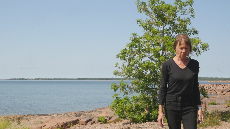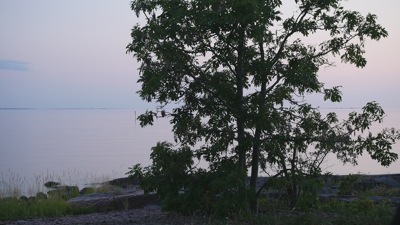 It is eleven pm, almost half an hour past sunset, although the sky and the sea still shine with a pale violet shimmer. The Eckerö ferry from Grisslehamn has arrived, although now most of the cars have already driven past, peace returns. A strange bird sounds behind me, and there are still two cars on the quay, all else is calm. – I looked at the recorded material and was surprised of the small abrupt displacements of the images in the afternoon – obviously I have been careless while placing the camera. Otherwise, the material looked fine. The proportions between the tree, or you, and the human, or me, are quite acceptable. I look very small on the rock next to you, although you are rather small for a tree. How things look in the image and how they appear in reality are two very different things. The same goes for the experience of coming to sit next to you every other hour for a day and trying to write to you, with you – that is something else than what can be seen in the image, and also the effect, feeling and mood created by the images and by the video formed of them. If I will add this text that I am writing, if I for instance read it and record it and attach it as a voice-over to the video, it will change everything again. Time will tell. Now I simply want to say goodbye at least for tonight and thank you for our collaboration during the day. I don’t know if you experienced it as a collaboration or anything at all. For me, however, it has been important to sit here next to you. And I think I will remember this day for a long time –regardless whether I find something worth pondering in these notes. Thus, simply: Thank you. And Good Night!