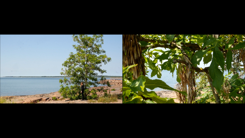 The wind has abated, the sun still shines brightly but does not warm at all any longer, it is evening. It is nine pm, everything calms down. There are people around, of course, but they speak softly, aware of the approaching evening. This is my next to last visit to you, at least for today, this day with the ash tree or whatever it should be called. And it is perhaps about time to tell you a little what I am actually doing. Yes, I am writing in a notebook, a diary of sorts, despite sometimes speaking directly to you as well. And not only that, I record this writing and sitting on the rock next to you on video, and you are the “main character” in the image. Therefore, I cannot avoid the issue of art as representation. I represent an image of you, even though video turns it into a display which is an appearance and an action, a performance, a process. As an image, however, this will be one more image in the long chain of images of individual trees in the history of art, where the tree has stood for life or nature or spirituality, growth, all kinds of good things, and sometimes time as well. Contemporary artists have defied or criticized this legacy by turning trees upside down or by dragging dead trees into galleries and museums or by other similar strategies, described for example by Giovanni Aloi in his book Why Look at Plants?. My making an image of an ash tree on the shore and sitting down next to it could be interpreted as an uncritical repetition of the romantic tradition without any kind of conceptual idea or point. And I find it quite difficult to defend myself against that accusation. I do nevertheless hope to be able to turn the gaze of humans to you, to look at you in a new way, not as a romantic symbol for life or time or the cycles of nature or something else, but as an exciting, fascinating, living being, which we tend to overlook and even now only get to see a small part of in the image. Partly your crown does not fit in fully in the horizontal image, and above all, most of you is hidden below ground, invisible for the camera. Right now, you are actually standing in backlight, as a silhouette with the sun shining low behind you, and therefore not much of you can really be seen. Basically this is the principle - I try to lure the viewer to look at you, not at the visual conventions of Western art nor the colonialist fraudulence of landscape art or something else… Whether it works, well, that I cannot know yet…