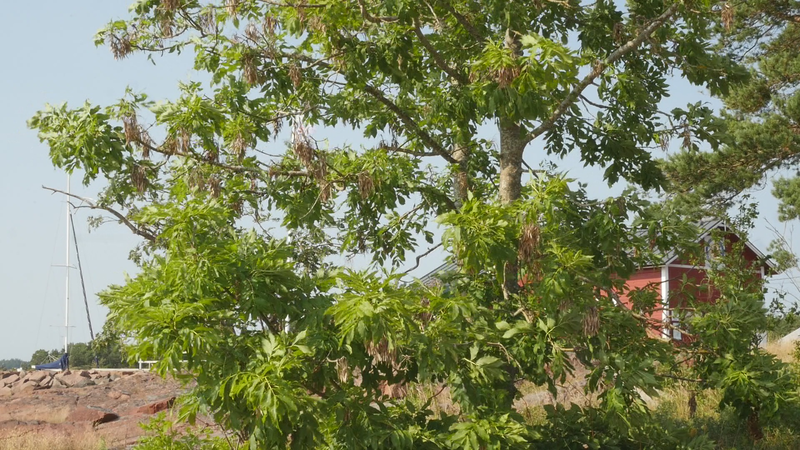 The sun is warming, the wind has abated, it is nine am. The sea is blue behind me, the sky is blue with white stripes of clouds. The first tourist cars are parking on the post quay. The waves are lapping like before, while the flag shows me that the wind is no longer blowing. – I read on the internet about ash trees and found out to my surprise that you are endangered in Sweden and in many parts of Europe. The reason is some kind of fungal disease that kills ashes. Fortunately, it has not affected you nor the other ashes in the area. On the contrary, you all seem very safe and sound and green. I also read that you are actually of the same family as lilacs, which seems slightly absurd. I cannot think of one trait in common, whether in appearance or mode of growth. Although family relations can be strange at times. Ashes are not very common in the Helsinki area and higher up near Hämeenlinna they hardly exist at all. In my childhood experiences ashes belong to Lubondas, in the archipelago between Porvoo and Loviisa, and later in other places on the coast. I once brought with me two ash plants from Kökar and planted them in Koivumäki, near Hämeenlinna. One of them survived and is now a tall tree, not as tall as you, but almost. Funny to call you a tall tree, because compared to ashes in general you are rather small, and probably fairly young as well. Although, let’s not talk about age …