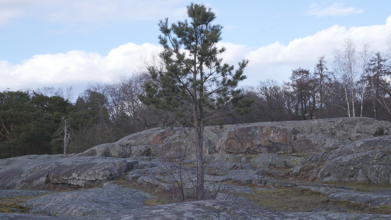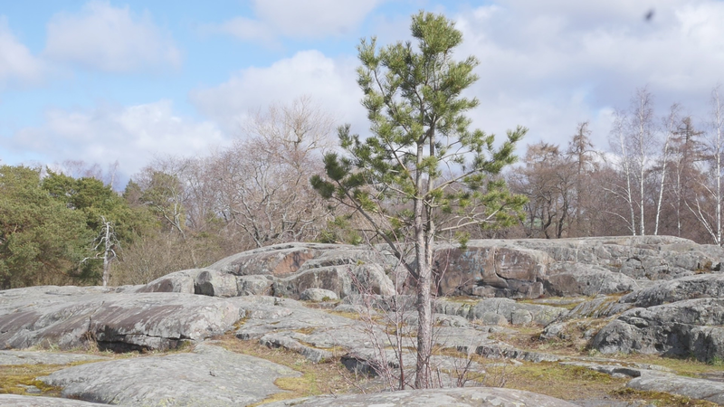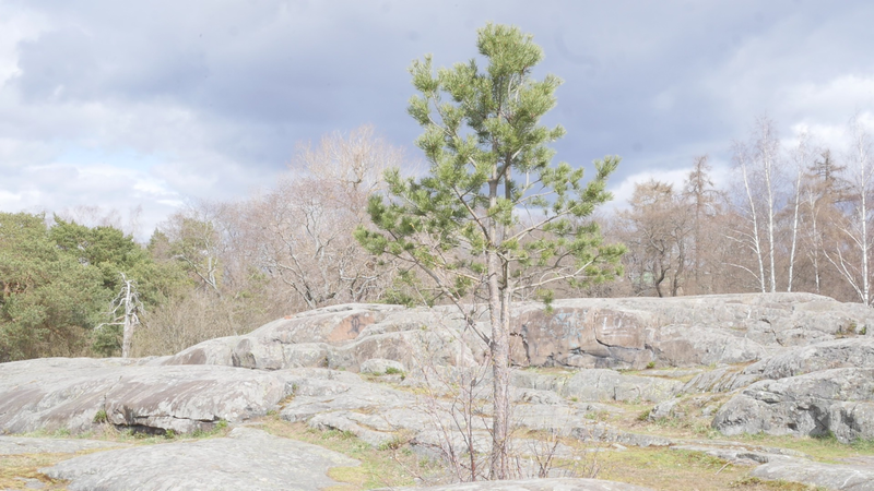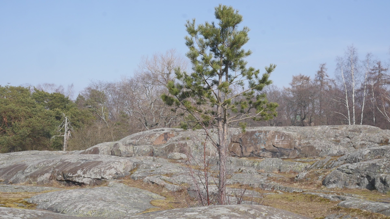 Kära tall, det är roligt att ses igen; en vecka har gått sen jag var här hos dig senast, och våren känns definitivt närmare. Det är visserligen kallt fortfarande, men just nu när solen skiner, känns det som vår. Småfåglar, och andra fåglar för den delen också, för all slags oväsen och ger tillkänna att de är här. Det omisskännliga ljuden av gäss hörs också. Du svajar i vinden, och det gör kameran också – jag förstår inte hur den kan vara så känslig. Att du är känslig för vinden är ganska självklart, för du växer ju mitt på berget – hur djupt du än försökt slingra ner dina rötter har de i alla fall inte spridits särskilt vitt, så det är säkert inte speciellt stabilt för dig. Men det här är inte någon riktig vind, bara för några dagar sedan blåste det hårt. Men, du ser ut att må bra i alla fall. Människorna här i trakten, och överallt på planeten, misstänker jag, är just nu oroliga för Covid-19 pandemin, en virussjukdom som angriper lungorna och smittar från människa till människa, och synbarligen också från och till vissa djur, som kattdjur. En tiger i ett zoo hade nyss fått smittan, skrevs det. Nyheterna handlar för det mesta om pandemin, och den ekonomiska krisen den lett till. Och jag märker att det är det jag själv läser och letar efter i nyheterna- Men ur din synpunkt finns det ju många viktigare saker att fundera över, som t.ex. vinden, eller regnen, eller värmen och när et är dags att börja satsa för fullt på nya skott. Eftersom du har kvar dina ”blad”, dina barr från ifjol, och inte byter dem varje år som t.ex. lärkträdet, är det kanske inte så dramatiskt. Jag vet faktiskt inte hur tallar brukar göra – granar har tydliga ljusgröna skott på våren och försommaren. Men när jag tänker efter minns jag inte ifall jag sett tallar ha något liknande. Hur som helst, du ser i alla fall helt oberörd ut, i en vintermundering kunde man kanske säga. Men det kan ju vara på grund av din särskilt utsatta position, här uppe på berget finns det inte vindskydd från något håll. Den lilla björken – jag tror det är en björk även om det ser ut som en buske eller egentligen ett större ris, som växer i samma klippskreva som du, är ännu mycket lägre än du så den skymmer inte ljuset från dina barr även när den har blad. Nu är den helt kal, men den har tydliga knoppar. Och om det är en björk – och jag tror det är det på grund av de rödbruna grenarna (paradoxalt nog) så är det en törstig granne. Om du inte ser till att suga åt dig den fukt du behöver, kommer den nog att dricka upp allt som finns så fort den får ut sina blad. Kanske ni delar på ett mycelium eller samarbetar på något annat sätt, vad vet jag? När jag ser närmare efter märker jag att björken har små ”stubbar” där den kapats av någon trädgårdsmästare som inte tyckte att det behövdes björkar just här. Vem vet om det var du eller björken som var här först, men det verkar som om parkvårdarna har tyckt att det är OK med en liten tall här…